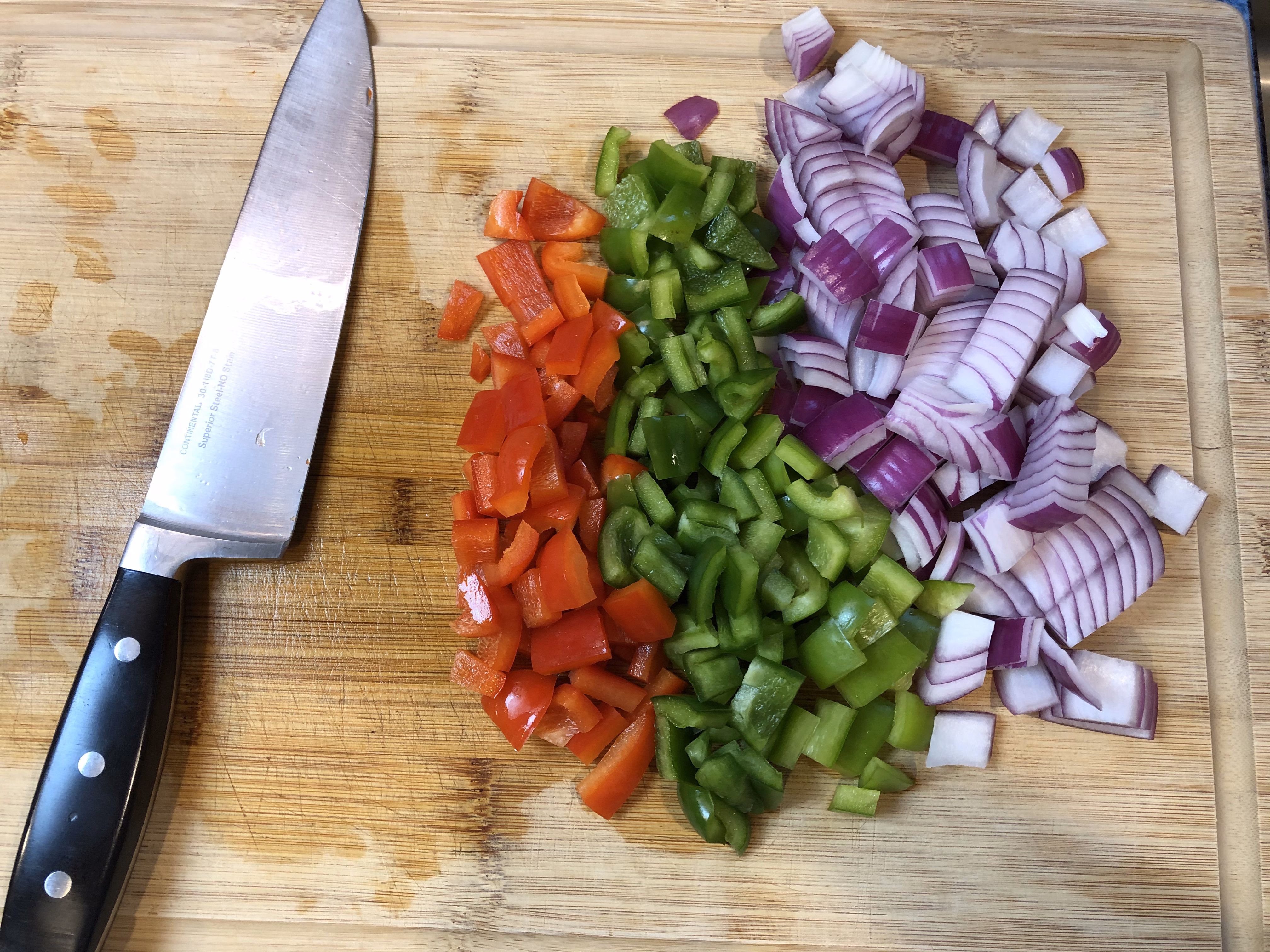 Preheat oven to 425°F. Chop the vegetables and chicken into 1" chunks.