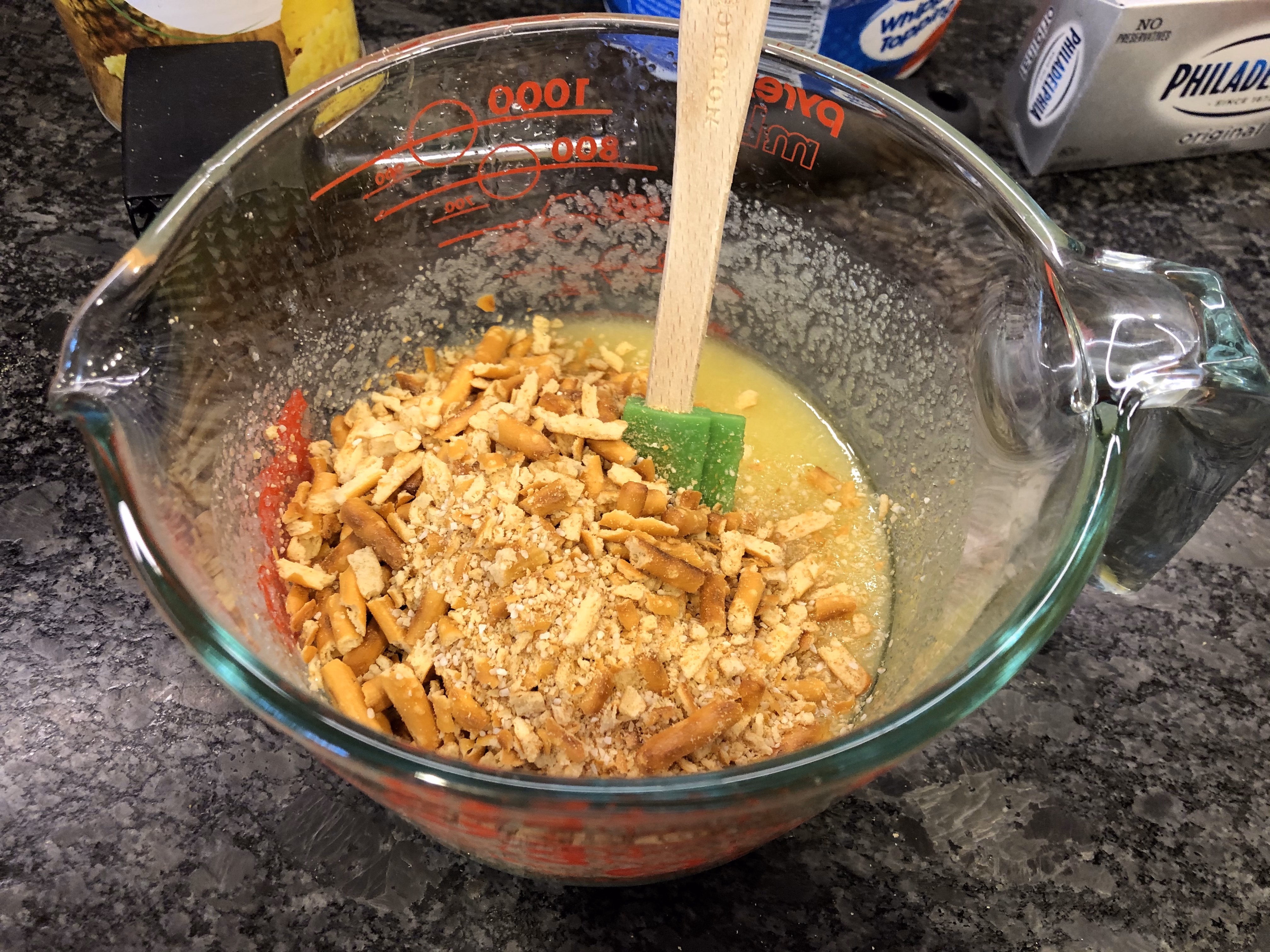 This is such a fun salad to serve, and eat! With it's pineapple creamy base, and the crunchy sugared pretzel bits sprinkled over the top, you will be surprised at just how yummy this unique side dish is. You can mix the pretzel pieces in just before serving, but we love to serve them on top. The sweet and salty combination is unreal. Give it a try!