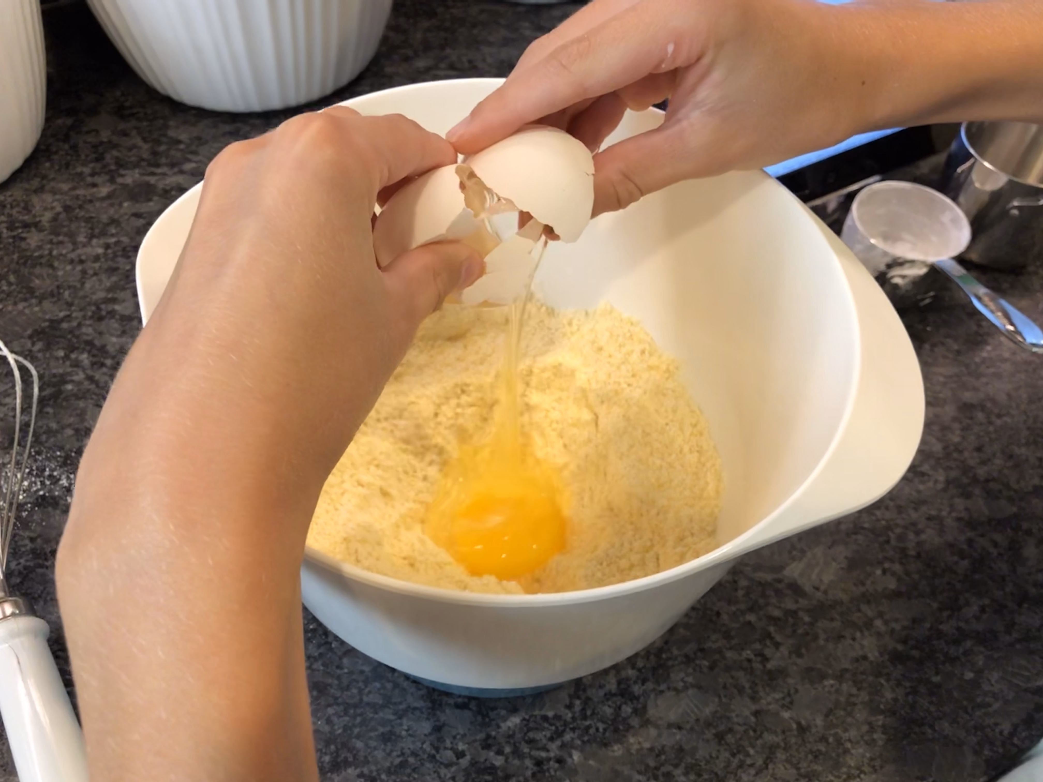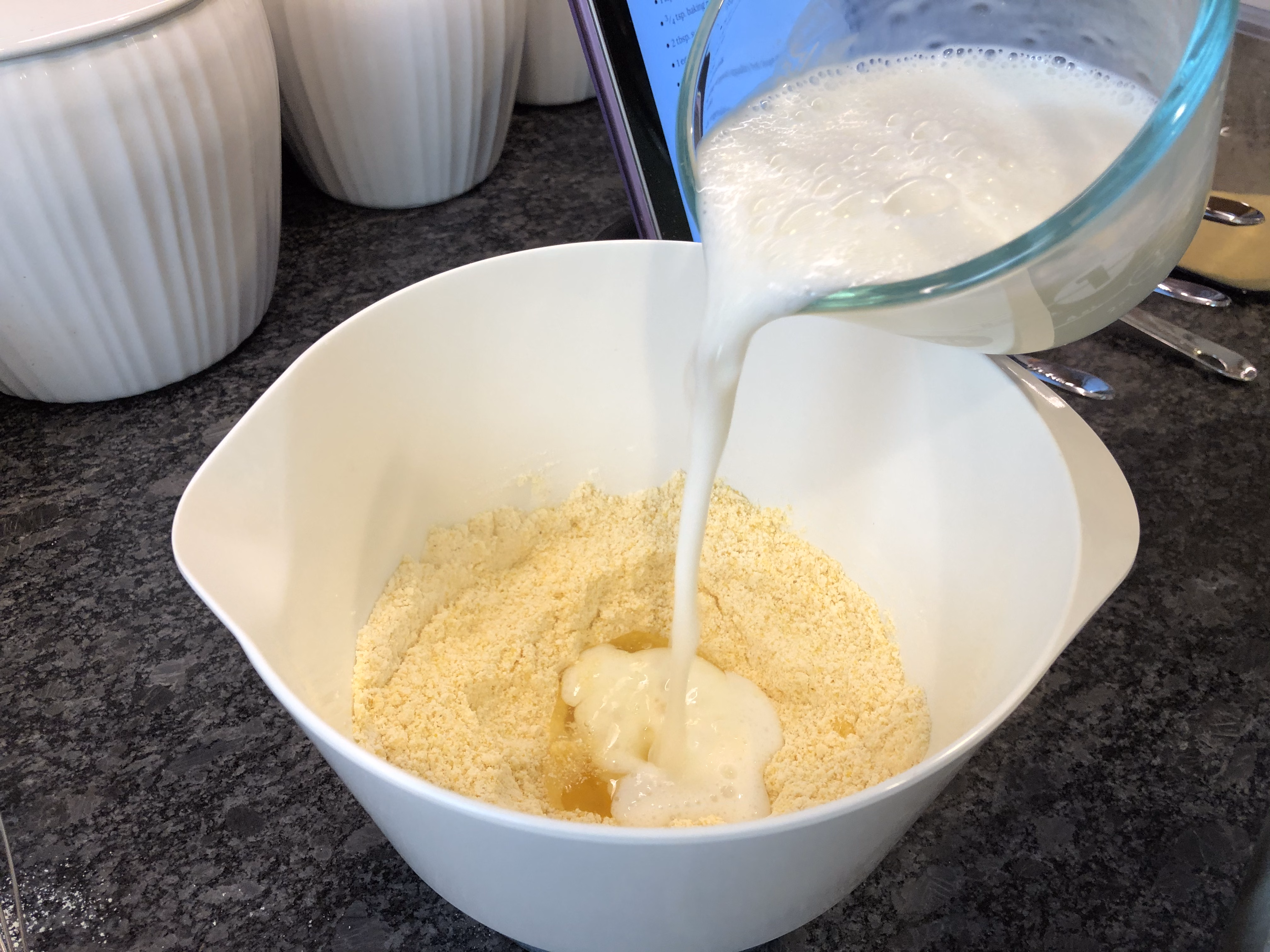 Make a well in the center of the dry ingredients. Add 1 egg and 1 cup buttermilk. Beat the egg and buttermilk together, then whisk into dry ingredients. Set aside.