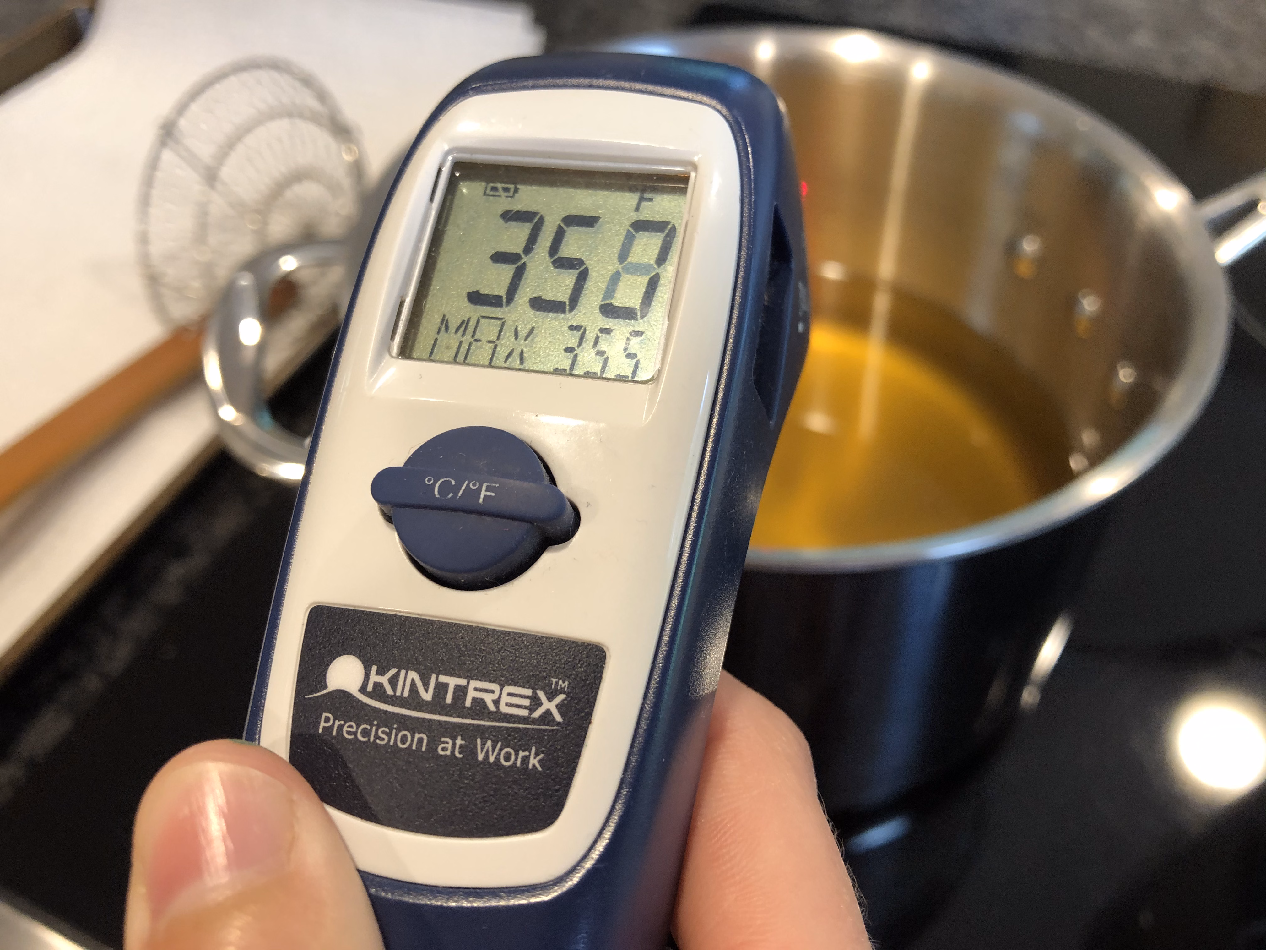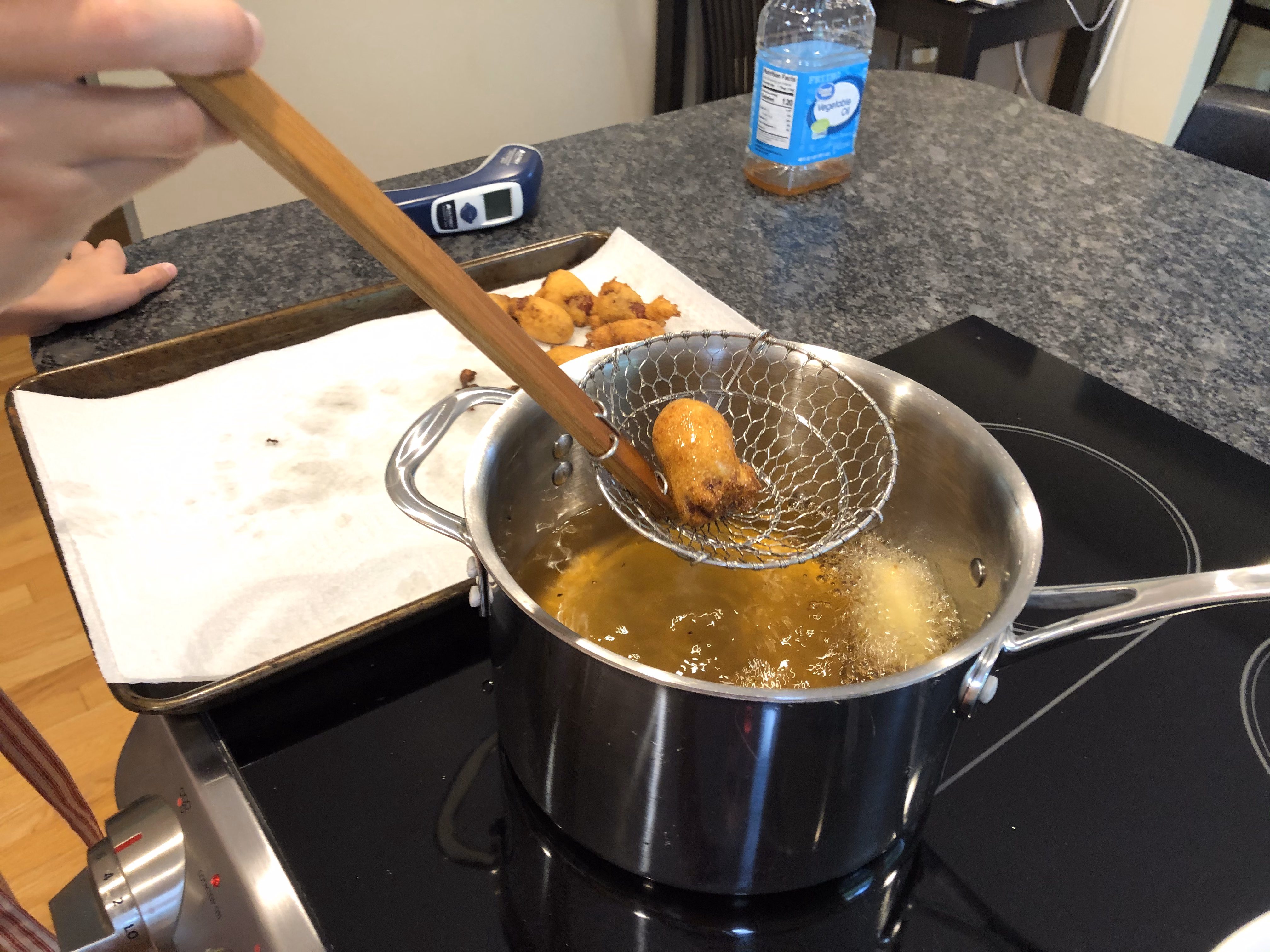 Once they have cooked in the hot oil a few minutes, remove from oil and drain on prepared pan with paper towels. Continue rolling, dipping, then frying in batches of 3 until you've done them all. Be sure to constantly check your oil temperature and adjust accordingly to keep it around 350°F.