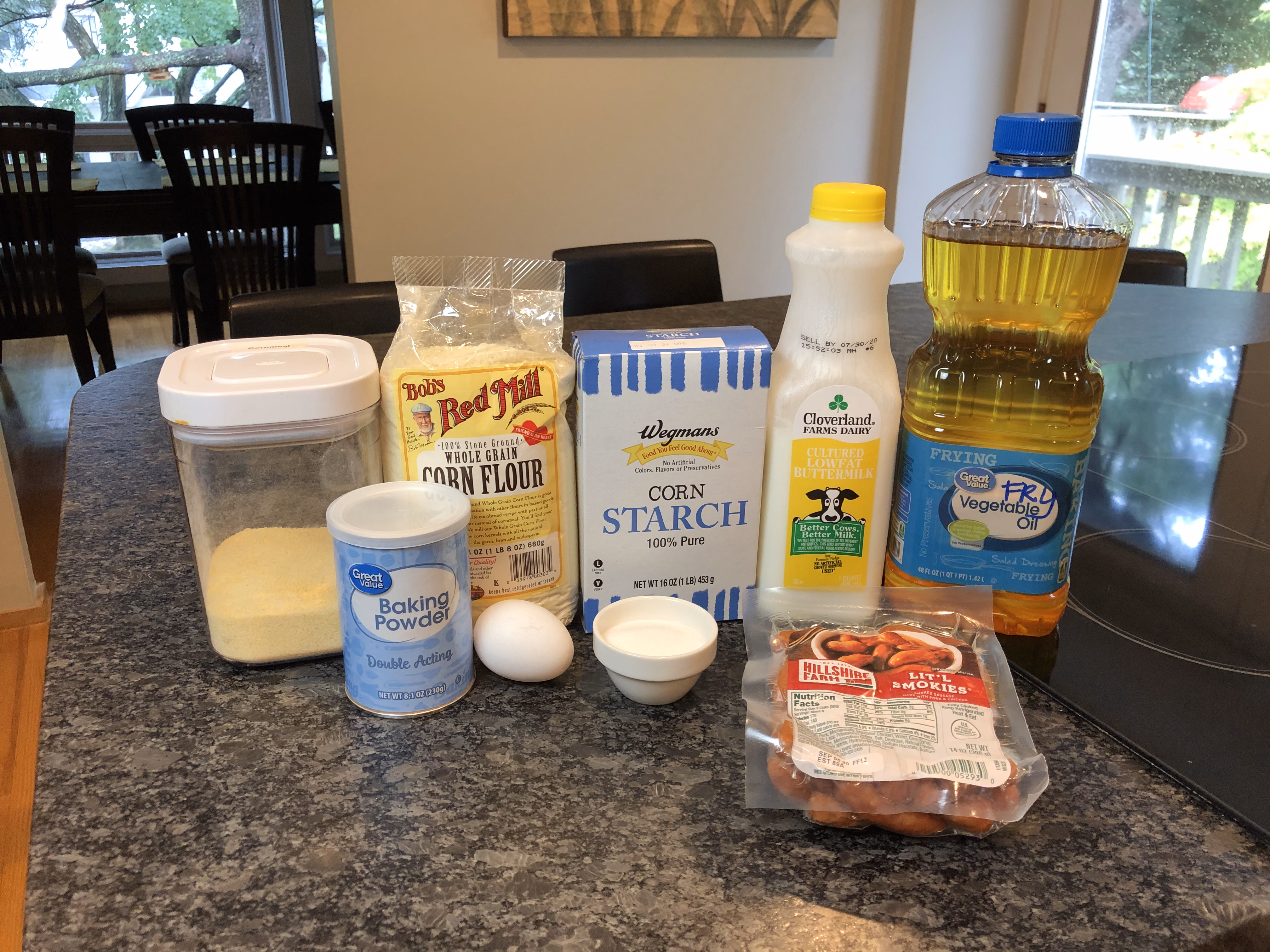 Gather your ingredients. You will need cornmeal, corn flour, corn starch (starting to see a theme here? ?), buttermilk, an egg, sugar, baking powder, vegetable oil, and small smoked sausages. You could also use regular hot dogs and just cut them into thirds. We love the flavor of the smokies!