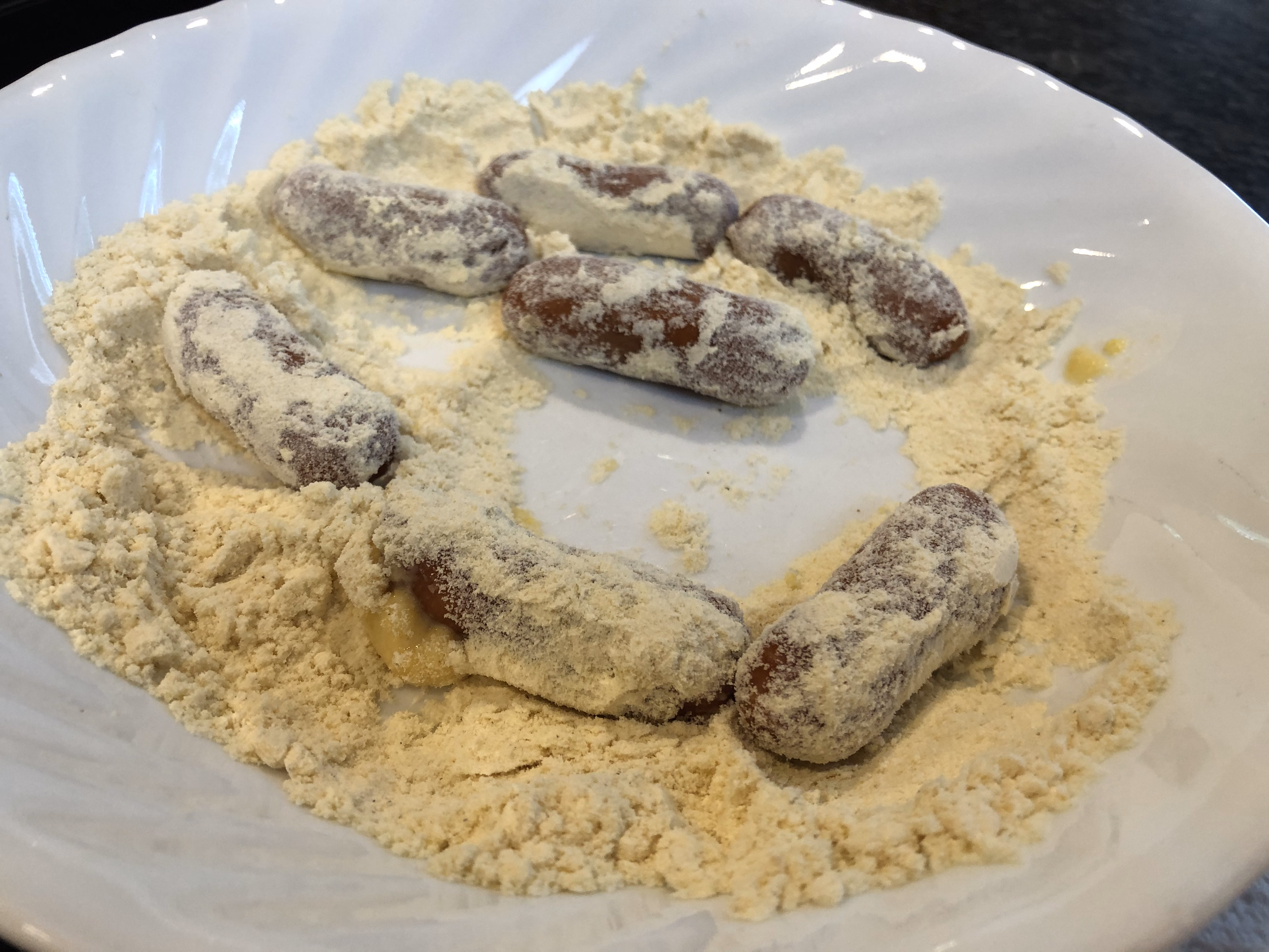 In a large pot or saucepan, heat 2 quarts of oil to 350°F. Roll the sausages in some corn flour, then dip in the batter and immediately place into the hot oil. We have found that coating them first in the dry flour also allows the batter to stick better. If you are having a hard time with the batter not staying on the hot dogs, add a little more buttermilk if it's too thick, or a little more corn flour if it's too thin. You want just the right consistency.