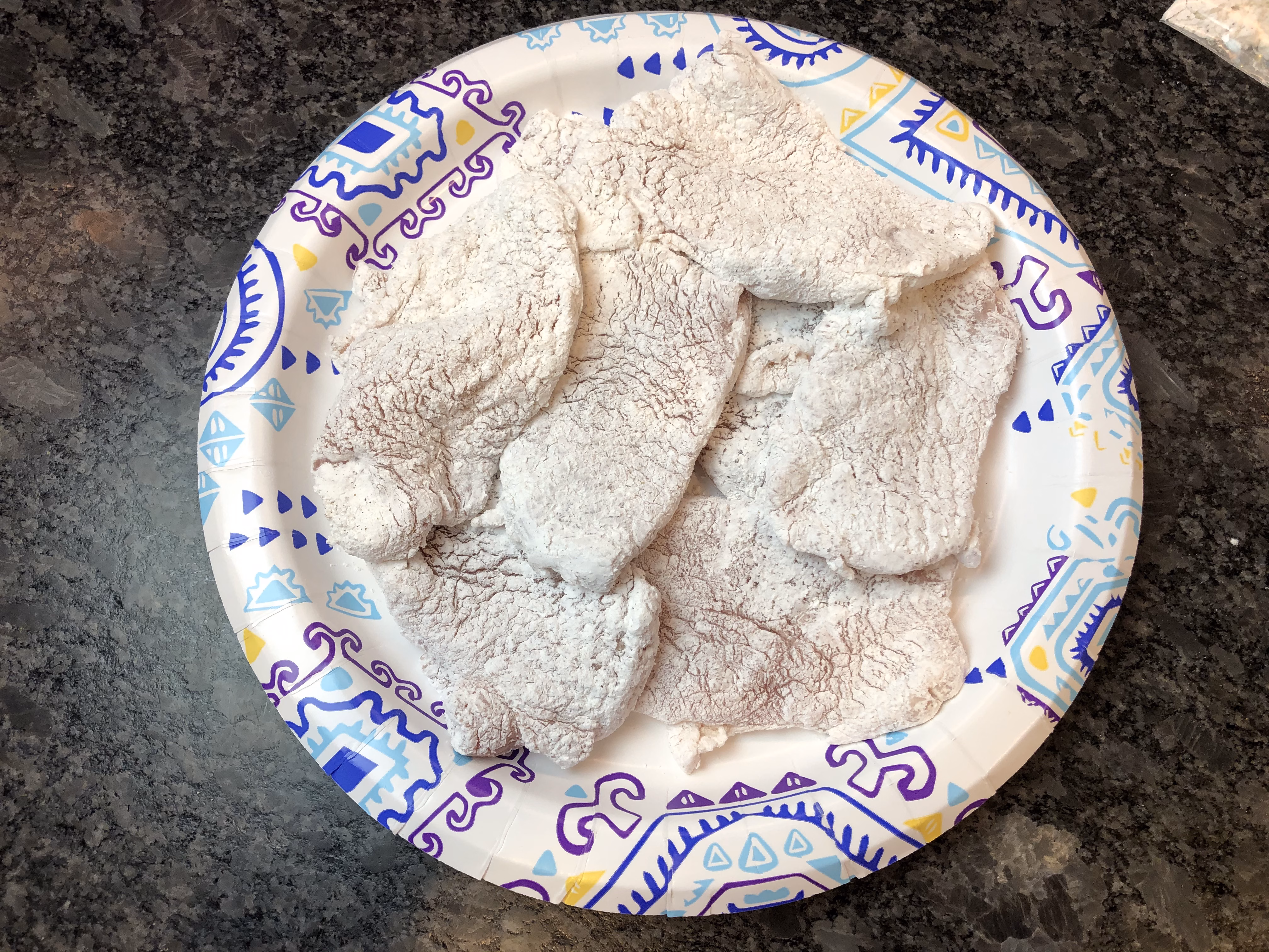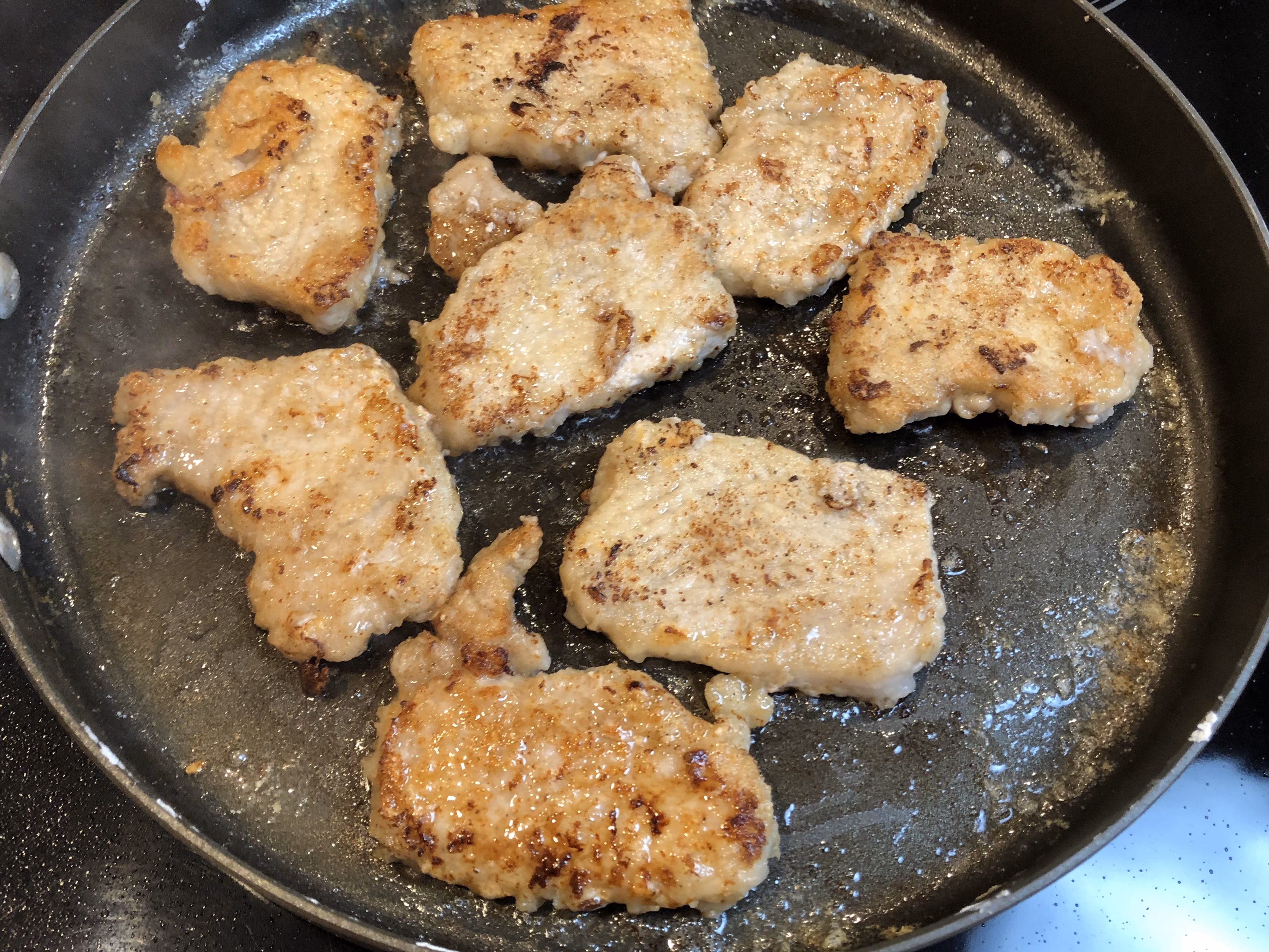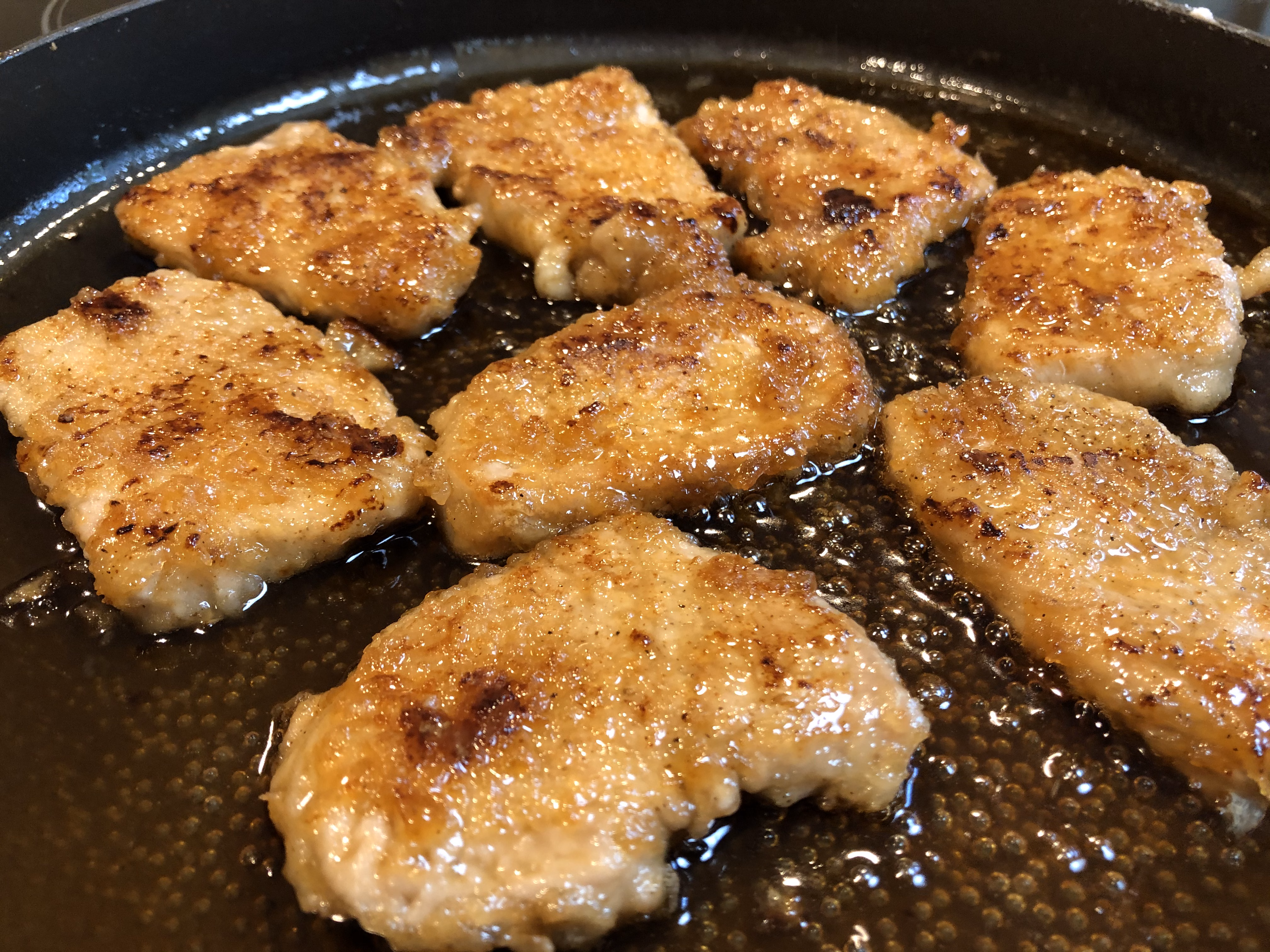 Place the pork pieces between 2 sheets of plastic wrap. Using a meat mallet, pound the pork chops until tenderized and thin. This is a great trick with pork, which can normally be a more tough meat.
