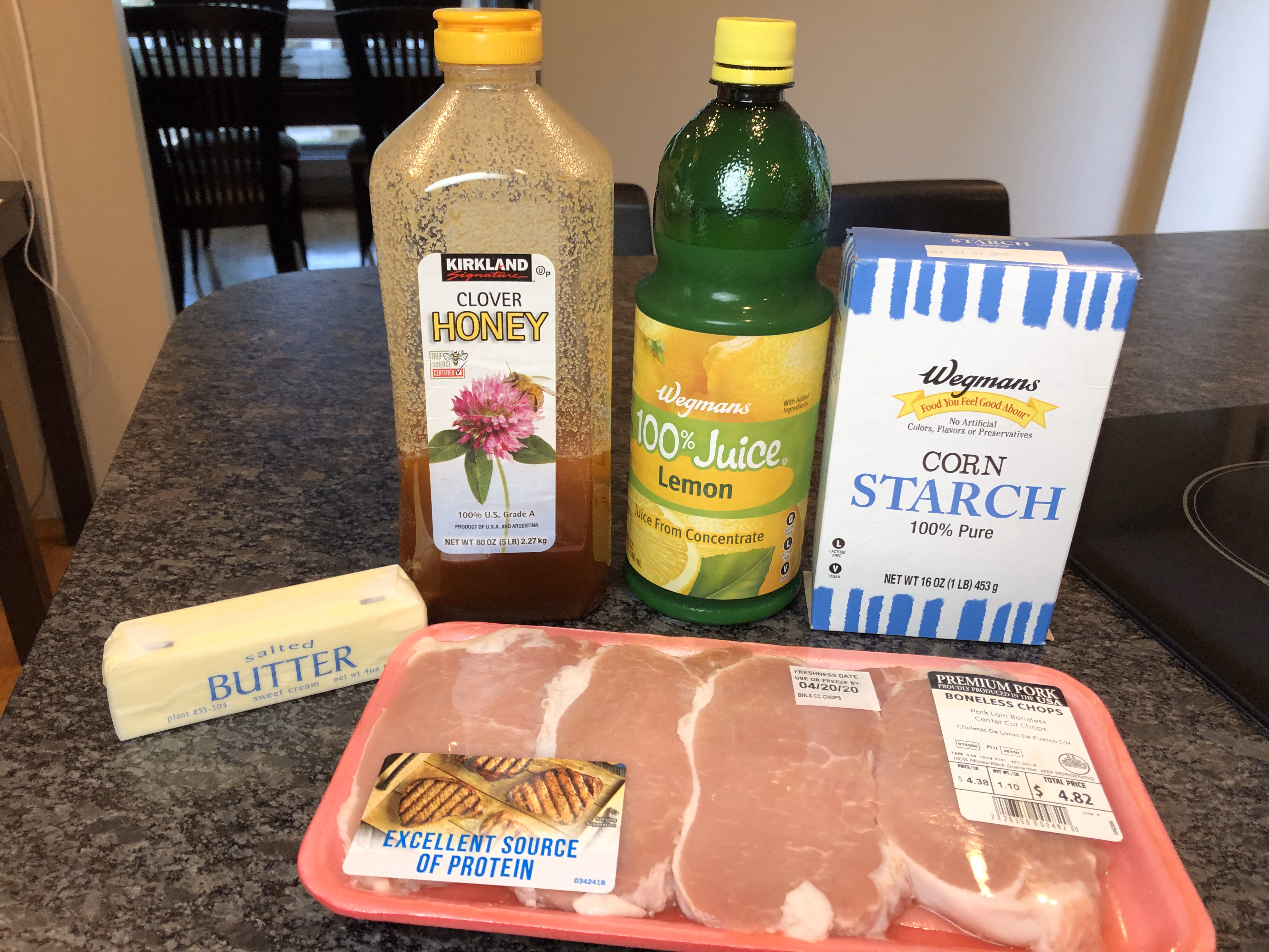 Gather your ingredients. You will need boneless pork loin chops, salt and pepper, cornstarch, butter, lemon juice, and honey. Simple!
