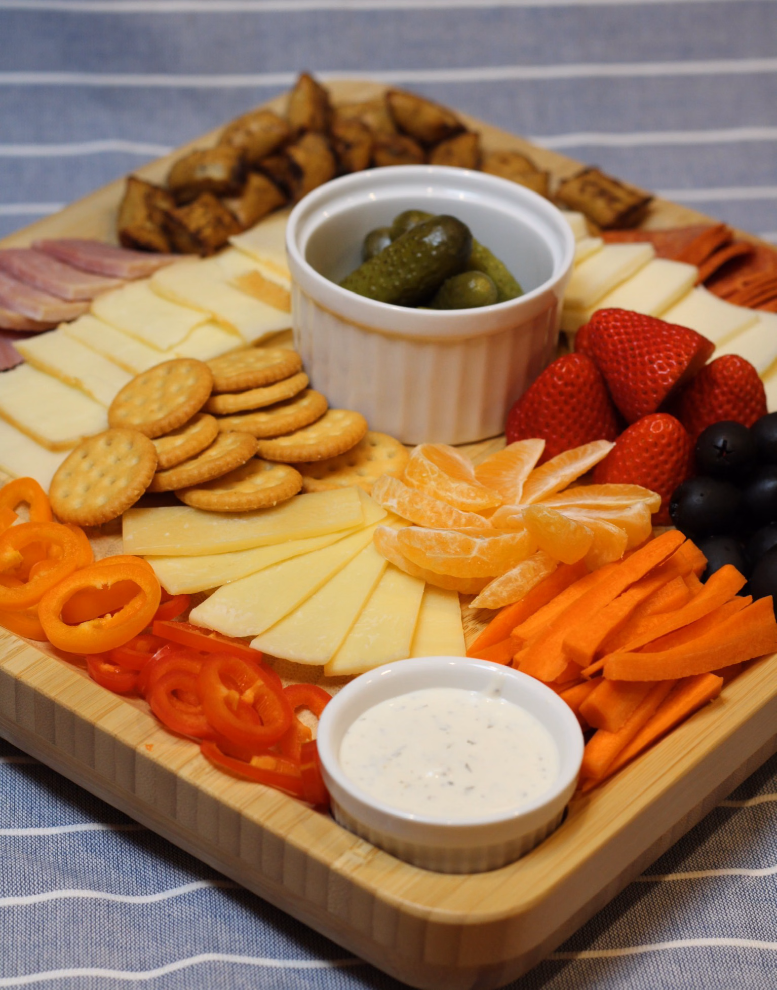 You definitely do not need a fancy board to make these! You can use any cutting board or flat pan or tray along with some ramekins. The goal is to cover every inch of the board with food. Looking to the future, I'm thinking about a dessert board! Or different boards for different holidays..... like a Valentines board! Whatever gets the kids excited to eat a bunch of finger foods. The possibilities are endless.
