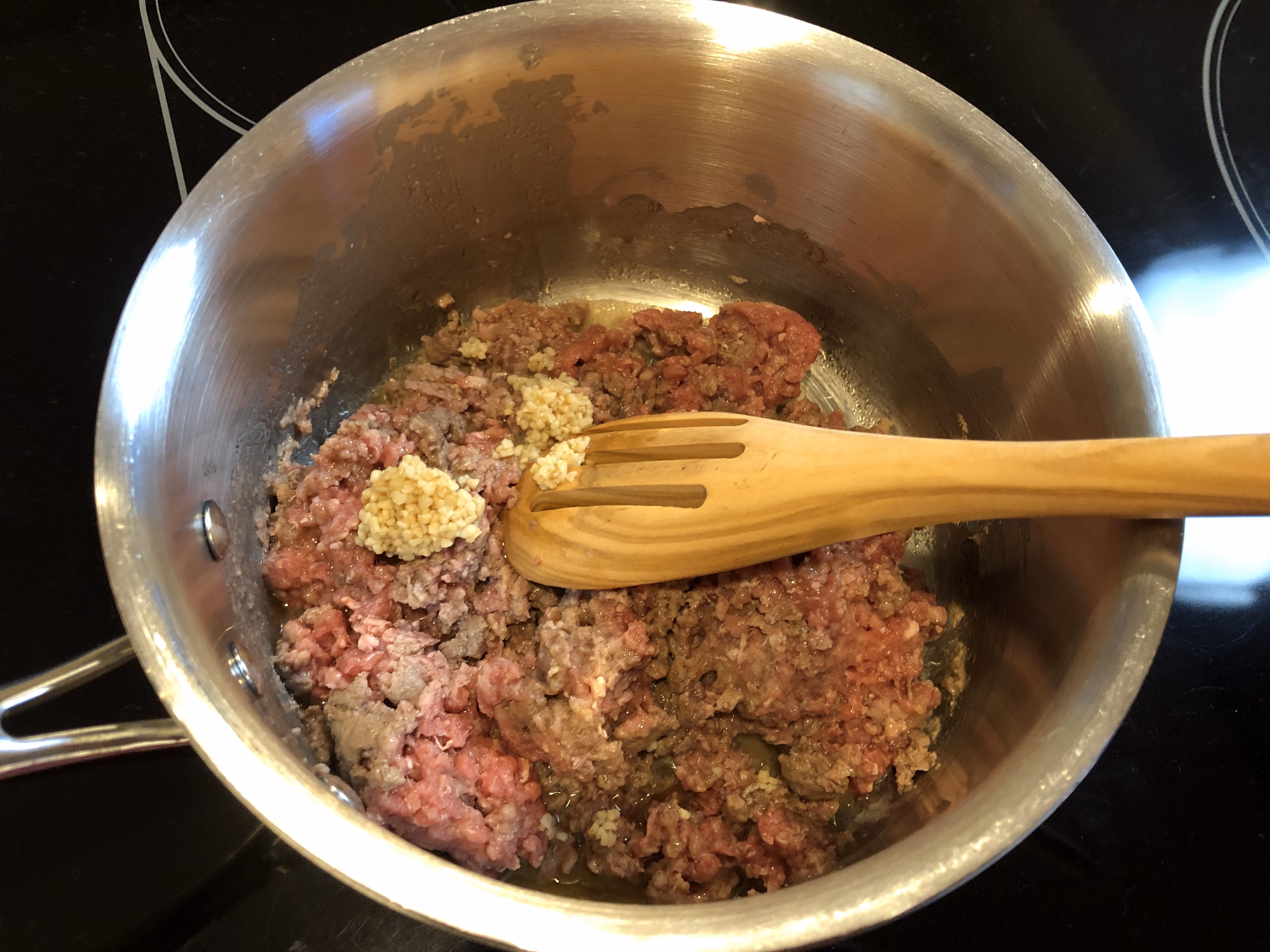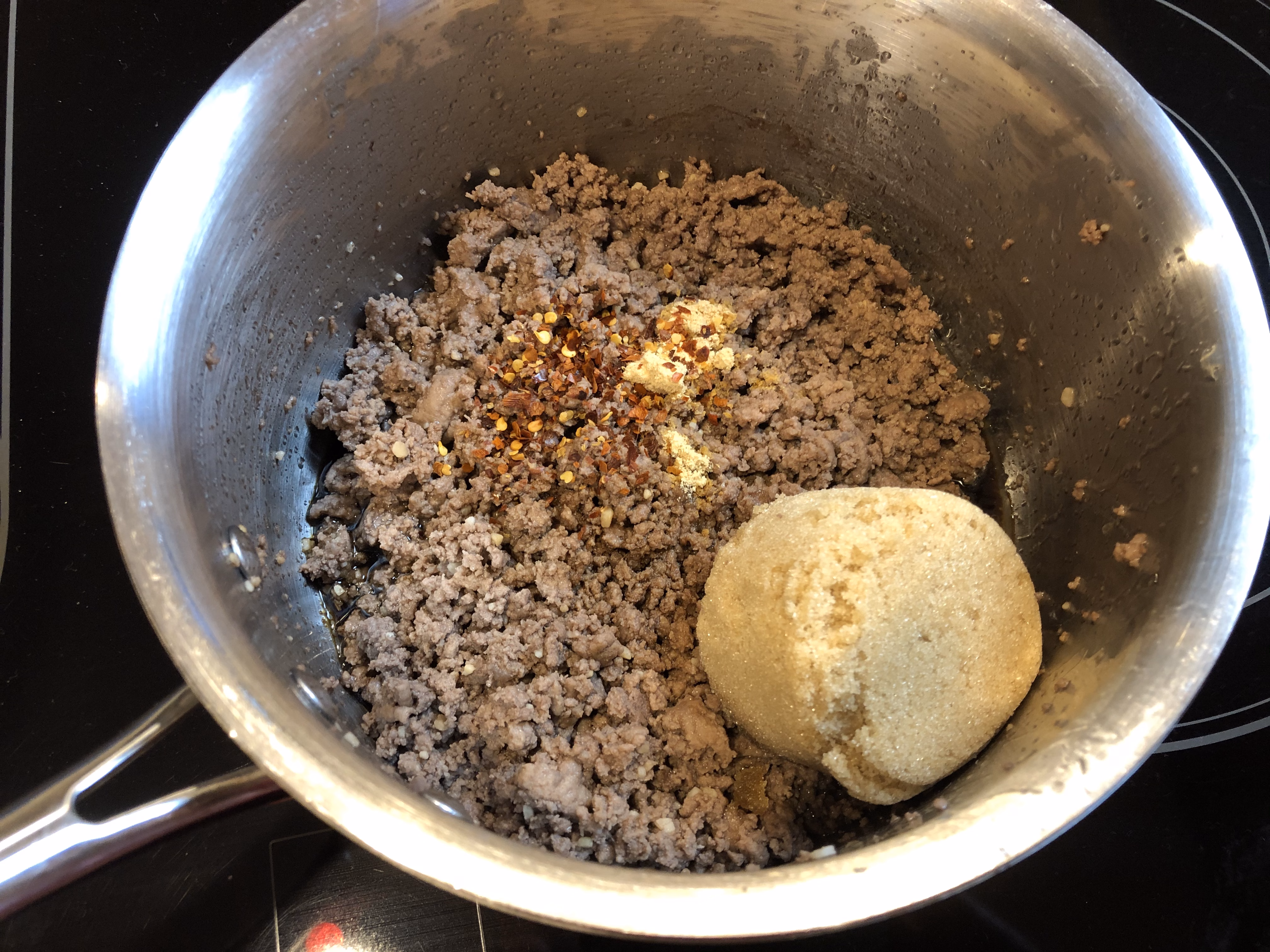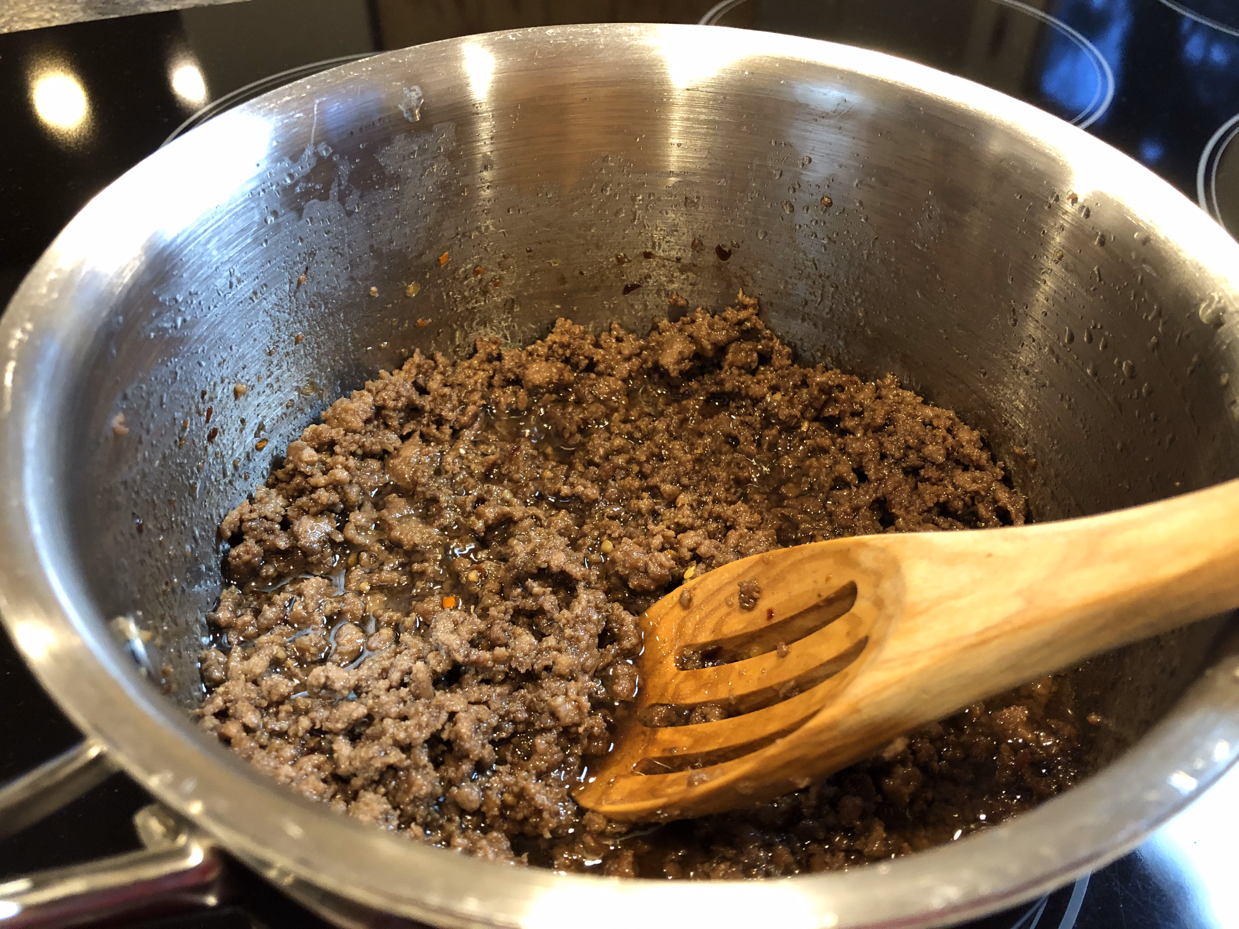 In a saucepan or skillet, heat the sesame oil over medium heat until you can smell it. Add the ground beef and garlic and brown until no longer pink. Drain the meat.