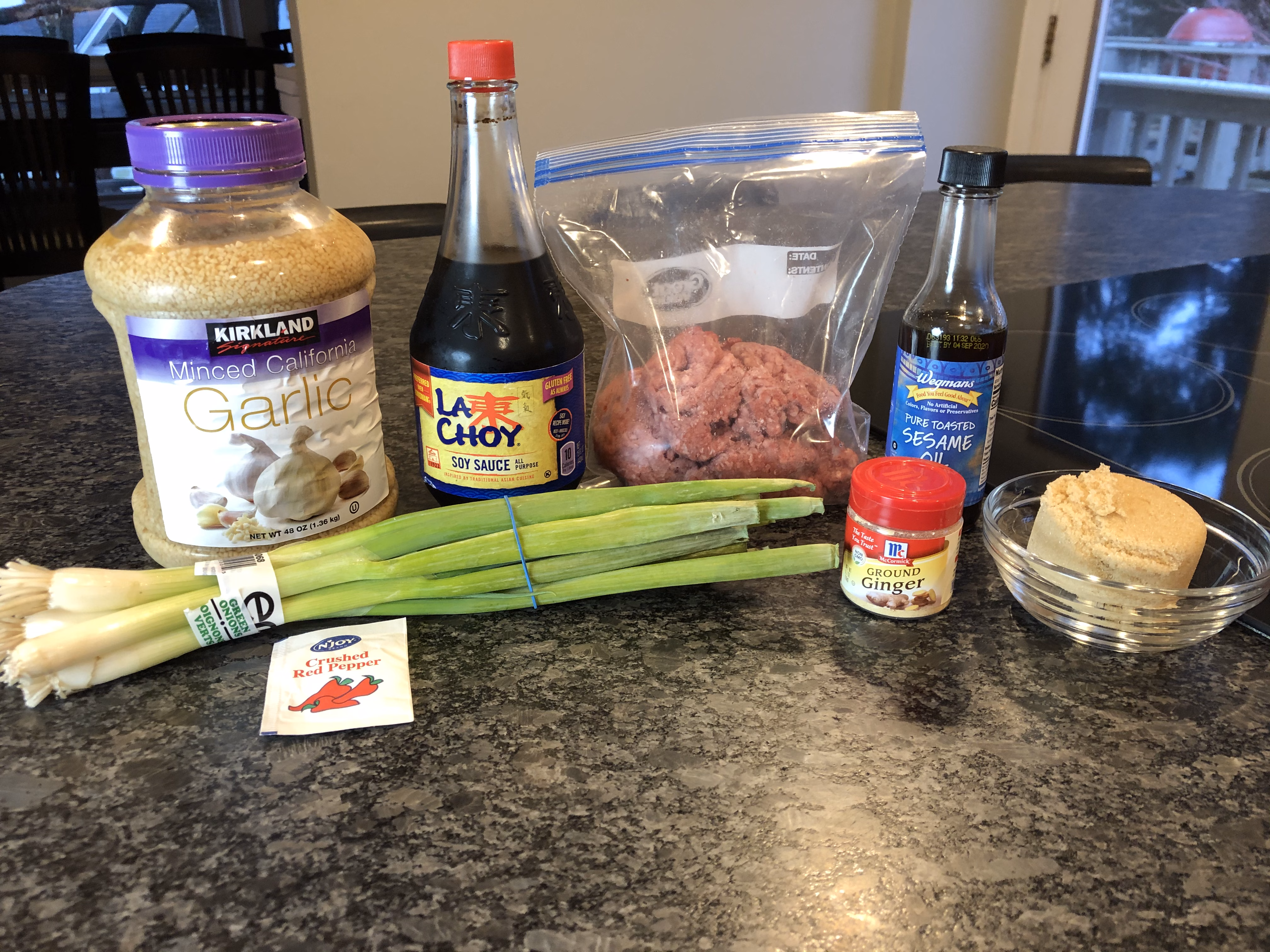 Heat the sesame oil in a skillet or pan over medium heat until you can smell it. Add the ground beef and minced garlic and brown until no longer pink. Drain the meat, then add the brown sugar, soy sauce, ginger, salt and pepper, and crushed red pepper. Simmer on low for a few minutes to enhance the flavors. Serve over steamed rice and top with green onions and toasted sesame seeds.