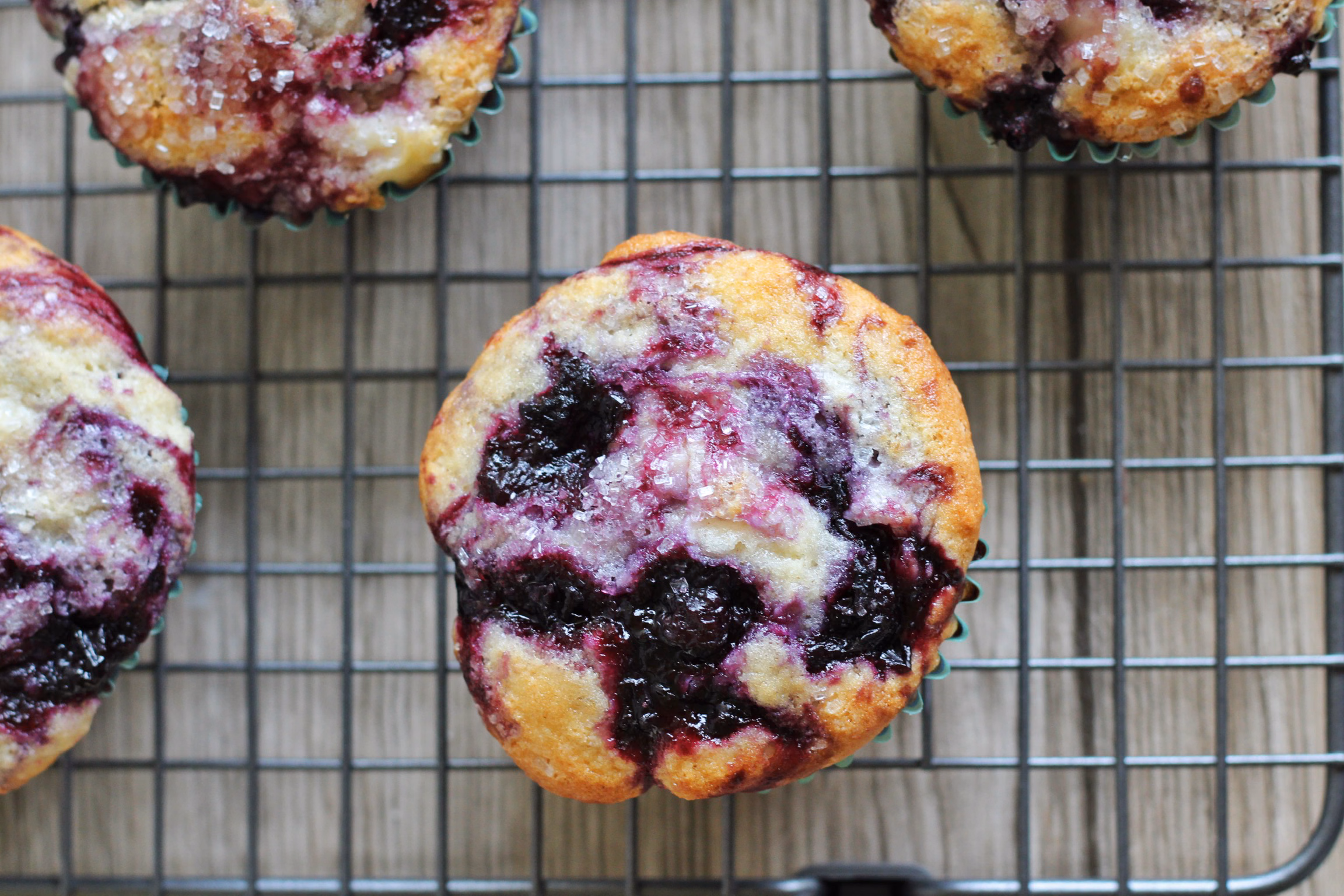 We love blueberry muffins, and this recipe is one of our favorites. Yet there is always room for new recipes, and this muffin has won our hearts. You first prepare a quick blueberry jam by cooking blueberries with lemon juice and zest, then swirl it in the muffin batter along with chunks of cream cheese and fresh blueberries. The outcome is the most moist, delicious muffin ever! If you know me, the sugar on top won't be a surprise either.