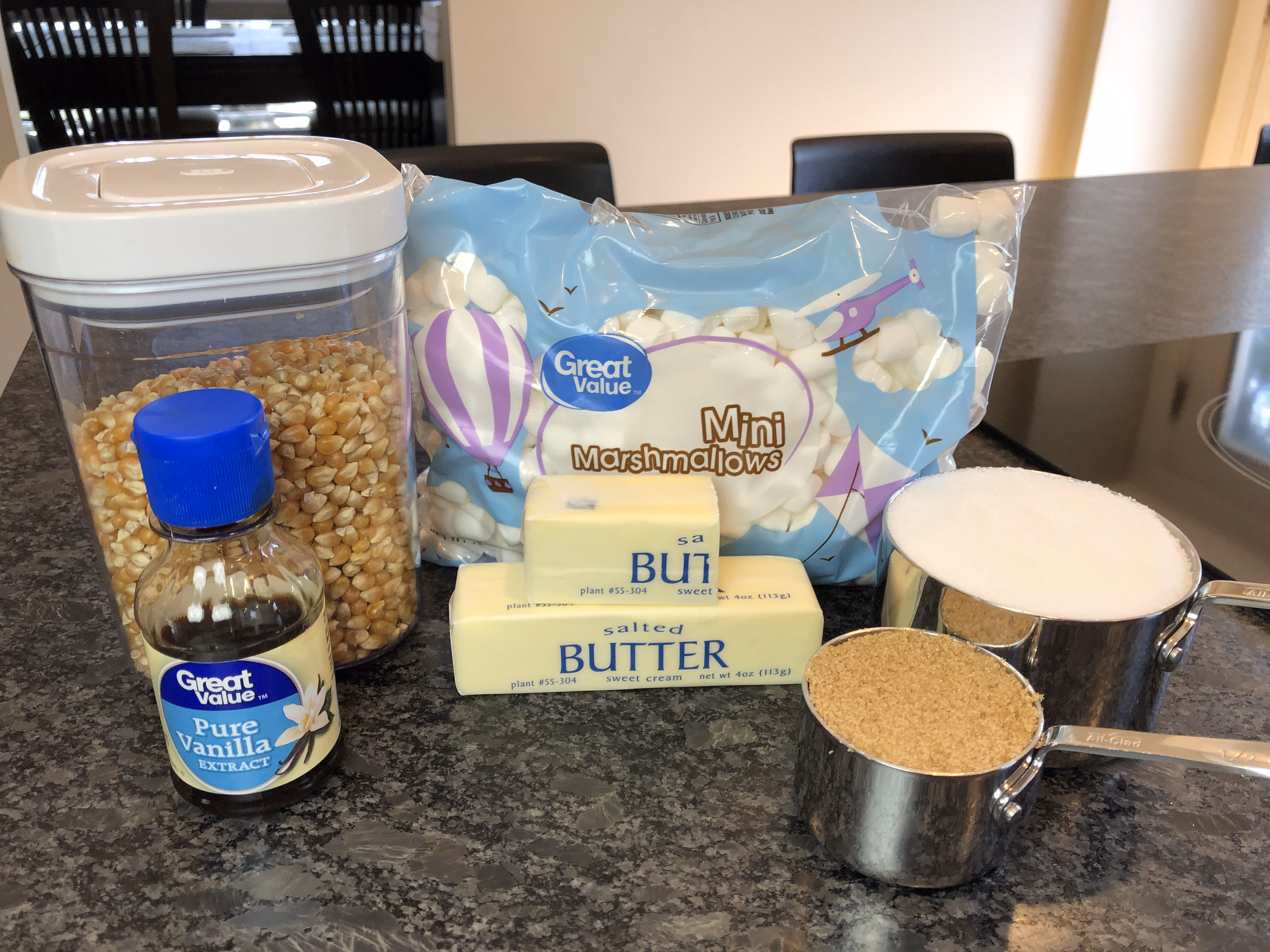 Gather your ingredients. You need popcorn kernels, butter, brown sugar, white sugar, marshmallows, and vanilla.