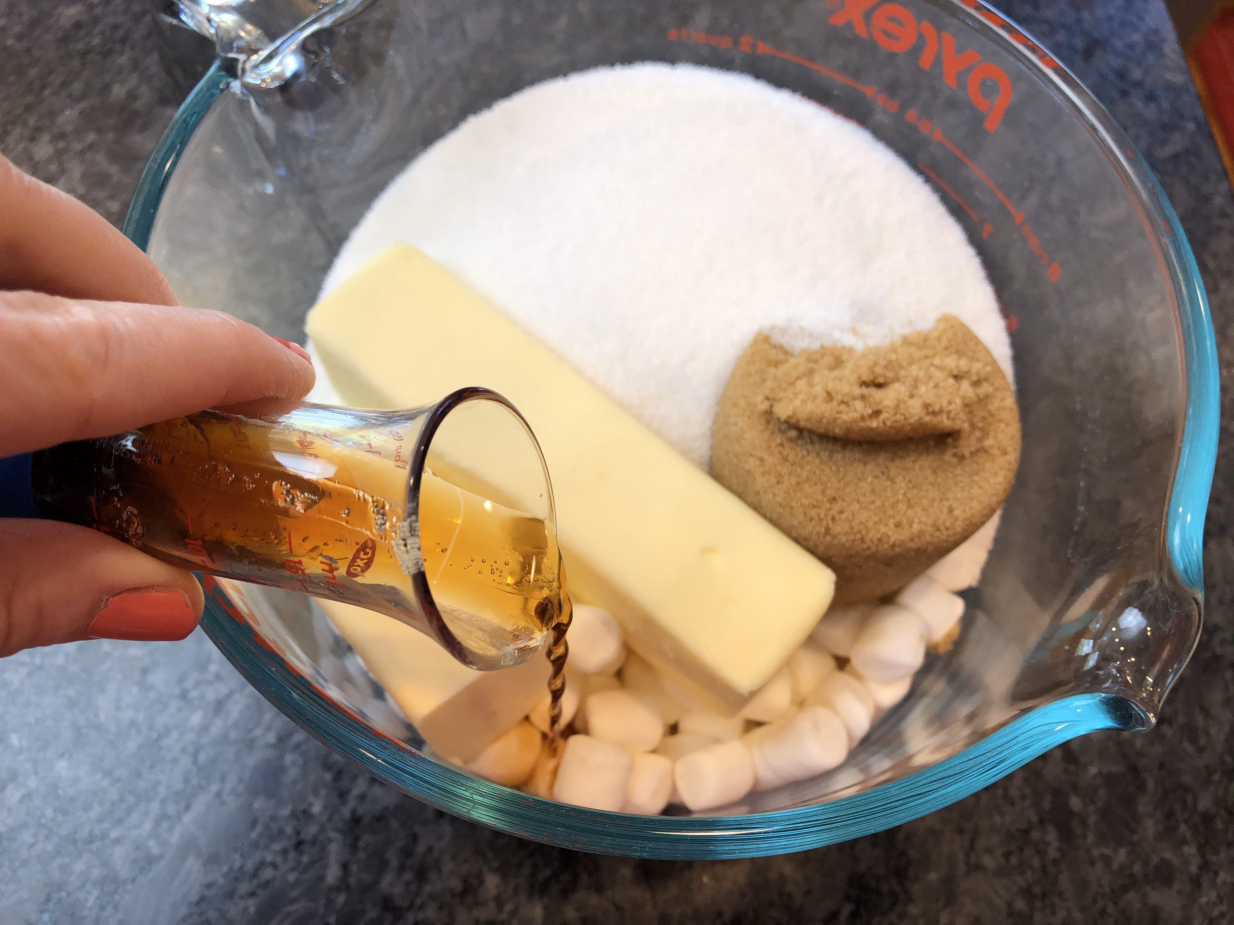 In a large microwavable bowl, add 3/4 cup butter, 1 1/2 cups sugar, 1/2 cup brown sugar, 5 cups marshmallows, and 2 teaspoons vanilla. Microwave on high in 1 minute intervals, stirring in between, until it is completely melted and smooth.