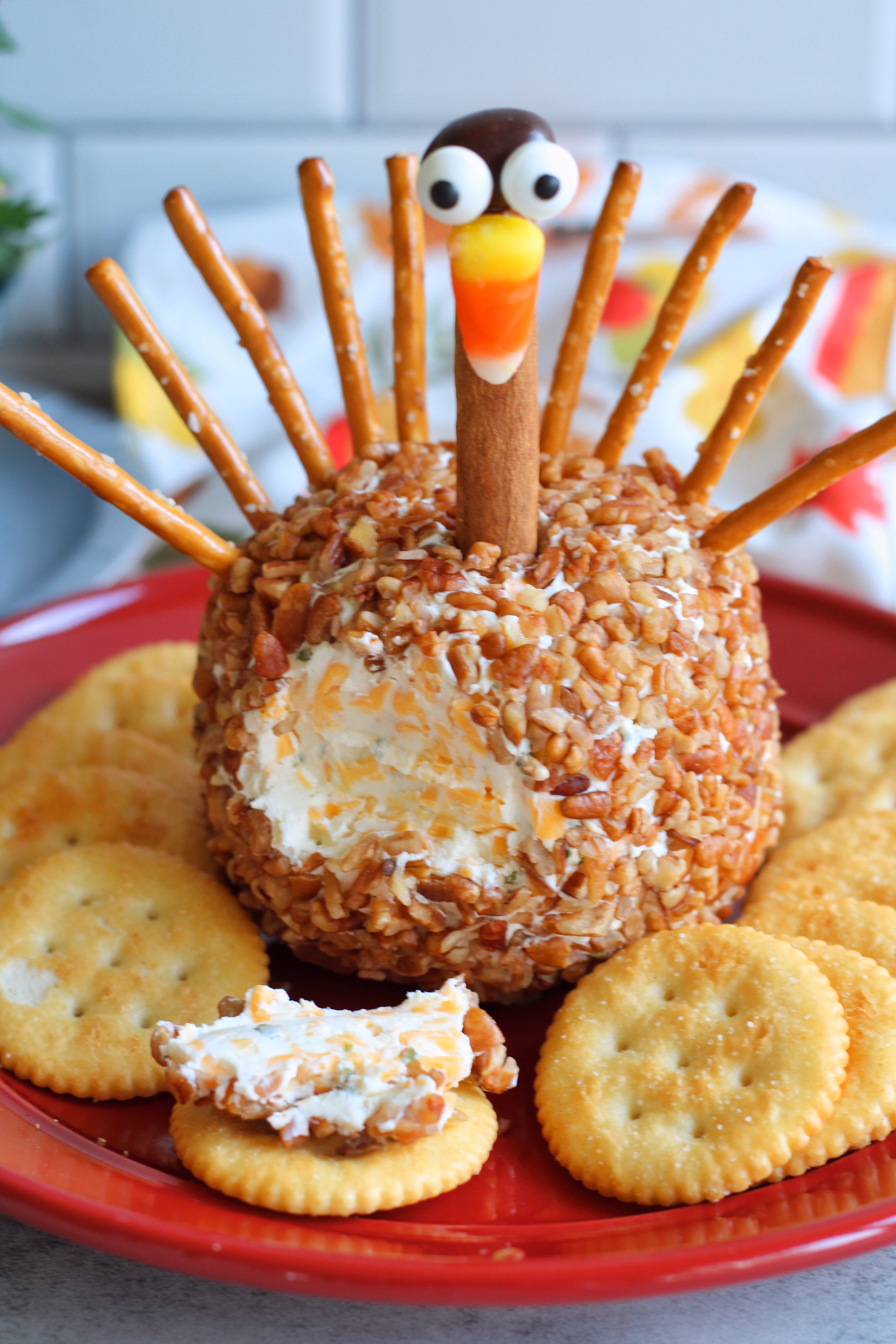 When you are ready to serve, insert the turkey head in the top front of the cheeseball. Insert a bunch of pretzels along the top back as the feathers.