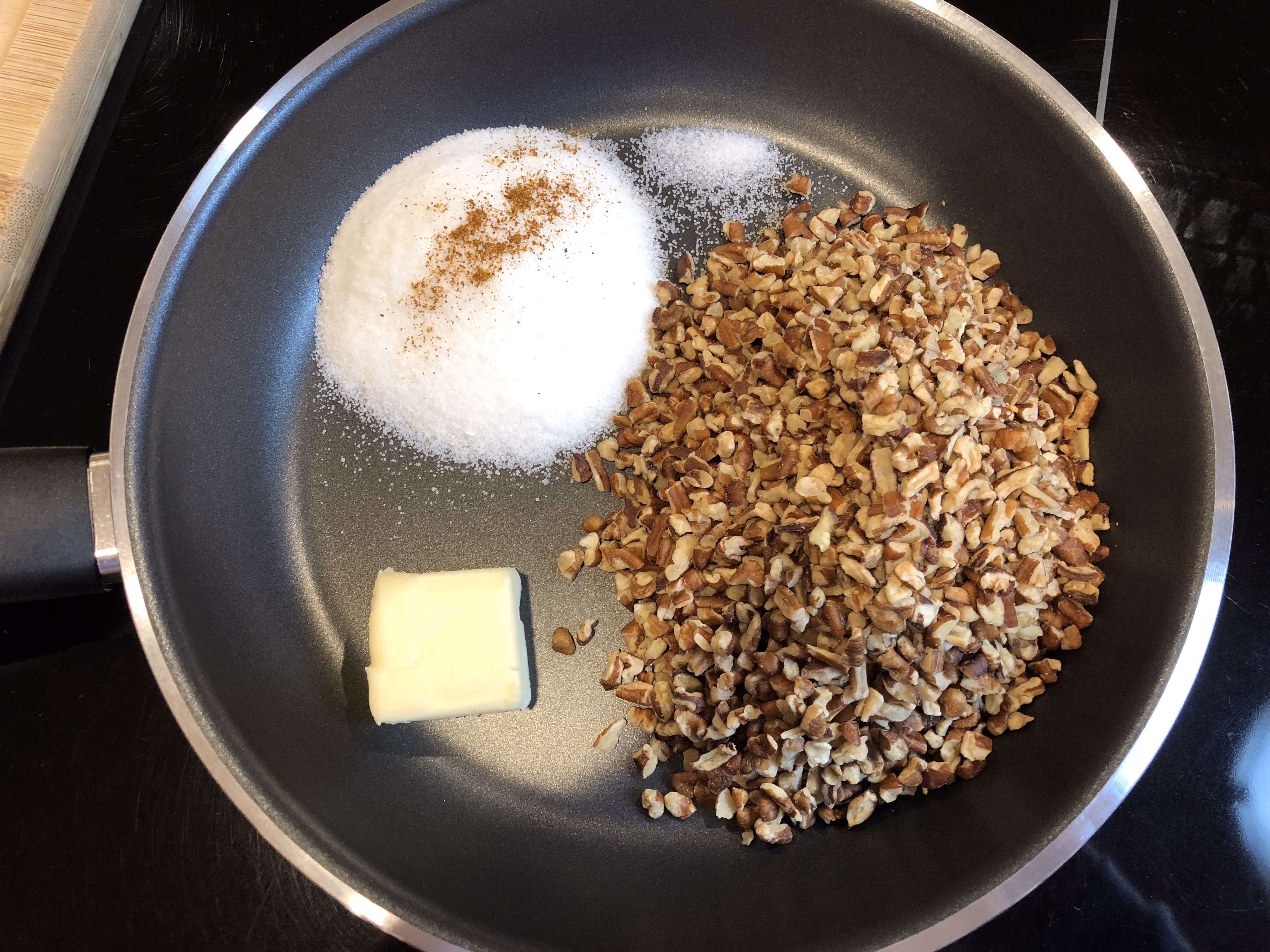 For the candied nuts, in a 10-inch skillet, combine 1 cup chopped pecans (or desired nut), 1/4 cups sugar, 1 tablespoon butter, and a pinch of salt and cayenne pepper.