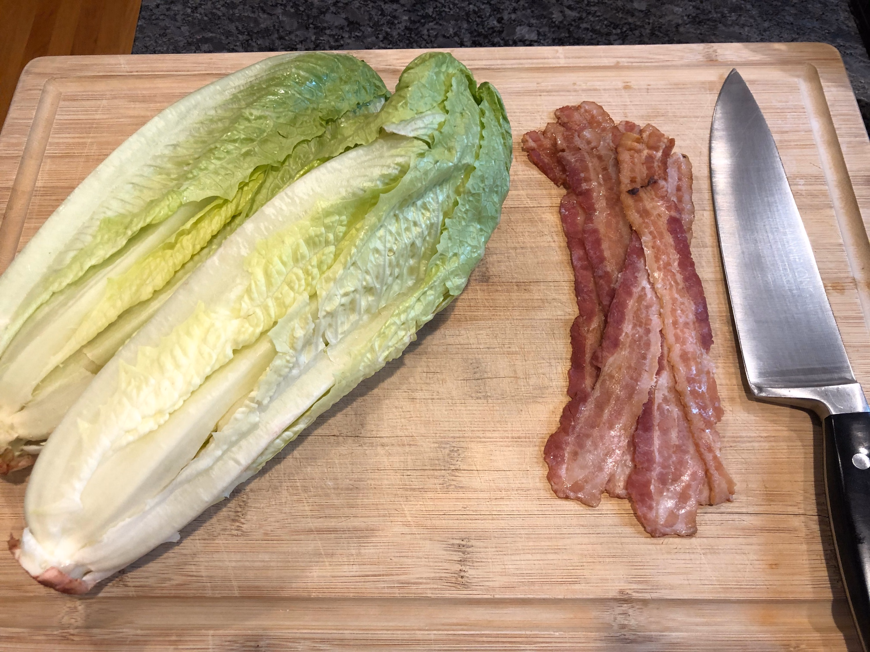 To prepare the salad, chop up 2 heads of romaine lettuce and 6-8 slices cooked bacon. I love using the Kirtland pre-cooked bacon for things like this.