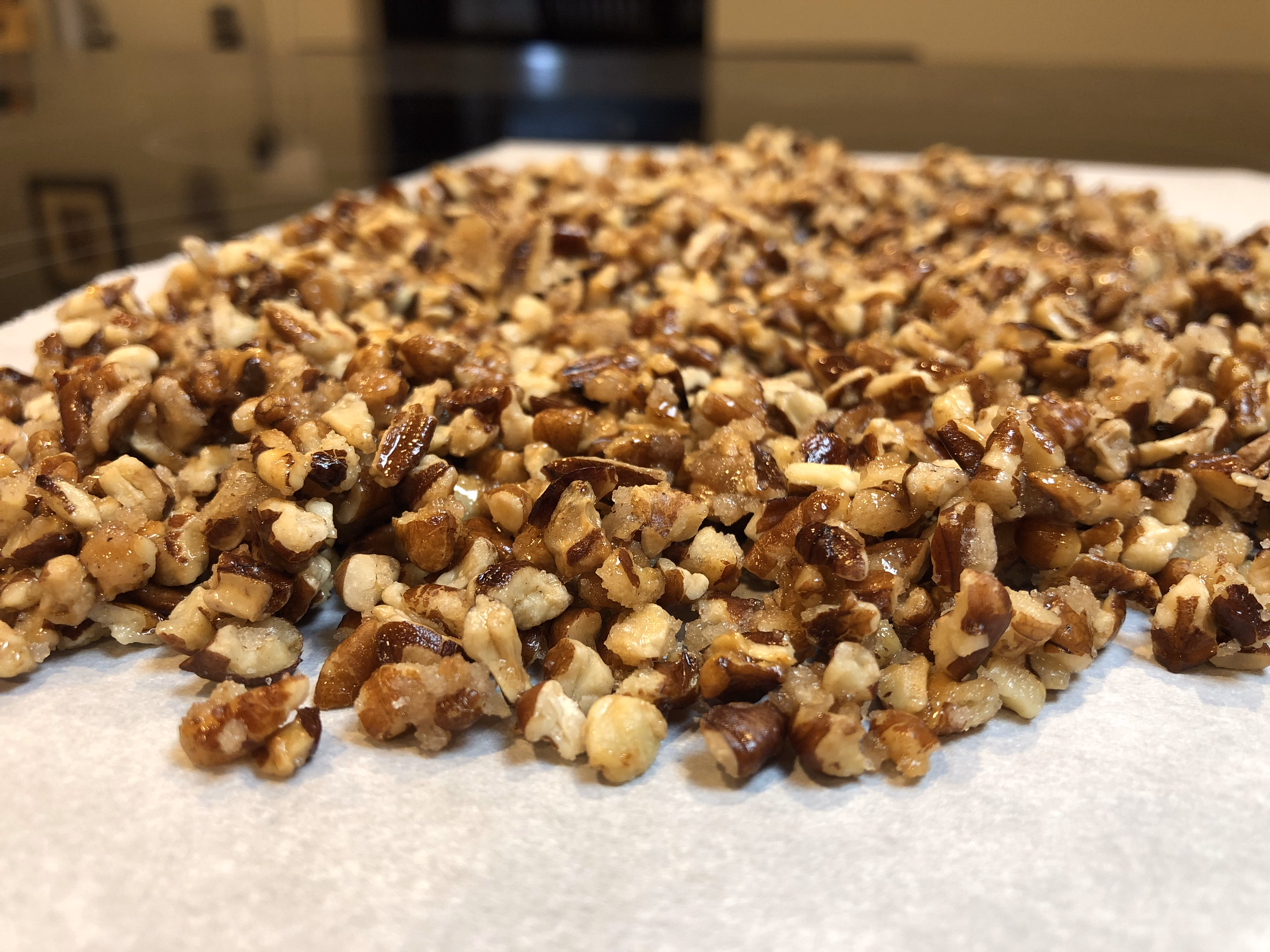 Over medium heat, stir continually with a spatula until the butter and sugar have melted and nuts are completely coated. You'll know it's ready when there aren't sugar granules left and the nuts are shiny.
