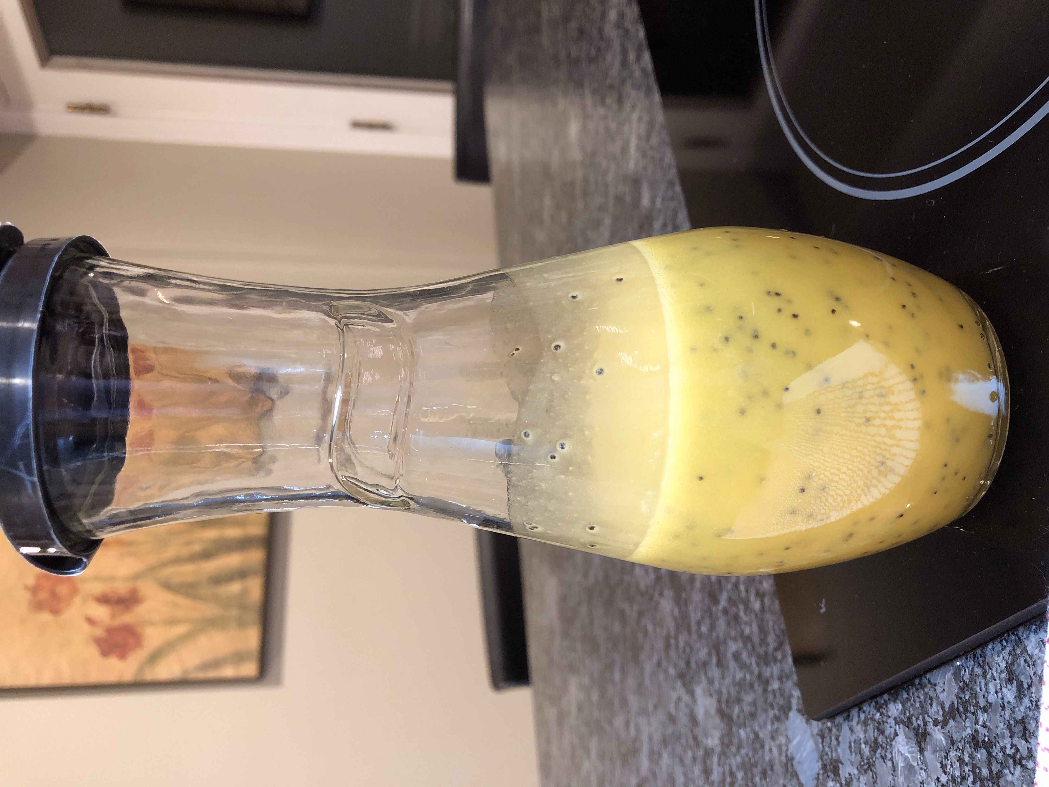 Add the 3/4 teaspoon poppy seeds. Shake or stir these in so you don't grind up the seeds in the blender. Pour into a serving container and refrigerate until ready to use.