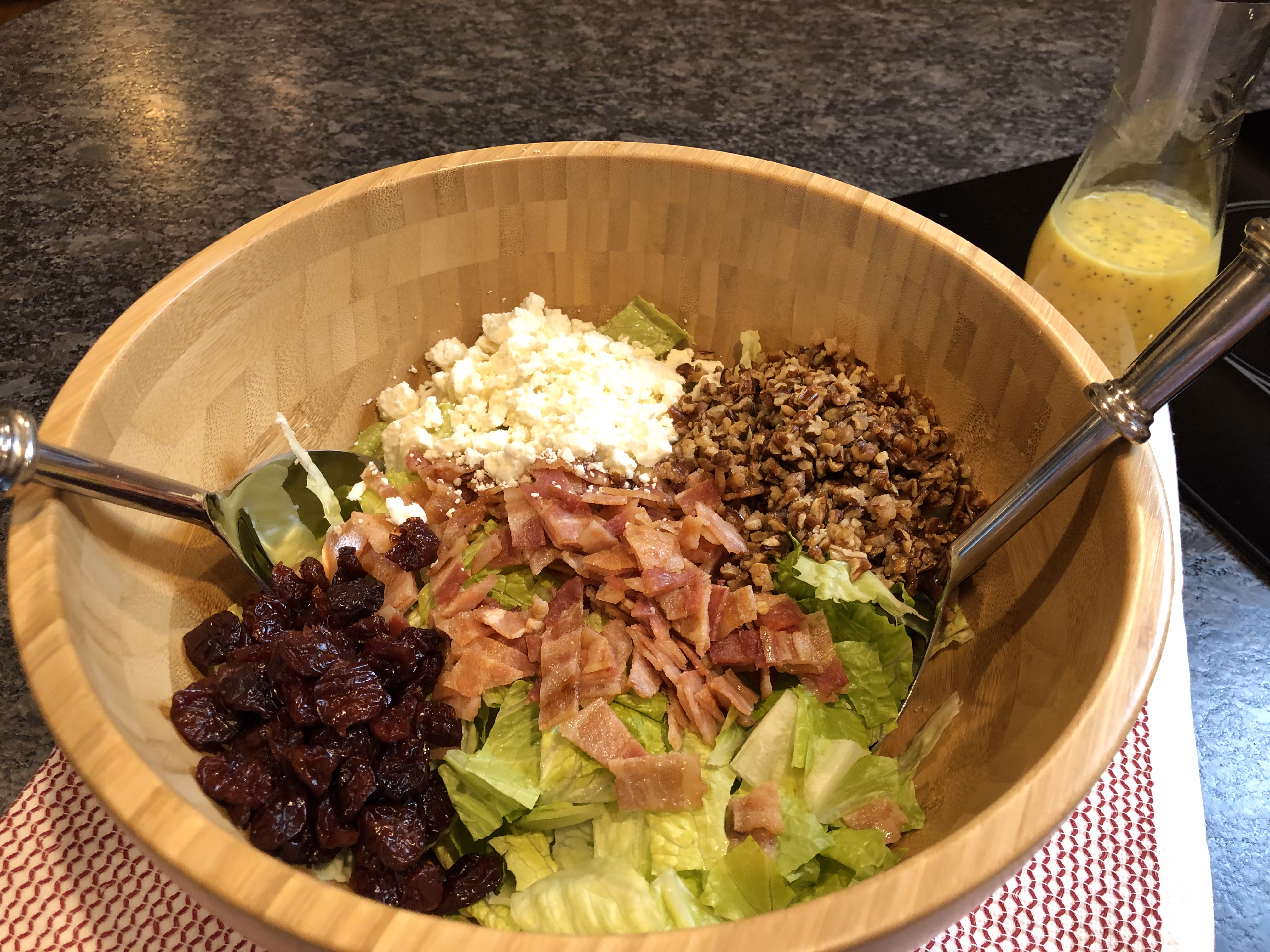 In your salad bowl, add the lettuce, bacon, 1/2 cup feta cheese, and 1 cup of dried cherries. Once your nuts are cool, break them up and add to the salad. Toss to combine.