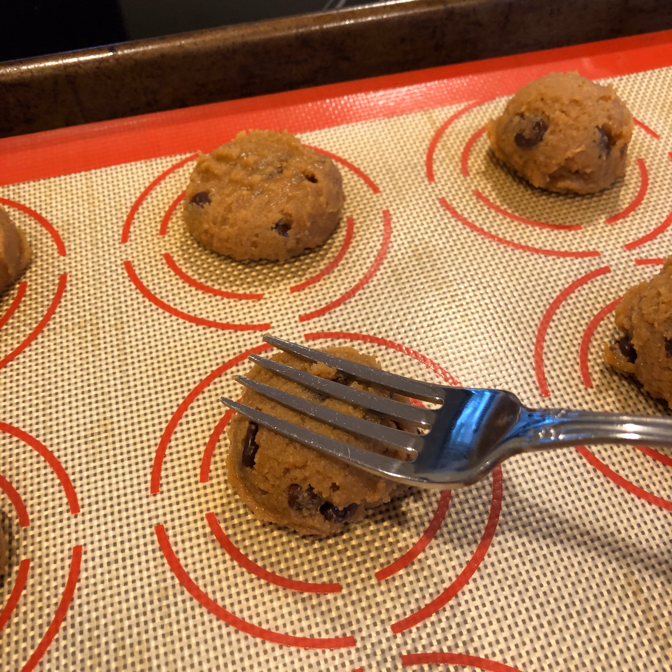 Scoop onto cookie sheet (about 2 tablespoons of cookie dough per cookie). Using a fork, press a criss-cross pattern into each cookie, flattening the dough to about 1/2-inch thickness.