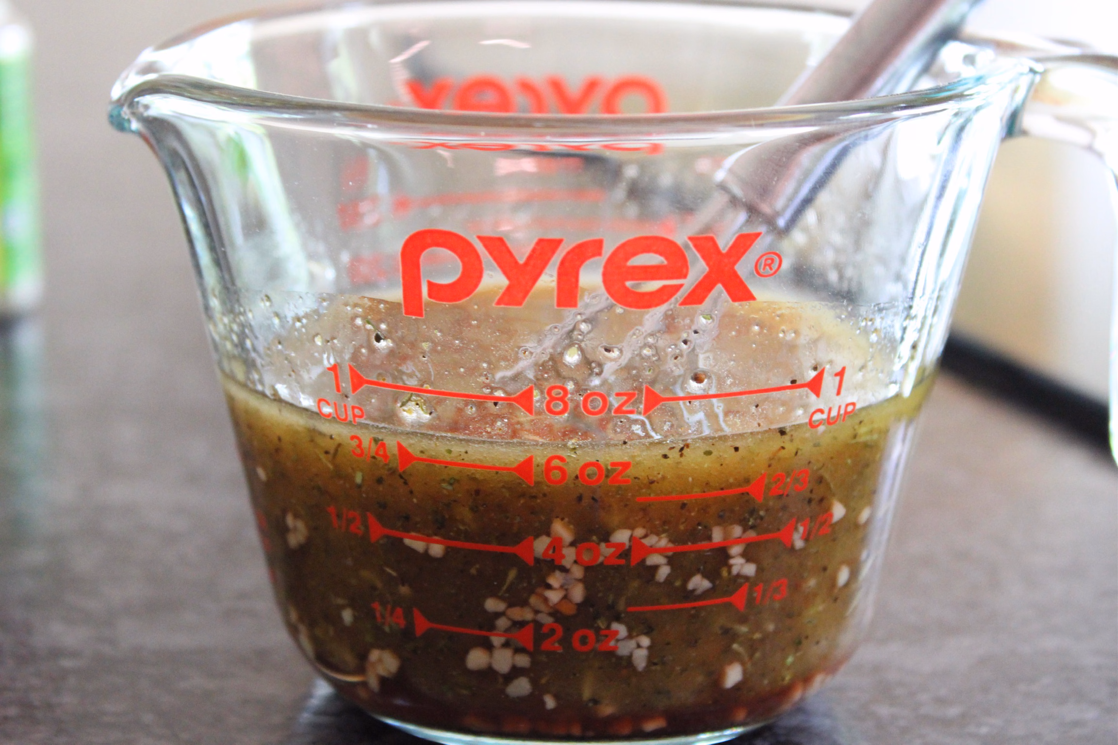 In a glass liquid measuring cup, whisk together 1/2 cup olive oil, 1/4 cup red wine vinegar, 1 teaspoon minced garlic (about 2 cloves), 1 tablespoon Italian seasoning, and salt and pepper to taste.