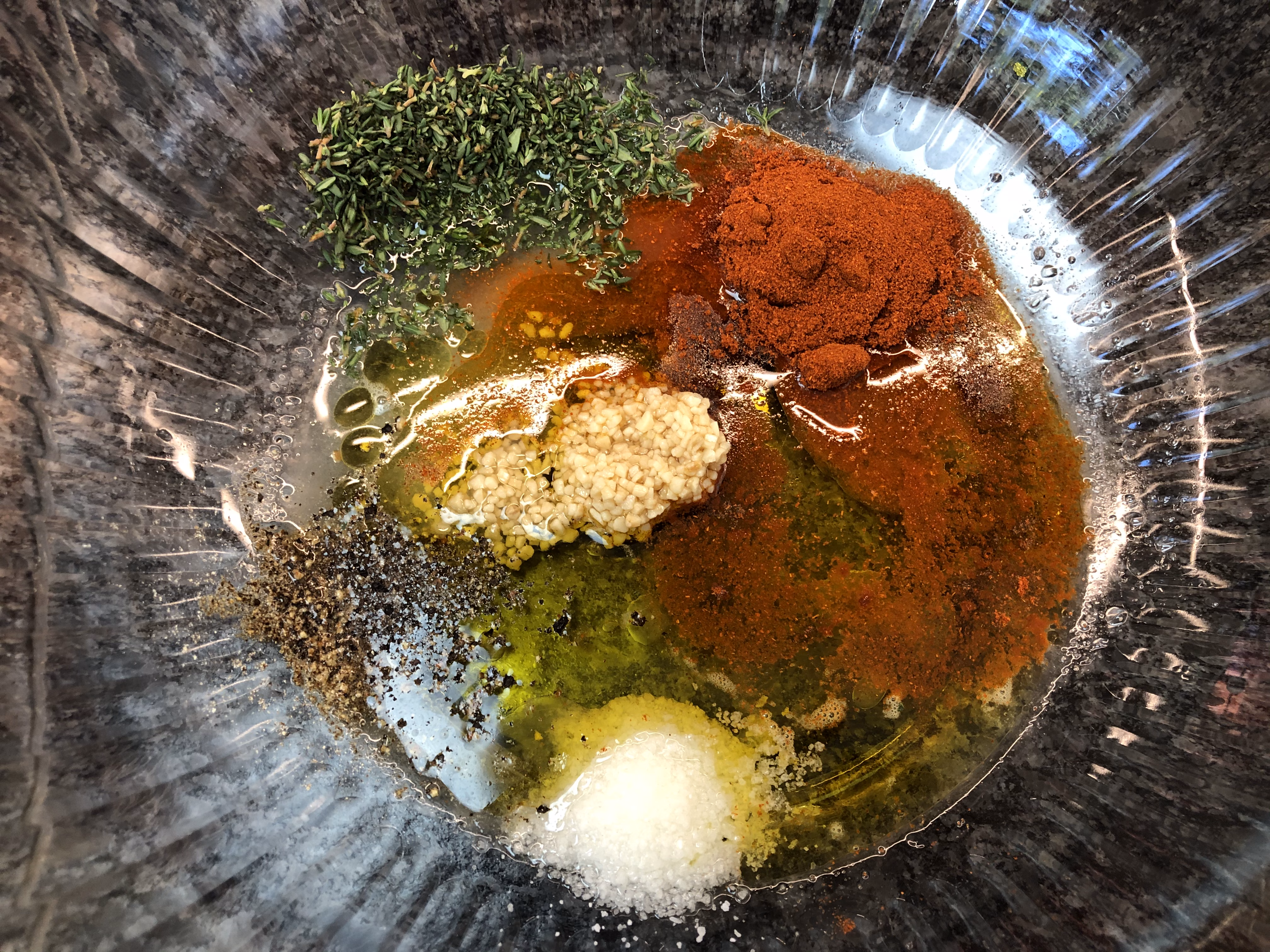 To the bowl add the thyme, 1 tablespoon smoked paprika, 4 cloves of minced garlic, and salt and pepper. Stir to combine.