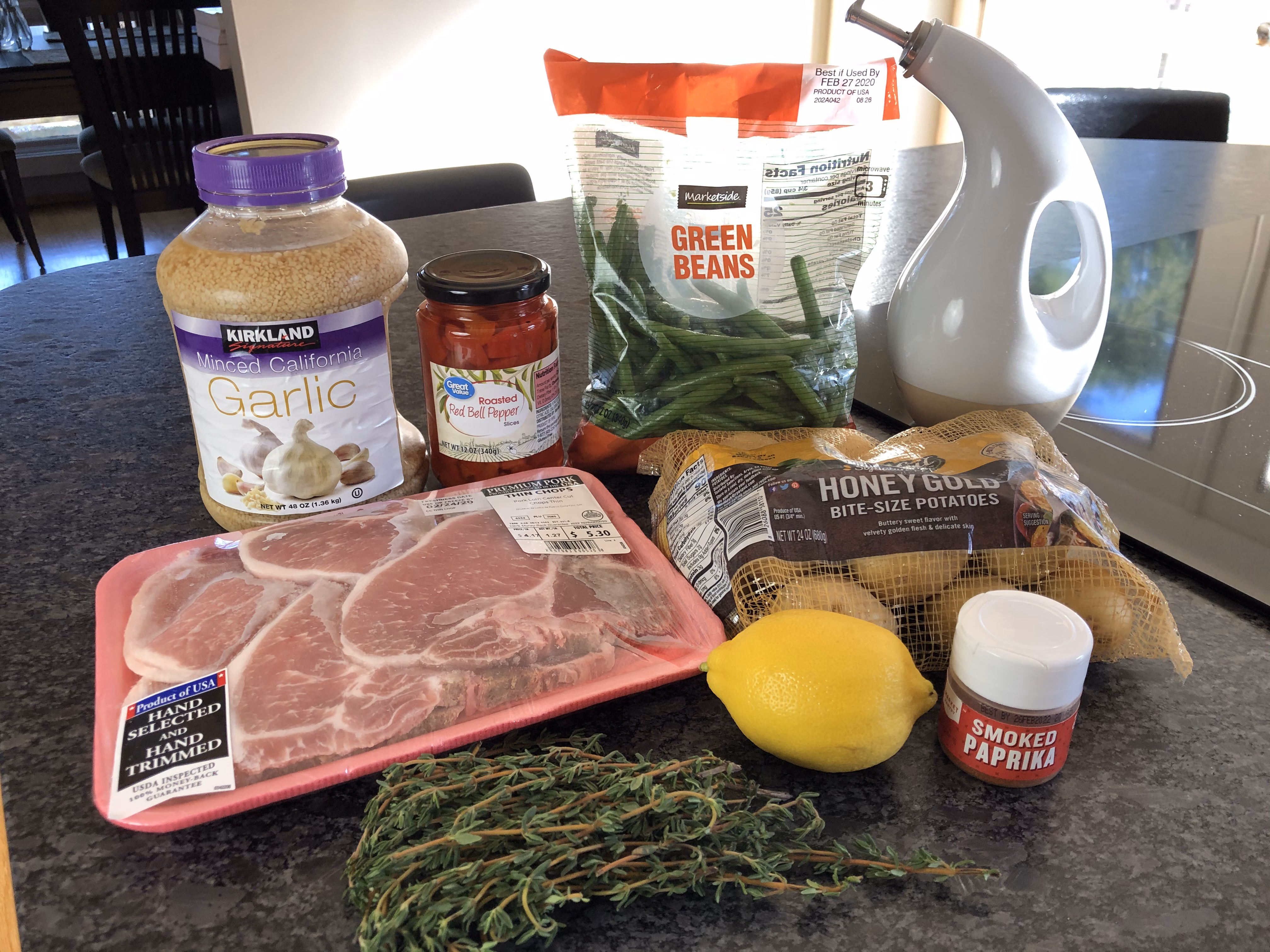 Gather your ingredients. You need some bone-in pork chops, green beans, Yukon Gold potatoes, olive oil, roasted red bell peppers, a lemon, fresh thyme, and smoked paprika.
