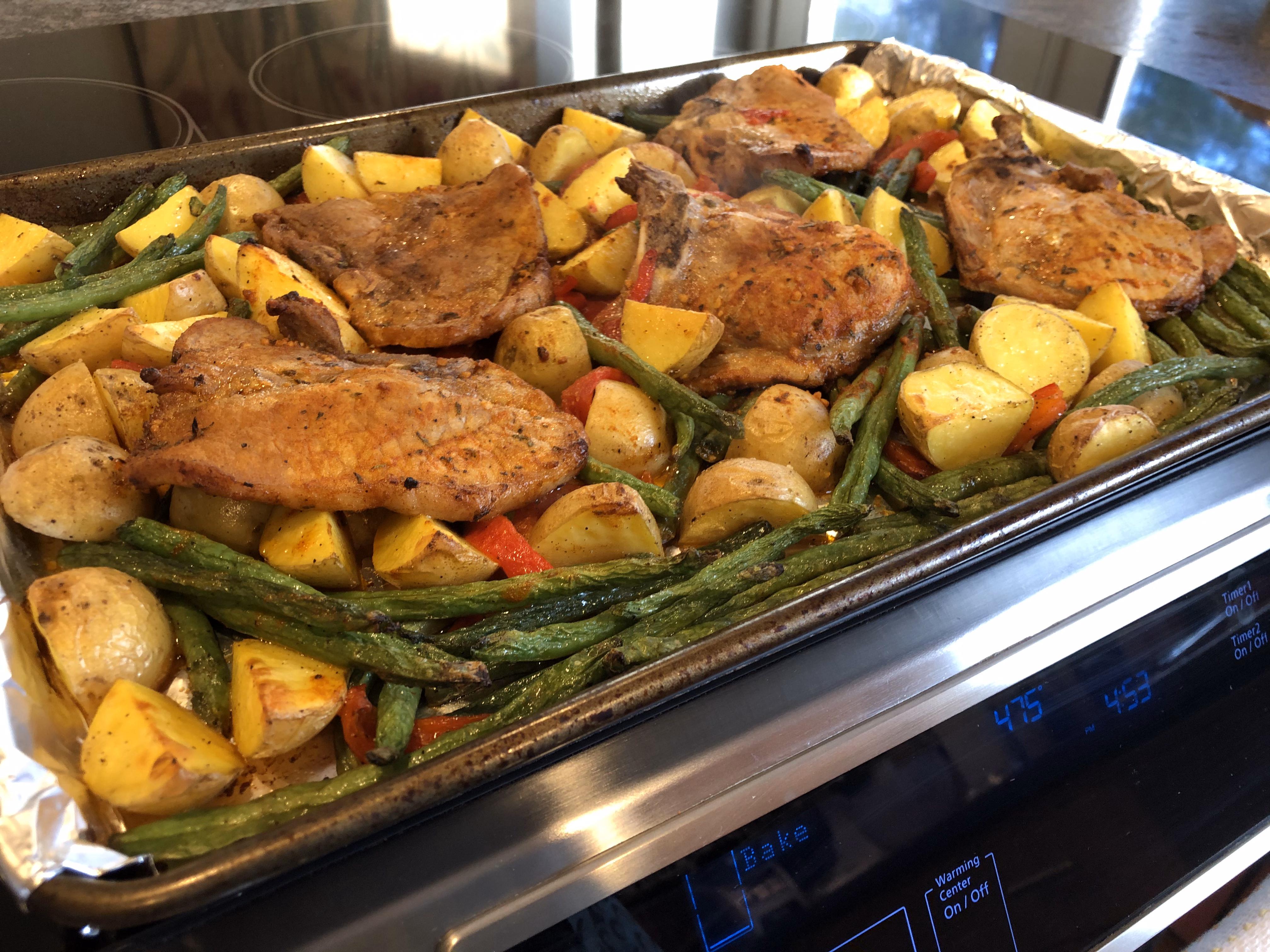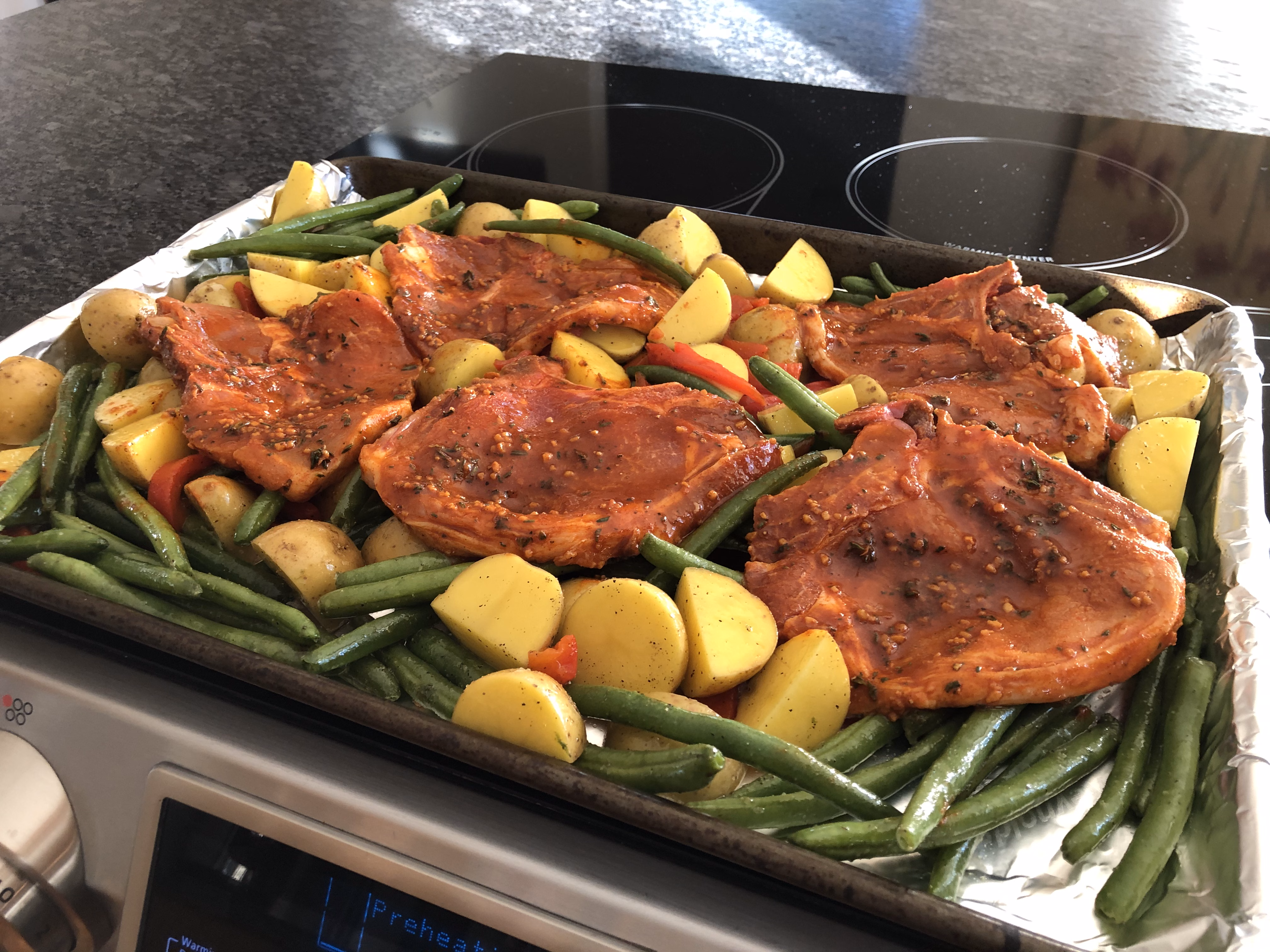 Once it is done roasting, the potatoes will have started browning, the green beans will be nice and caramelized, and the chops will be just done (juices run clear). Overcooking the pork chops will make them dry.