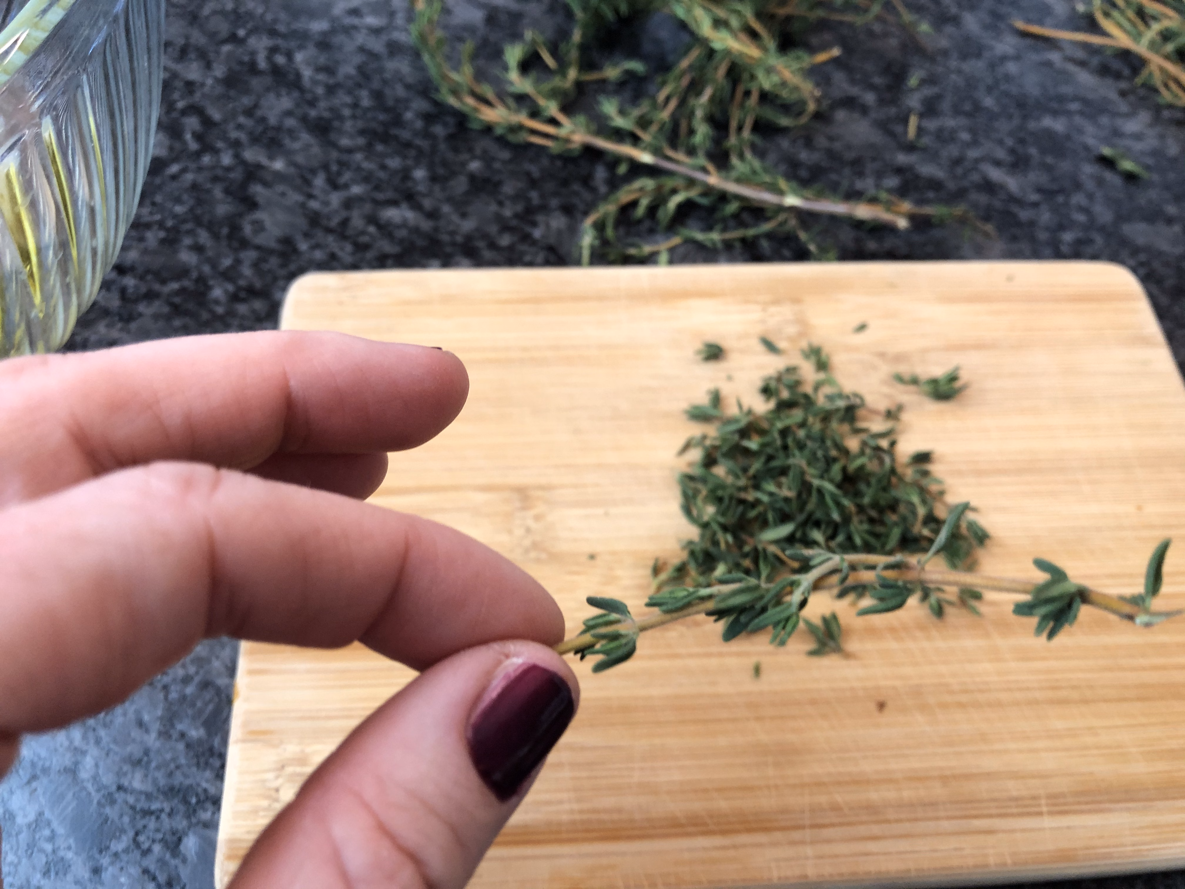 Fresh thyme is one of my favorite fresh herbs to cook with! You can usually find it in the produce department with other herbs. To prepare thyme, take one stem at a time (no pun intended ?) and run you finger against the leaves in the opposite way that they've grown. Repeat with as many stems as you need to get roughly 2 tablespoons. Chop with a knife.