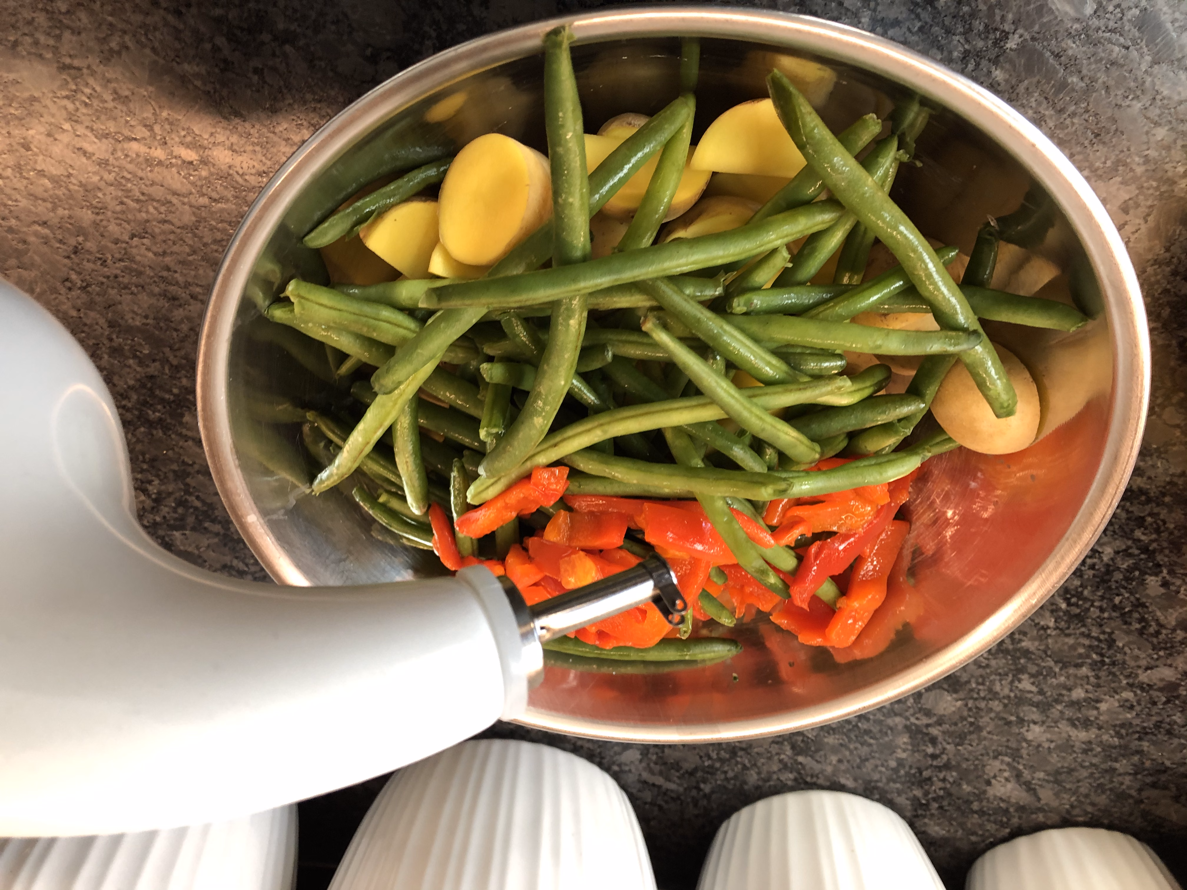 In another mixing bowl, combine the Yukon Gold potatoes, green beans, and roasted red peppers. Toss with remaining 3 tablespoons olive oil and season with salt and pepper.