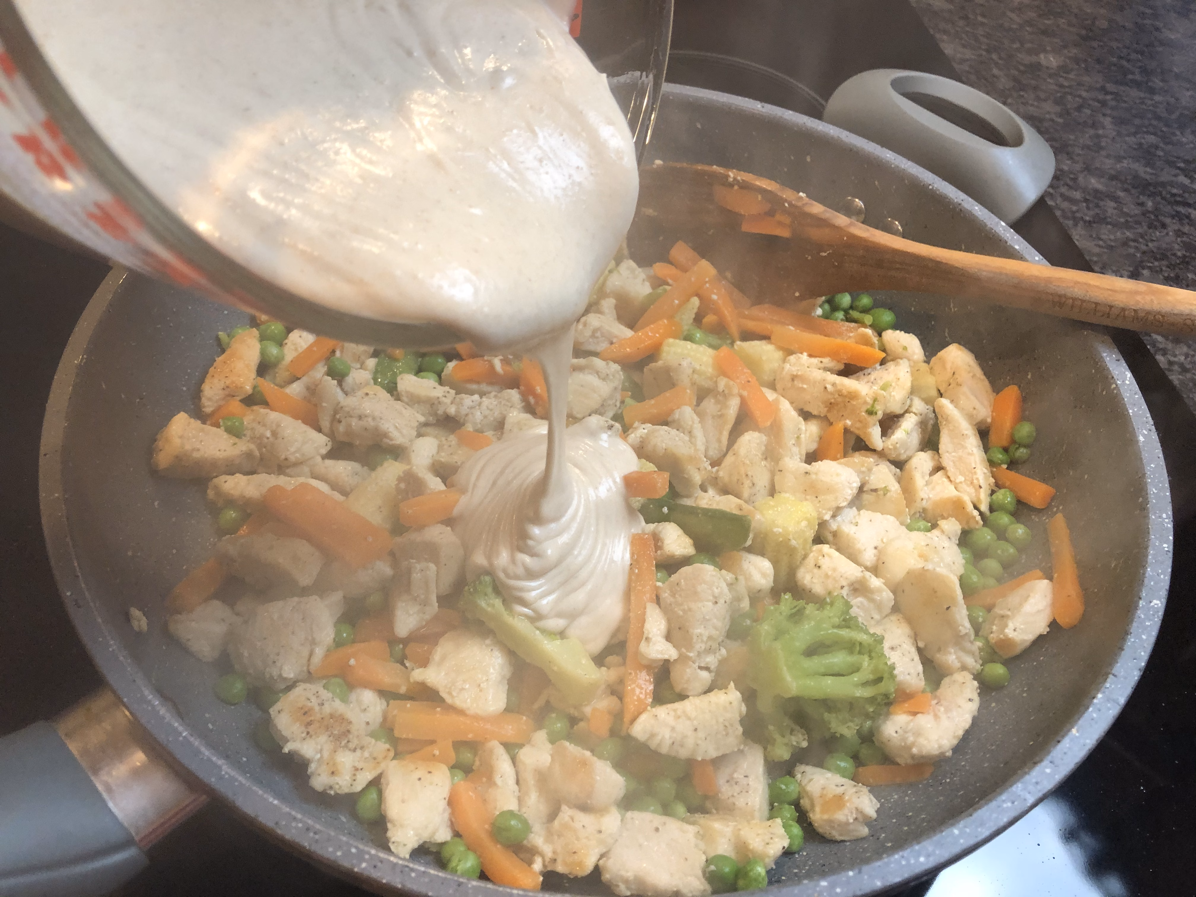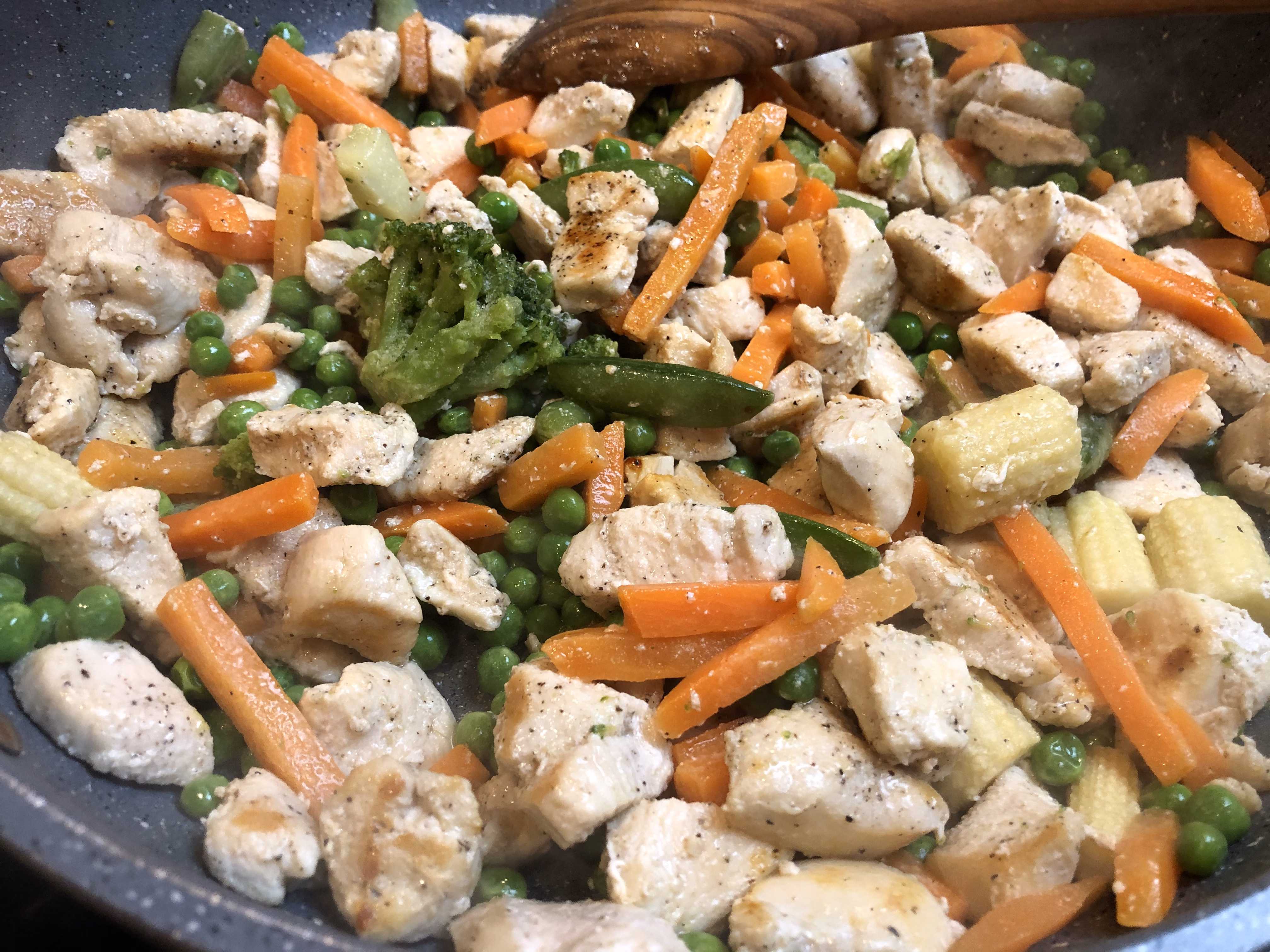Add the frozen vegetables (desired amount - I use a bag of stir-fry veggies and 1/2 cup frozen peas). Cook and stir for another 5 minutes or until vegetables are heated through.