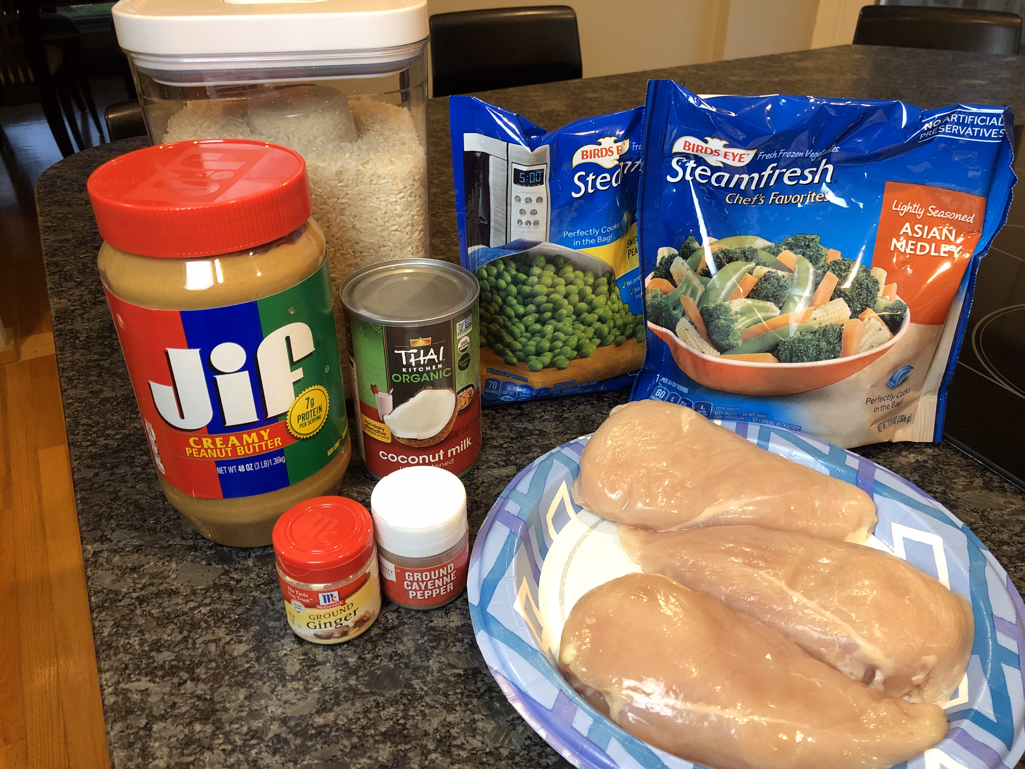 Gather your ingredients. You will need chicken, peanut butter, coconut milk, frozen vegetables, ginger, cayenne pepper, salt and pepper, and either rice or ramen.