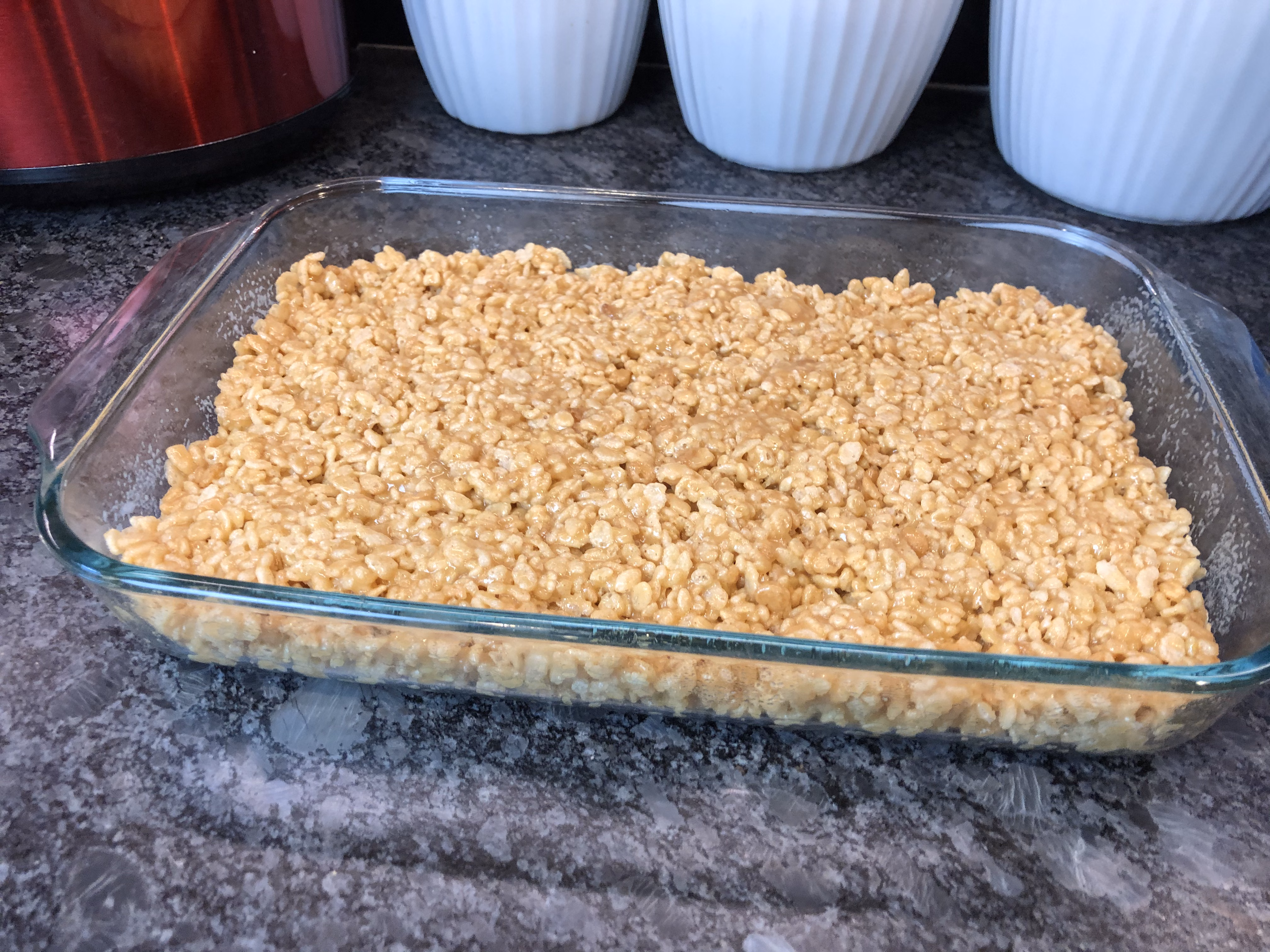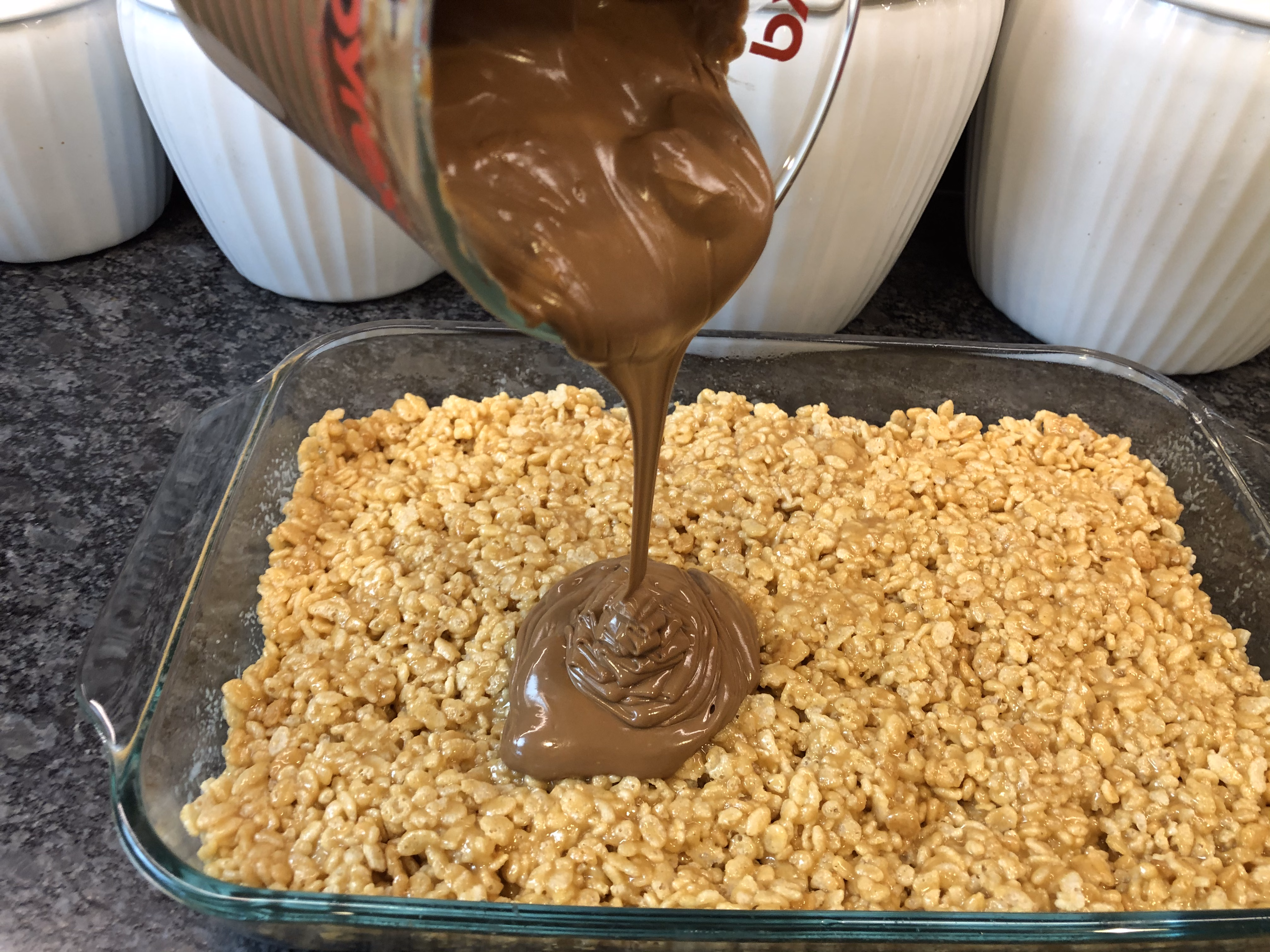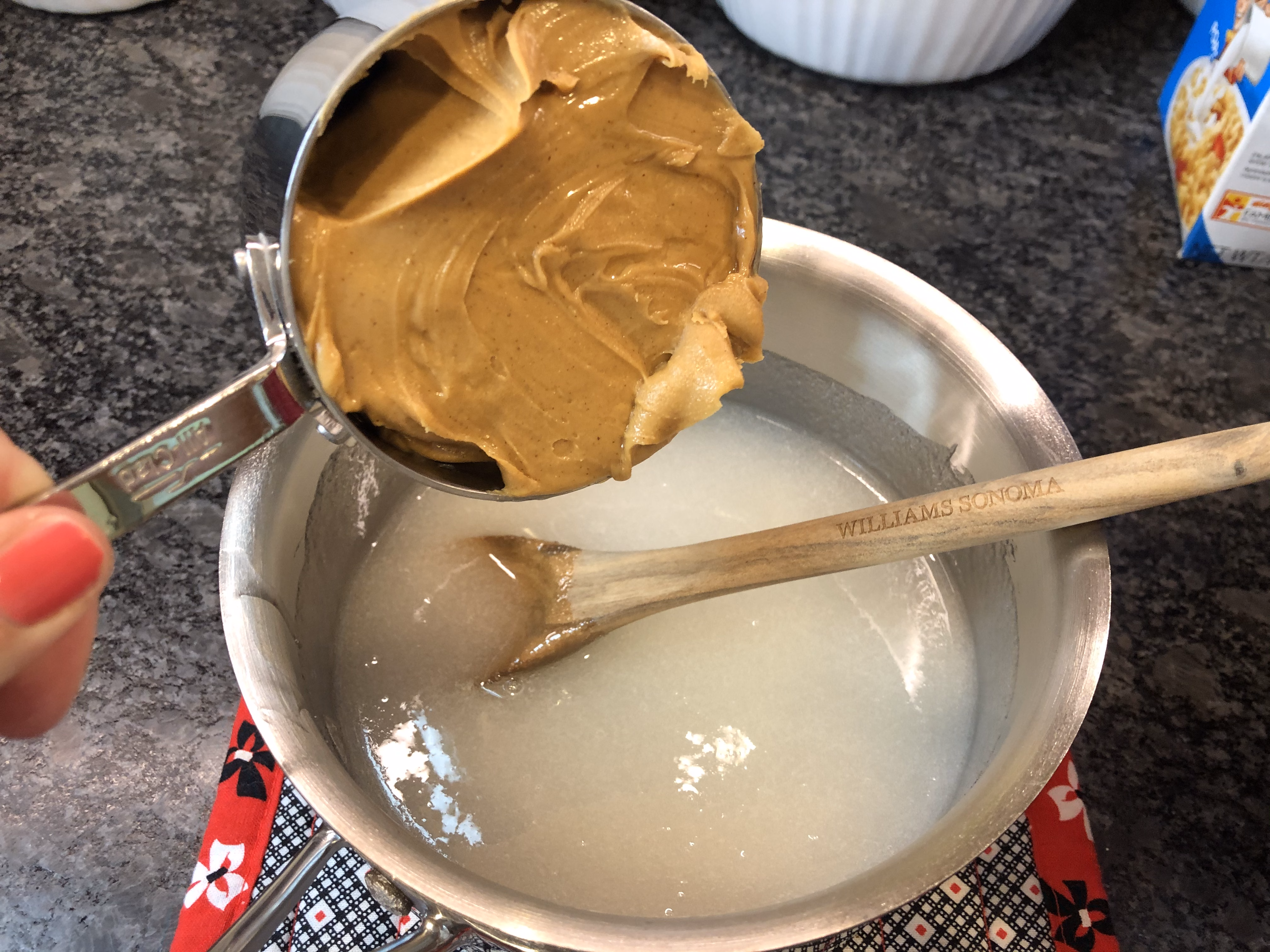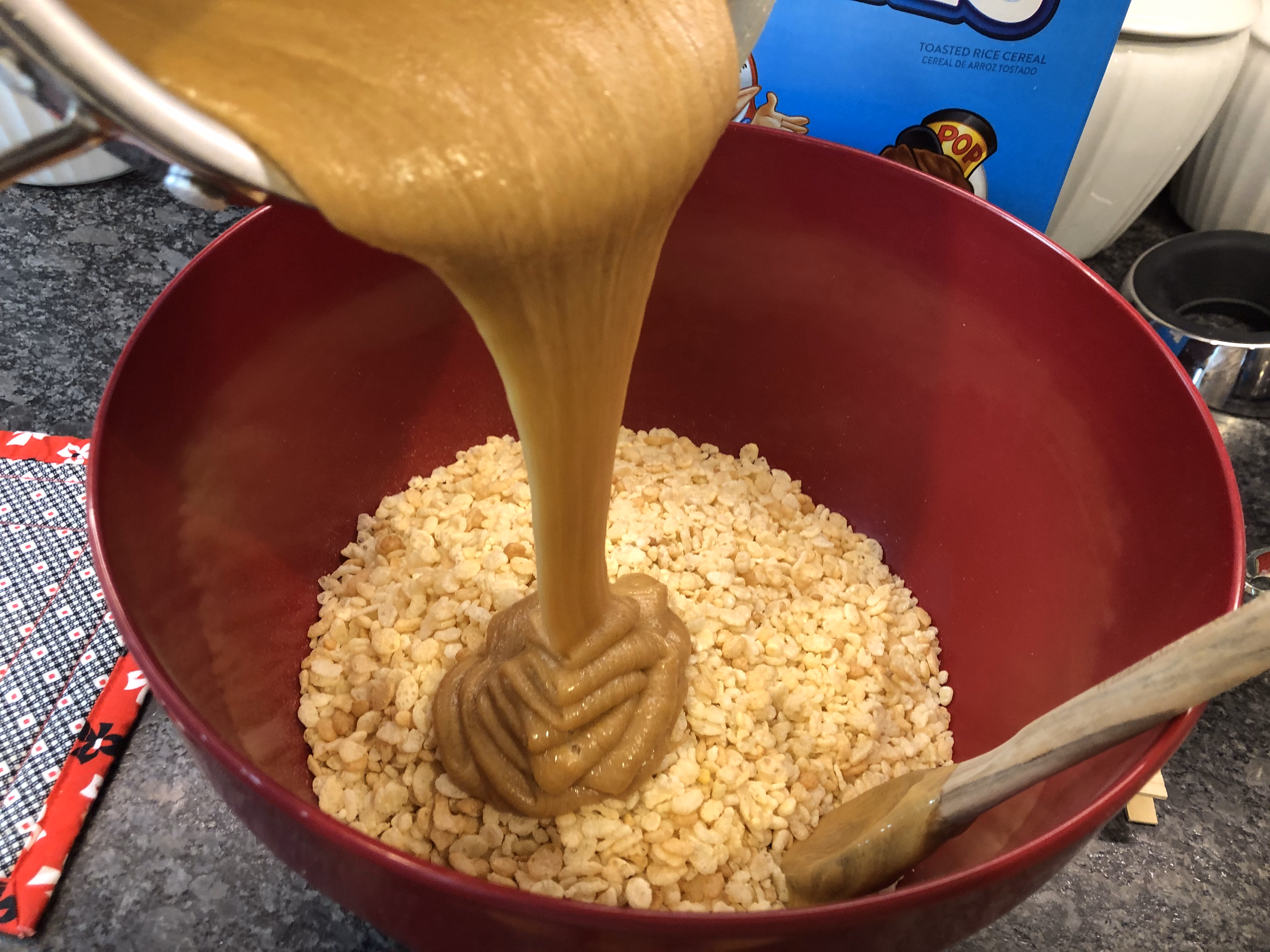 Measure 6 cups crisp rice cereal into a large mixing bowl. Pour the peanut butter mixture over the cereal and stir until it is all evenly coated.