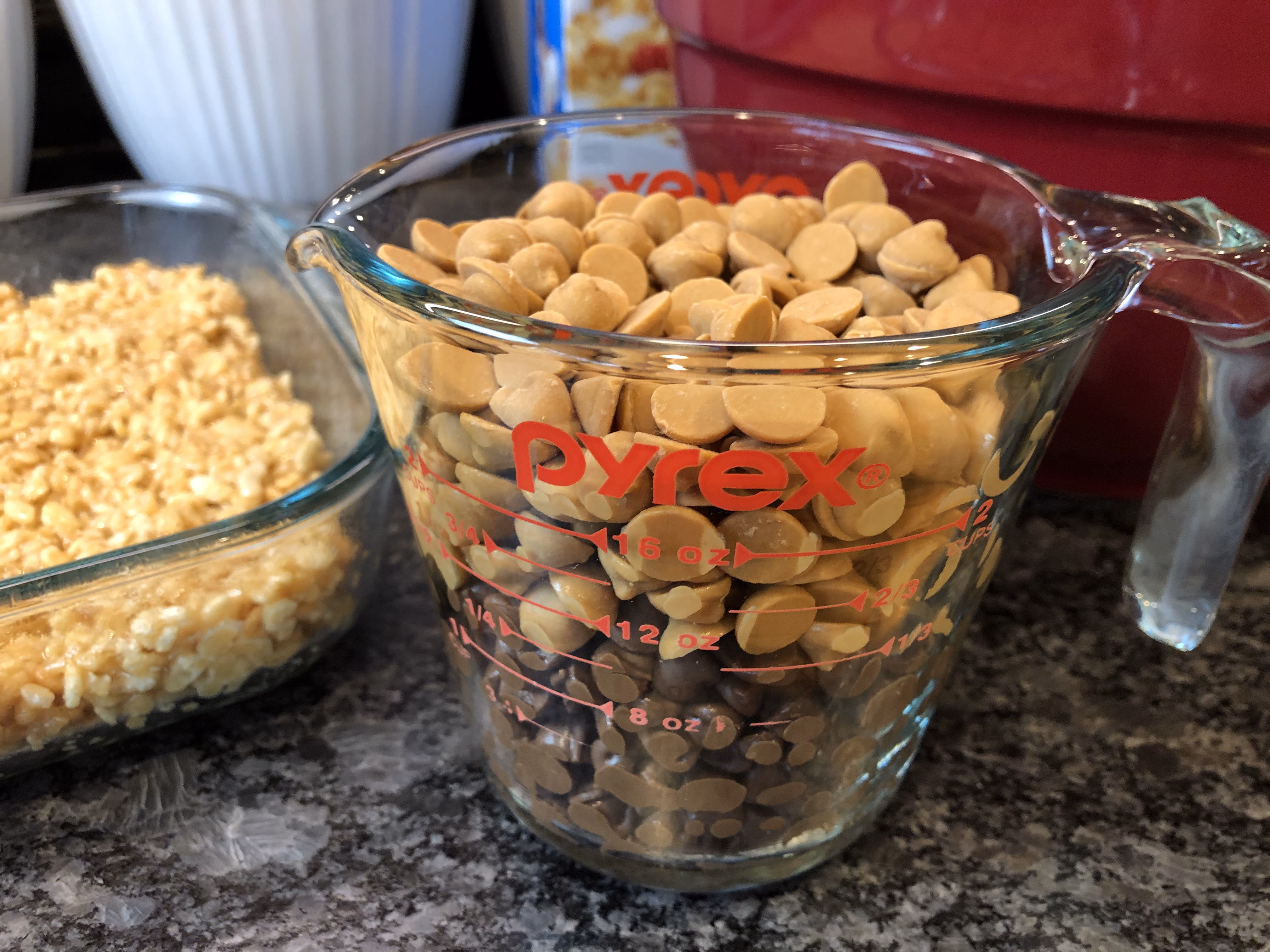 Gather your ingredients. You will need gluten free crisp rice cereal, light corn syrup, sugar, peanut butter, chocolate chips, and butterscotch chips.
