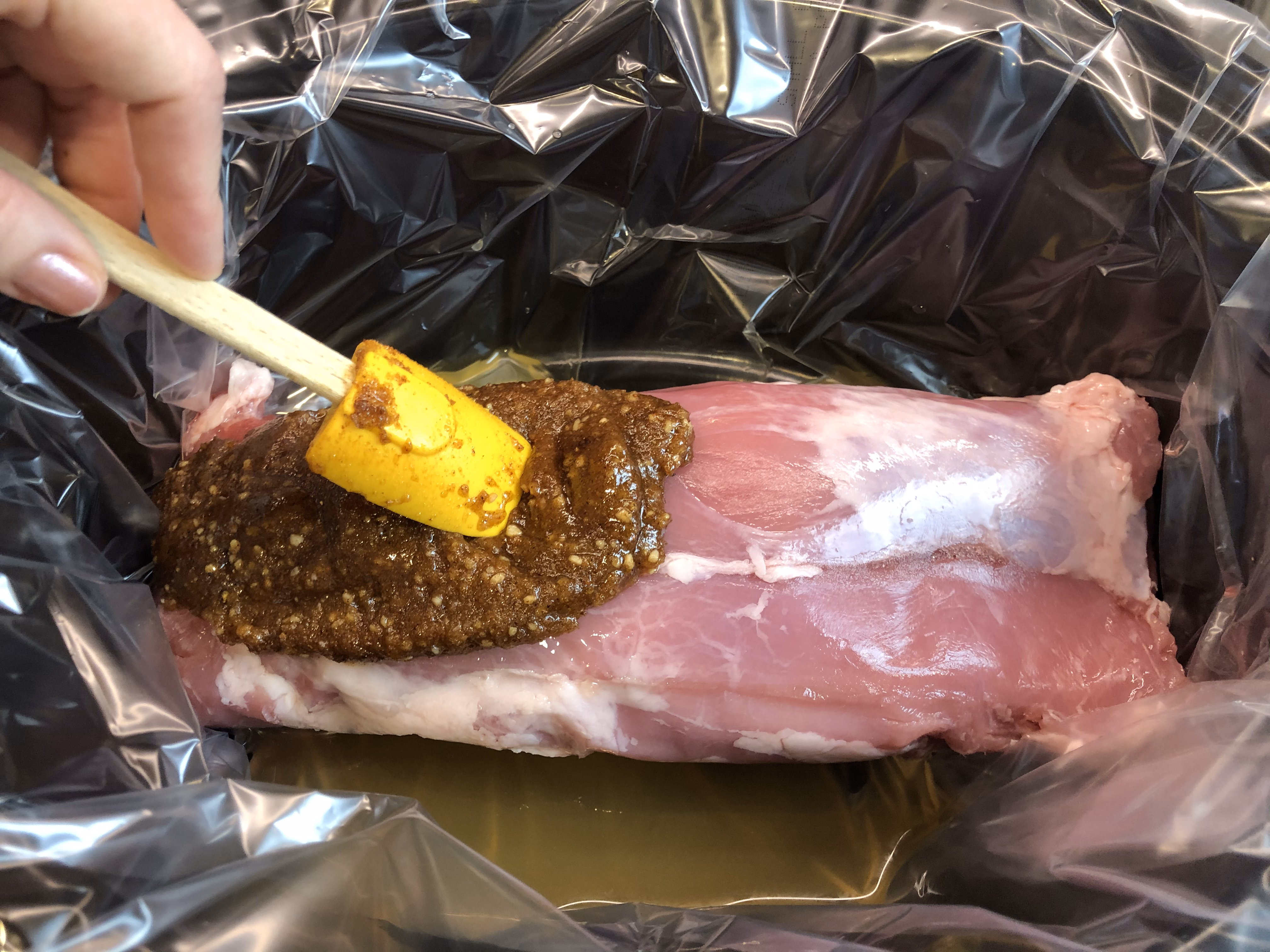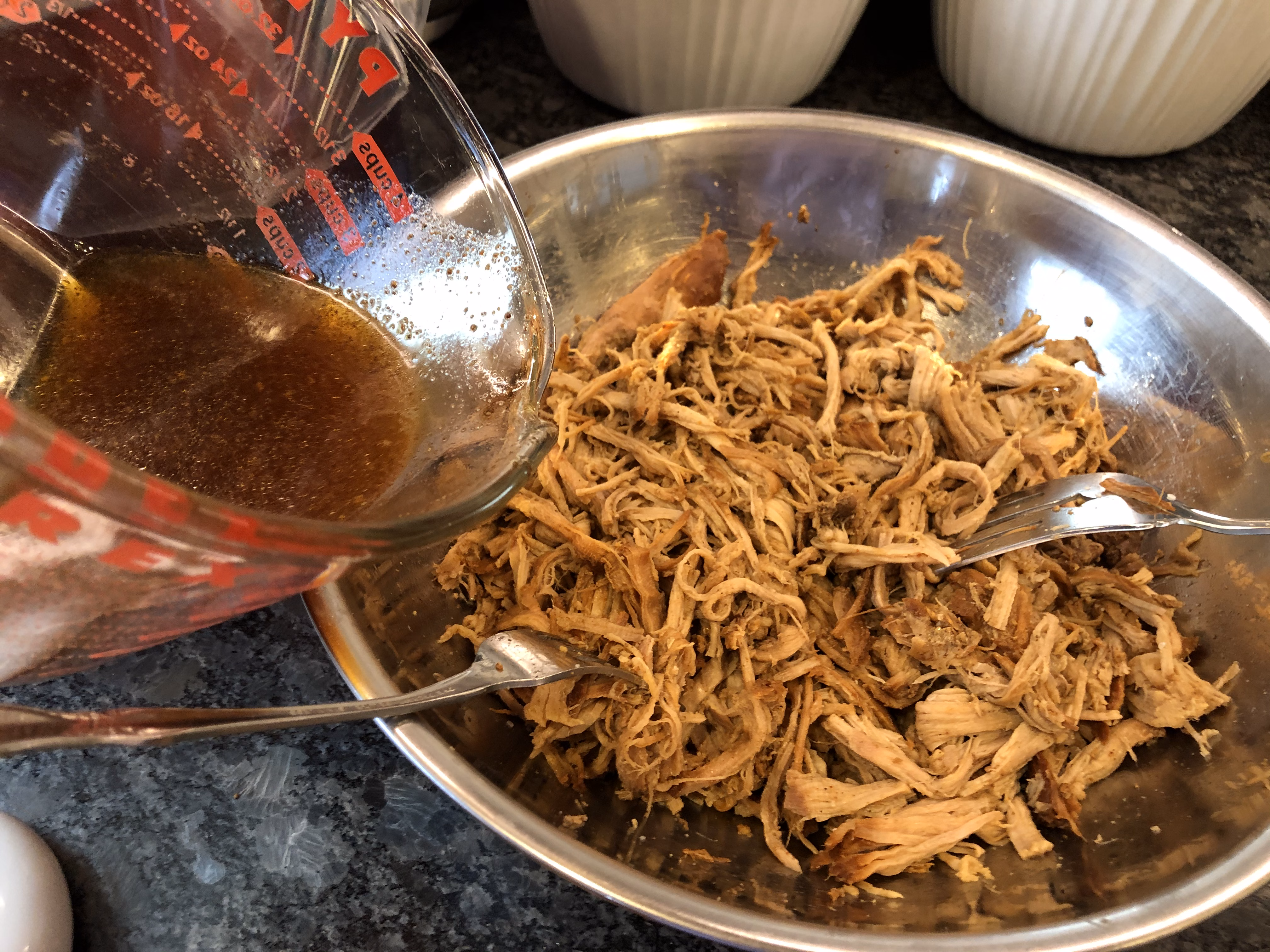 Moisten the pork with desired amount of juice to add moisture and flavor.
