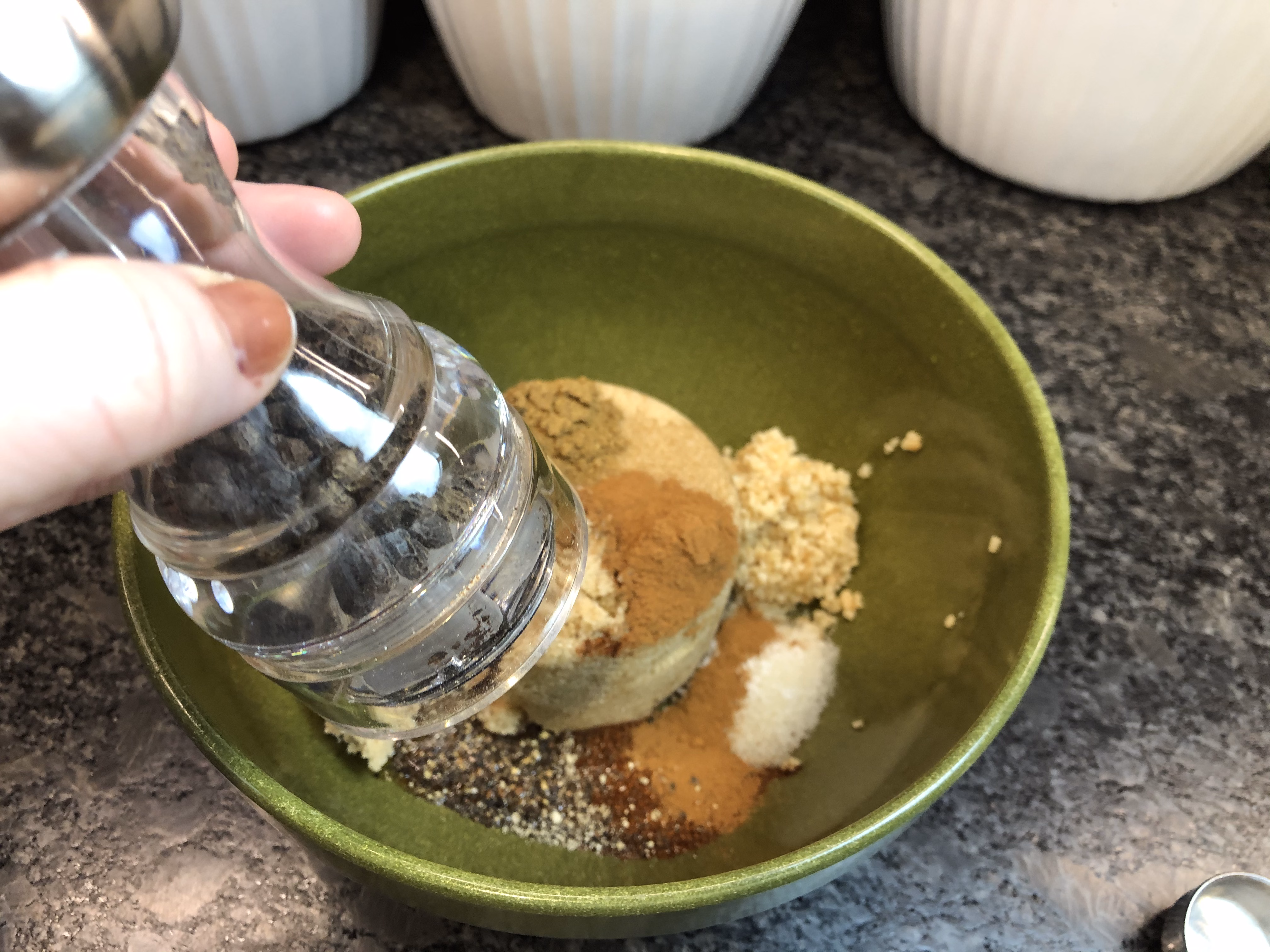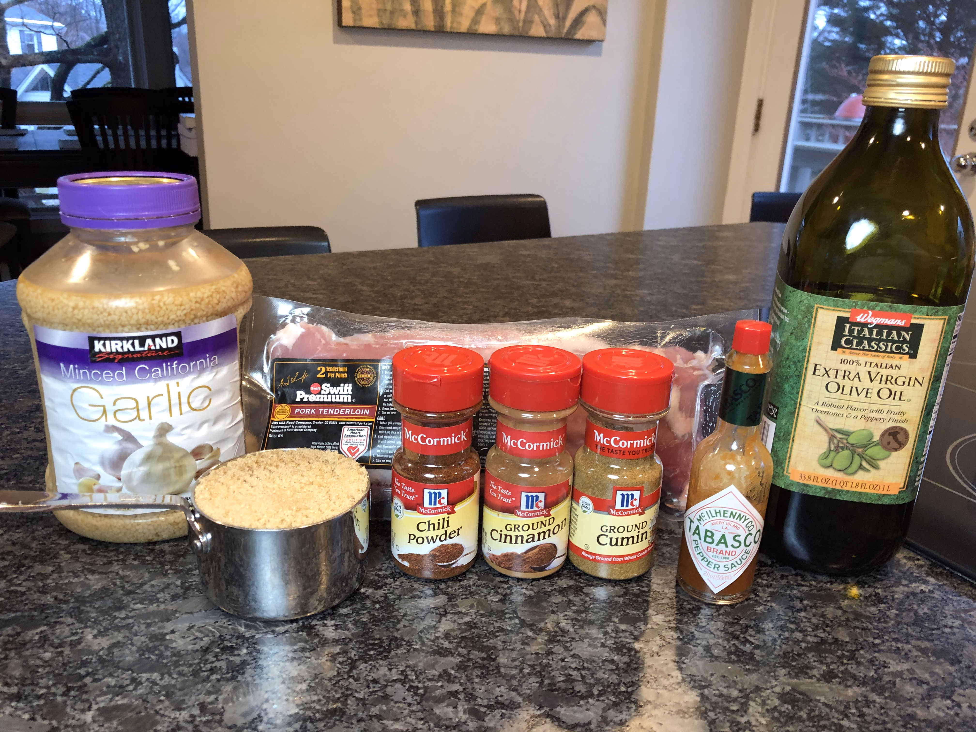 Gather your ingredients. You'll need 2 pork tenderloins (the Costco packs contain two in them), brown sugar, minced garlic, salt, cumin, chili powder, Tabasco sauce, cinnamon, ground pepper and olive oil.