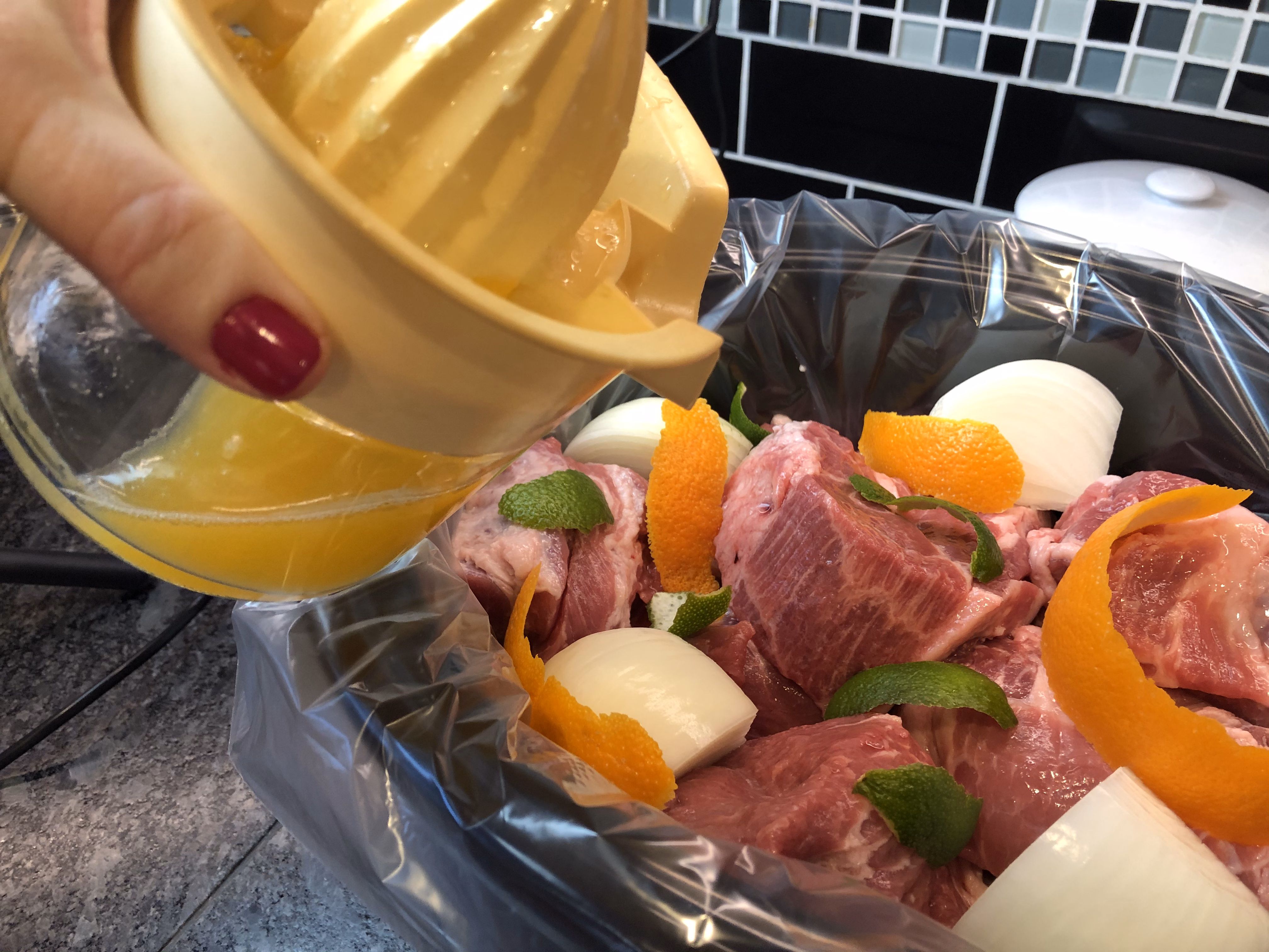 Juice your orange and lime that you just stripped and pour the juices over the roast.