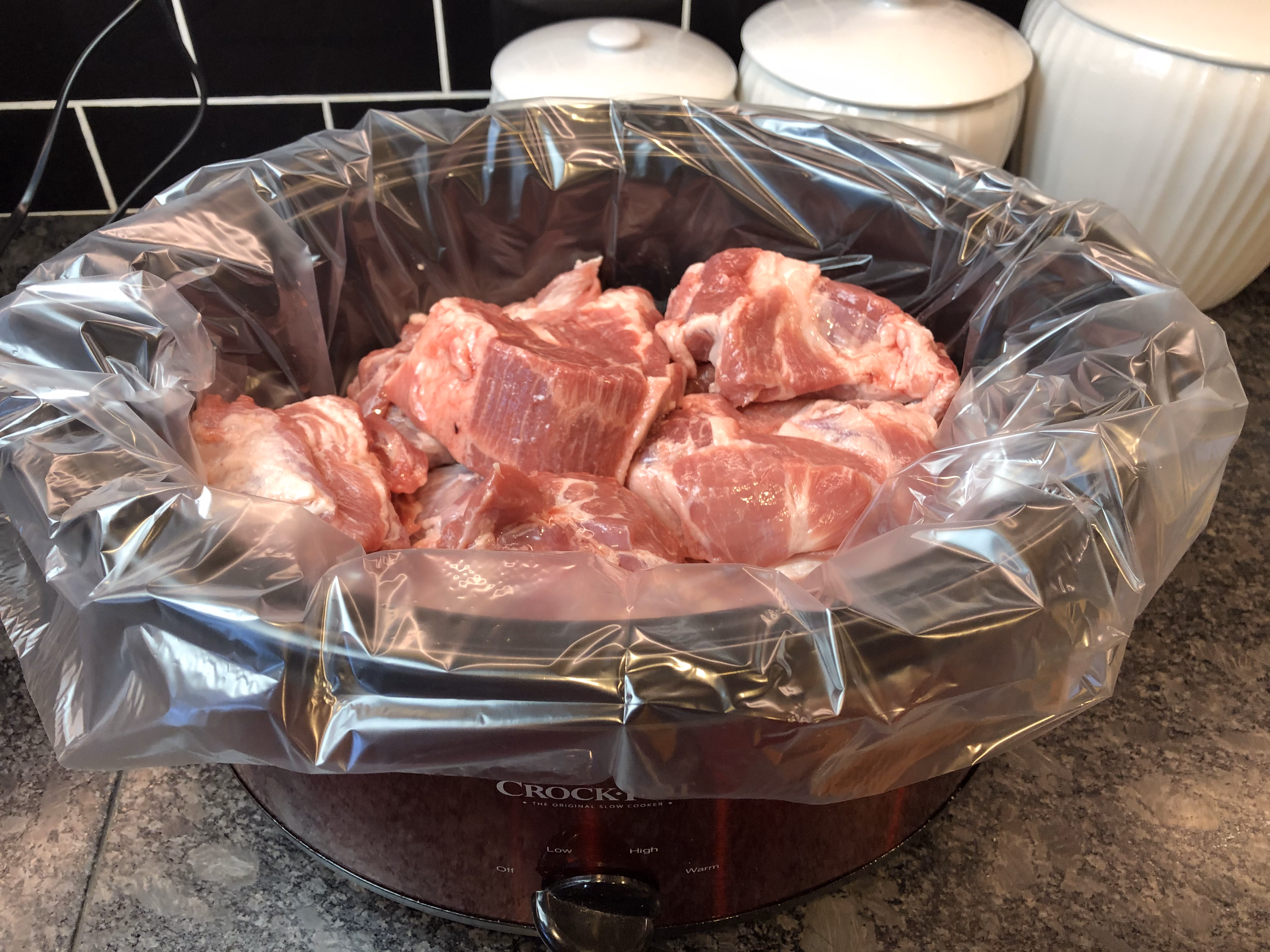 Cut the pork roast into big chunks, cutting the extra big pieces of fat off. I use my kitchen shears for this. Place into the slow cooker.
