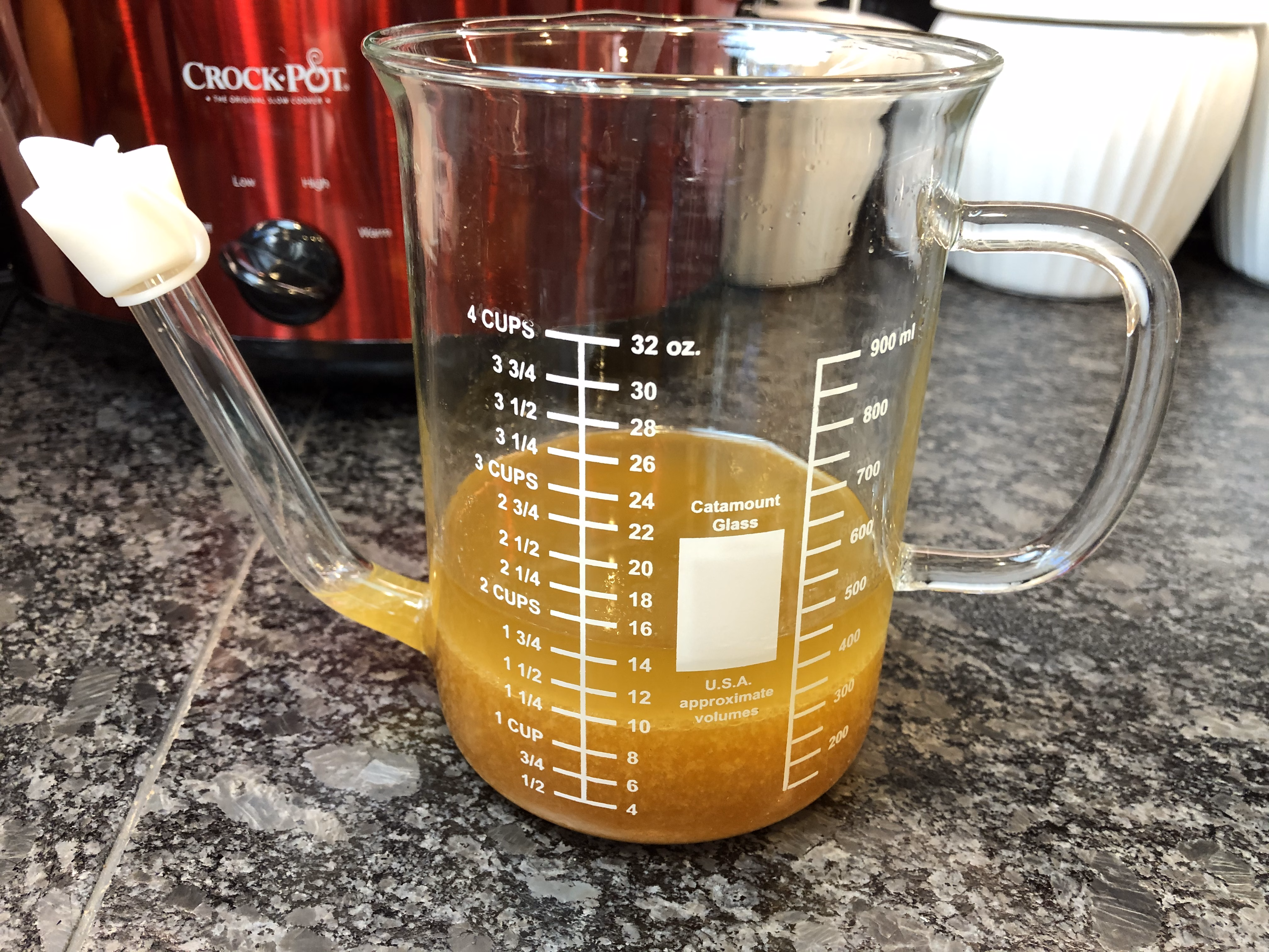 Retrieve some of the delicious juices by using a gravy separator (like I do here) or a strainer over a glass measuring cup. You don't necessarily need to dump the whole hot pot of leftovers. I usually just scoop out a bunch of juice and pour it though a strainer over my glass measuring cup. You'll want at least a cup of meat juices.