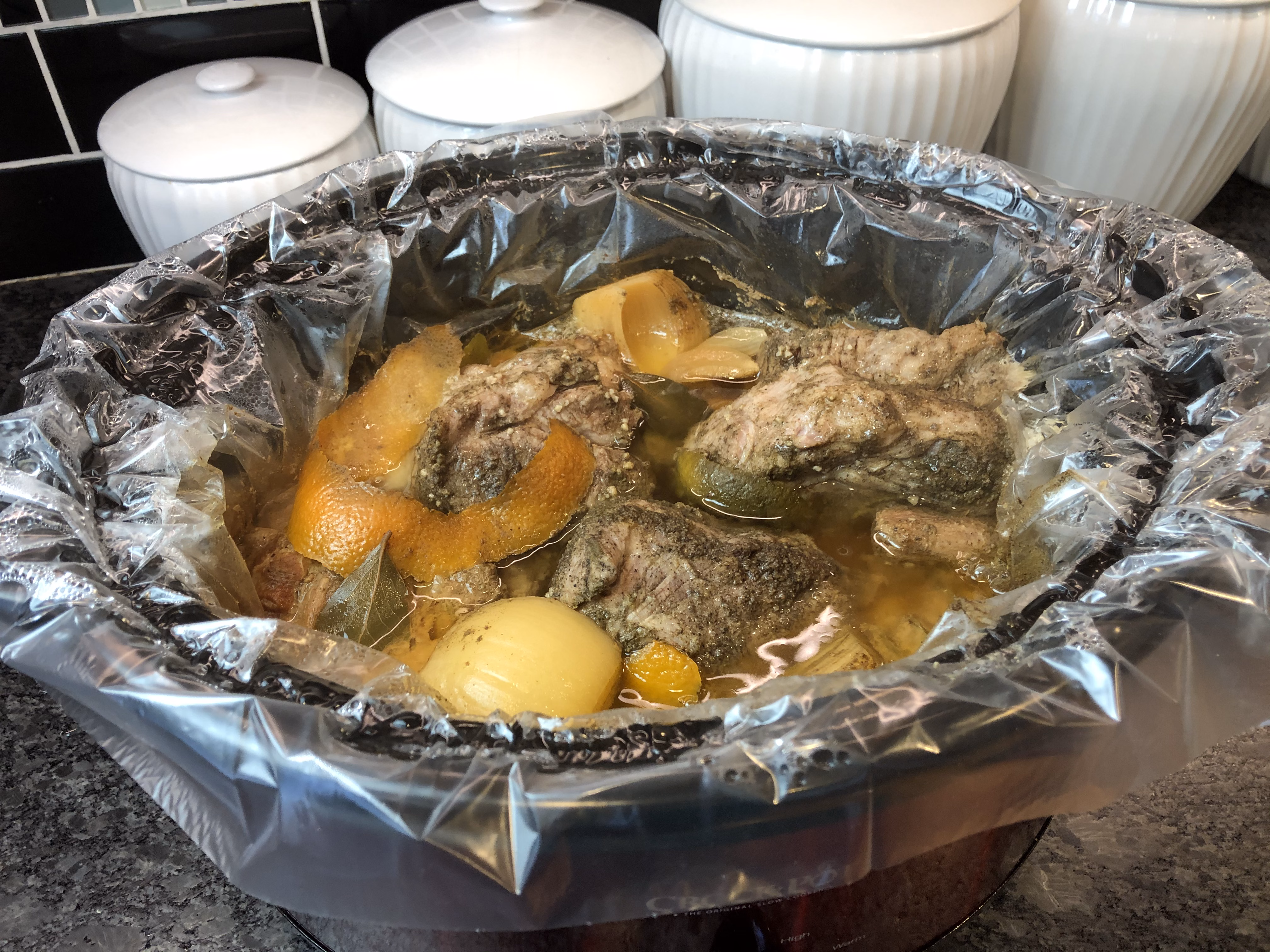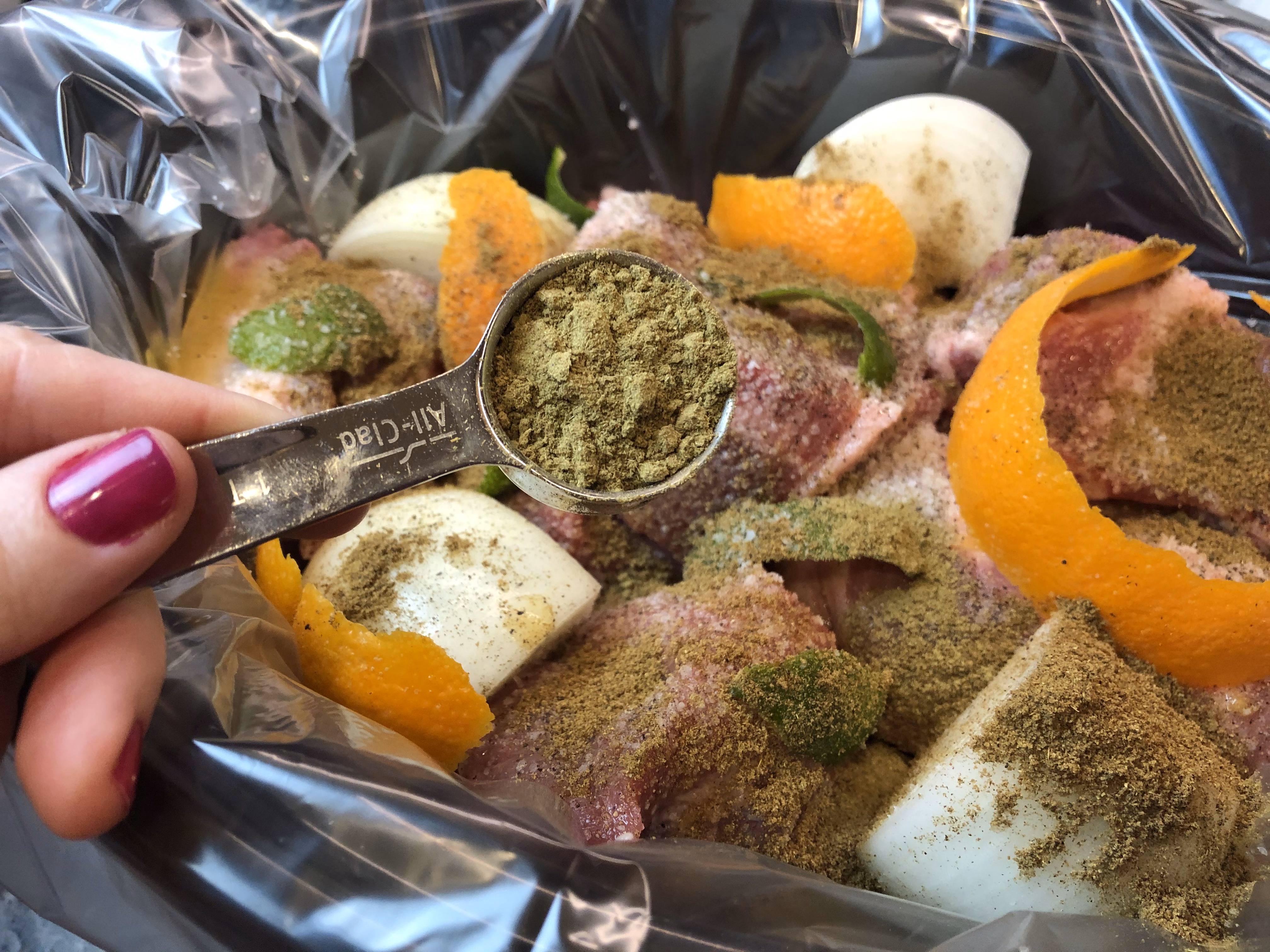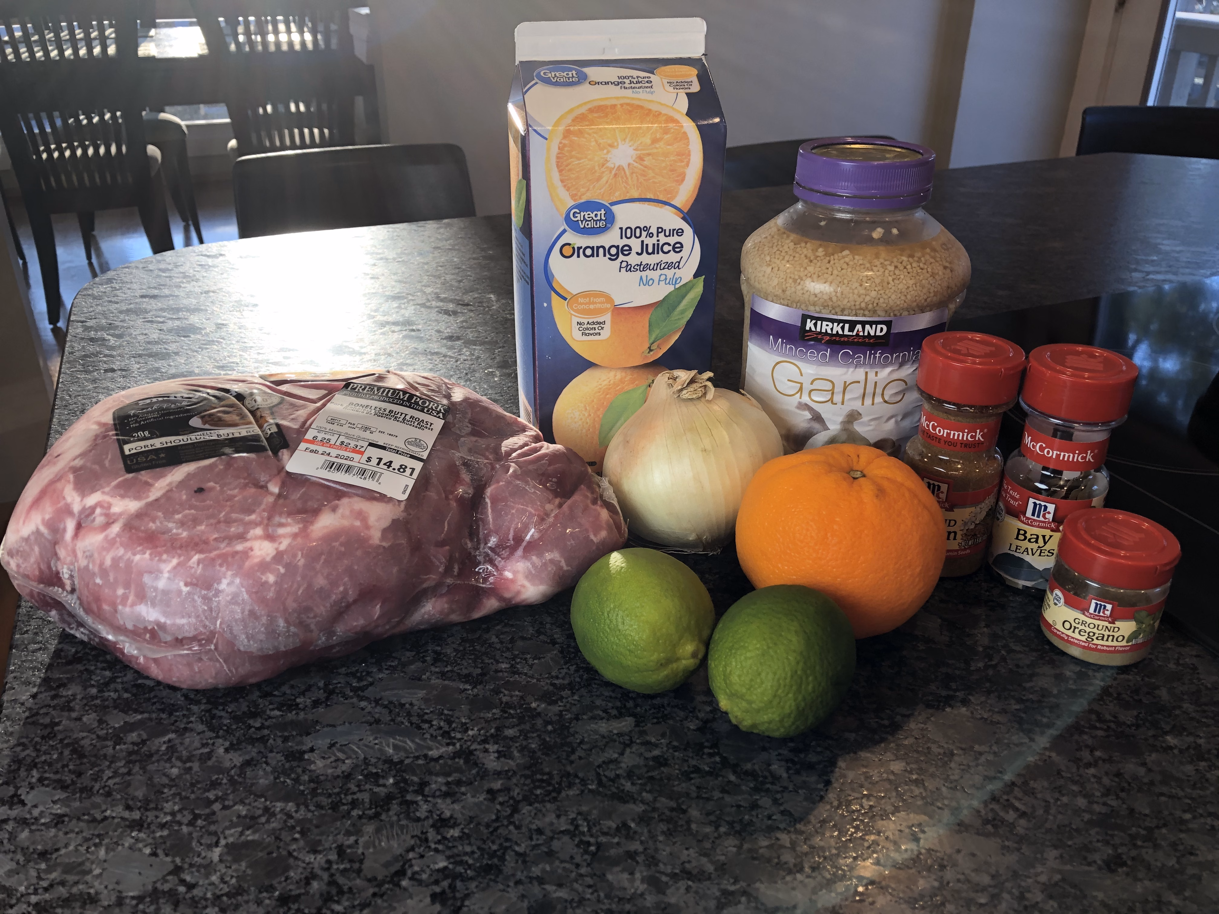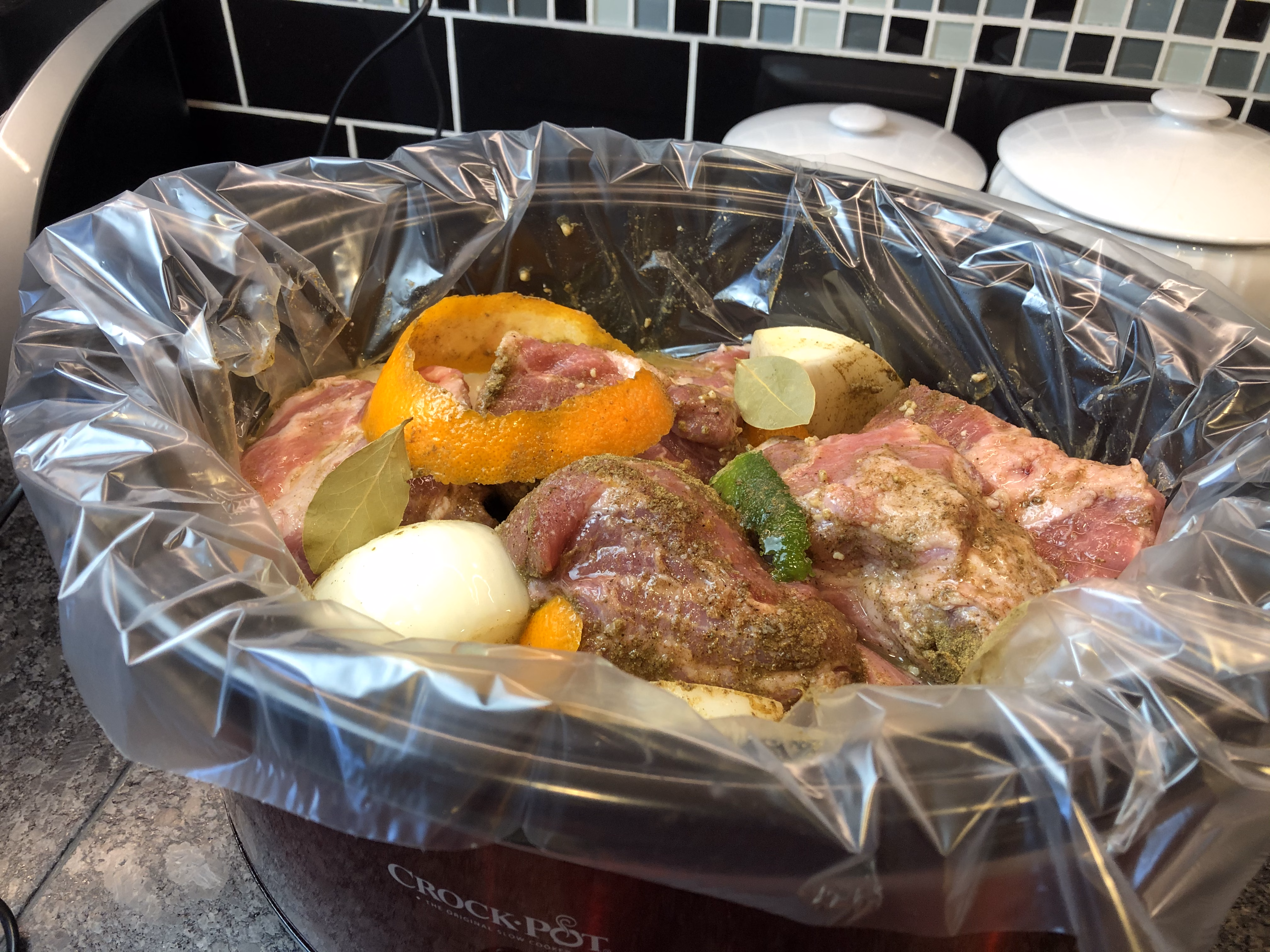 Gather all of your ingredients for the slow cooker. If you can, be sure to get the right cut of pork (butt or shoulder) as the fats marbled throughout add to the flavor and they will all be discarded at the end. I've made this with a tenderloin, and although still good, the pork butt is better. I have orange juice pictured here because I don't always get quite enough when I squeeze an orange, but that is optional.