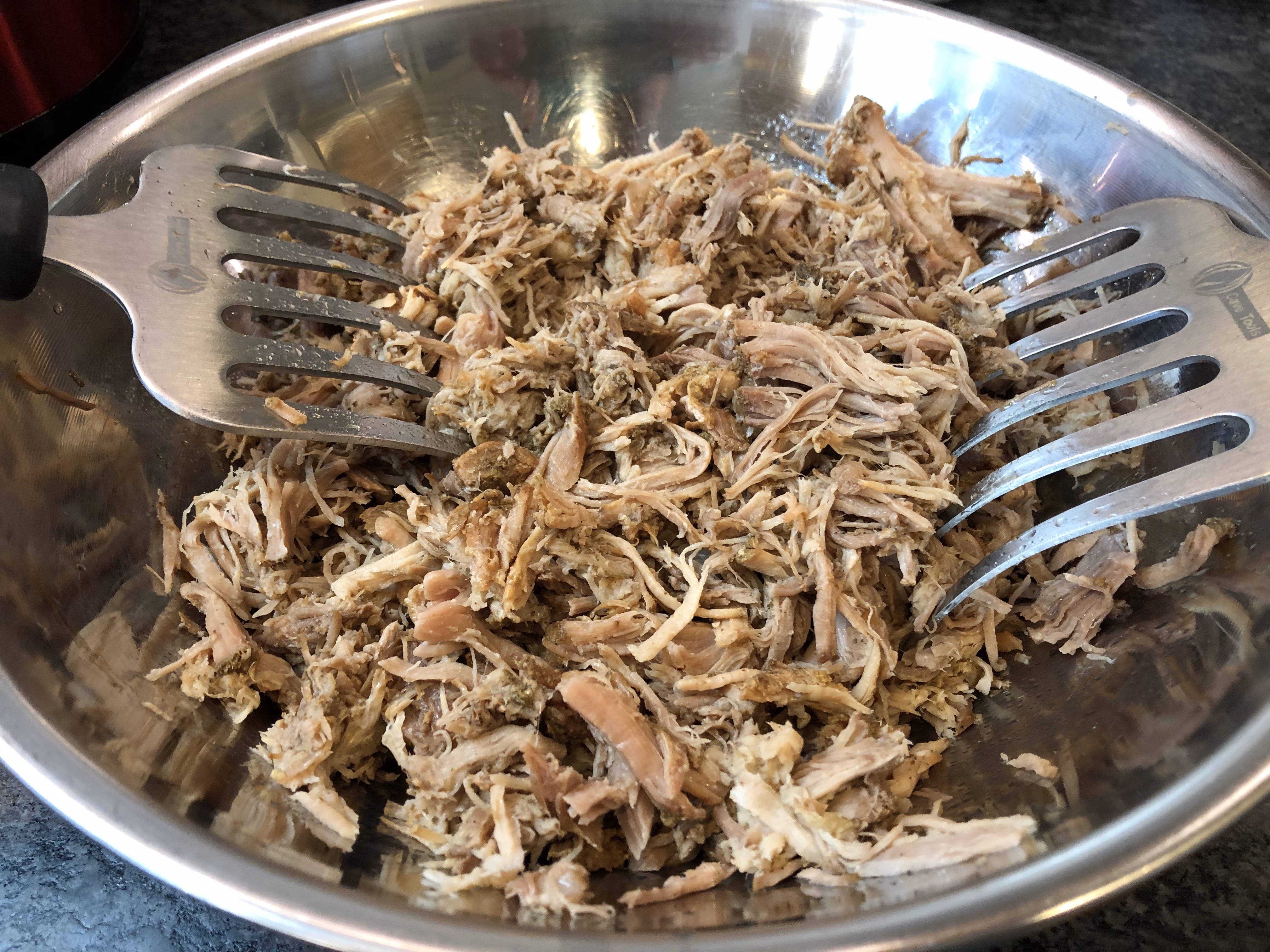 Carefully remove the pork to a bowl and using two forks, shred. My husband loves to smoke meat, so we've invested in these "meat rakes" and they are awesome!