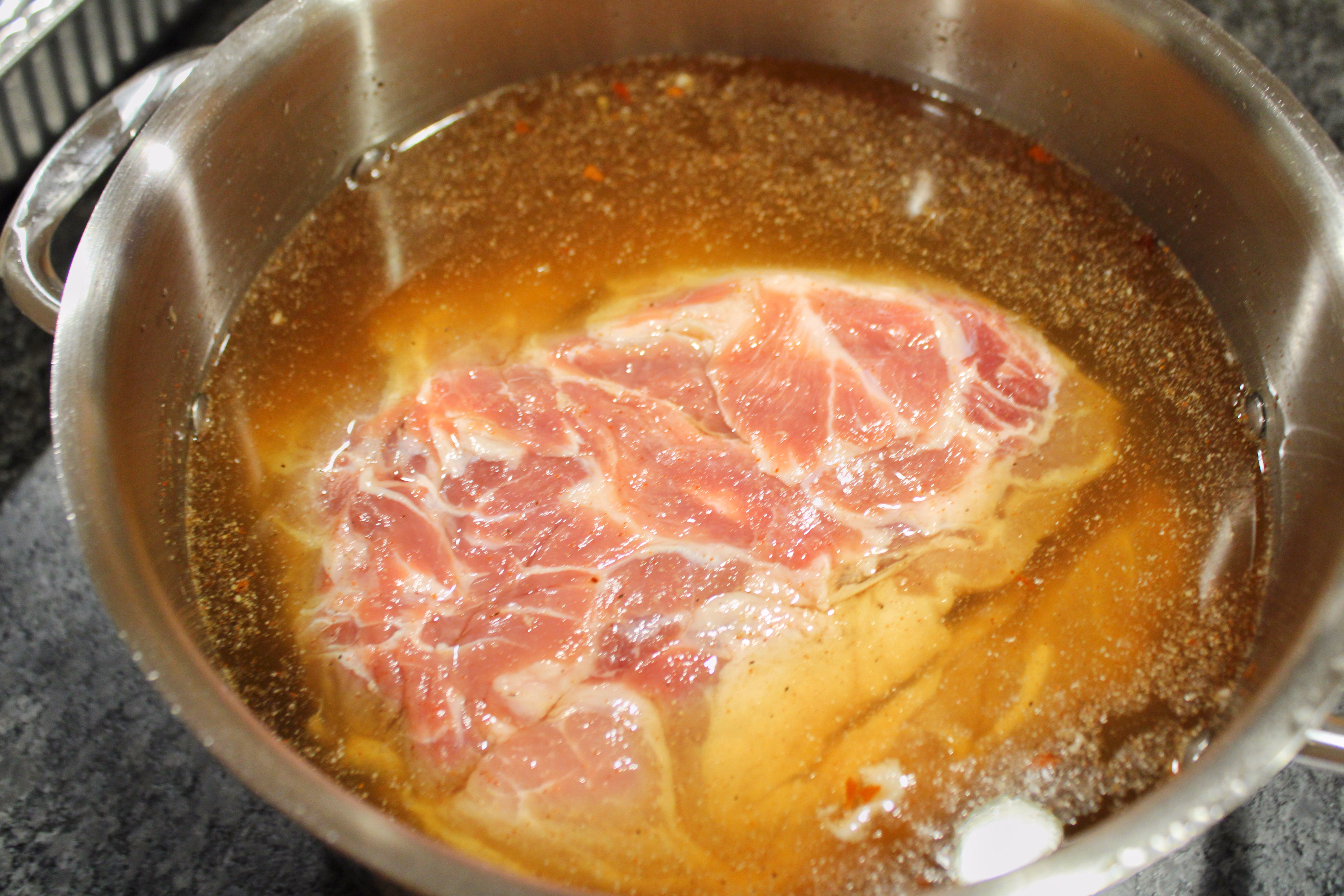 Rinse off the pork and add to a large stock pot. Pour in the apple juice and just enough water to cover the pork. Add the remaining brine ingredients and stir around the pork to mix. Put on the lid and refrigerate for 12-24 hours.