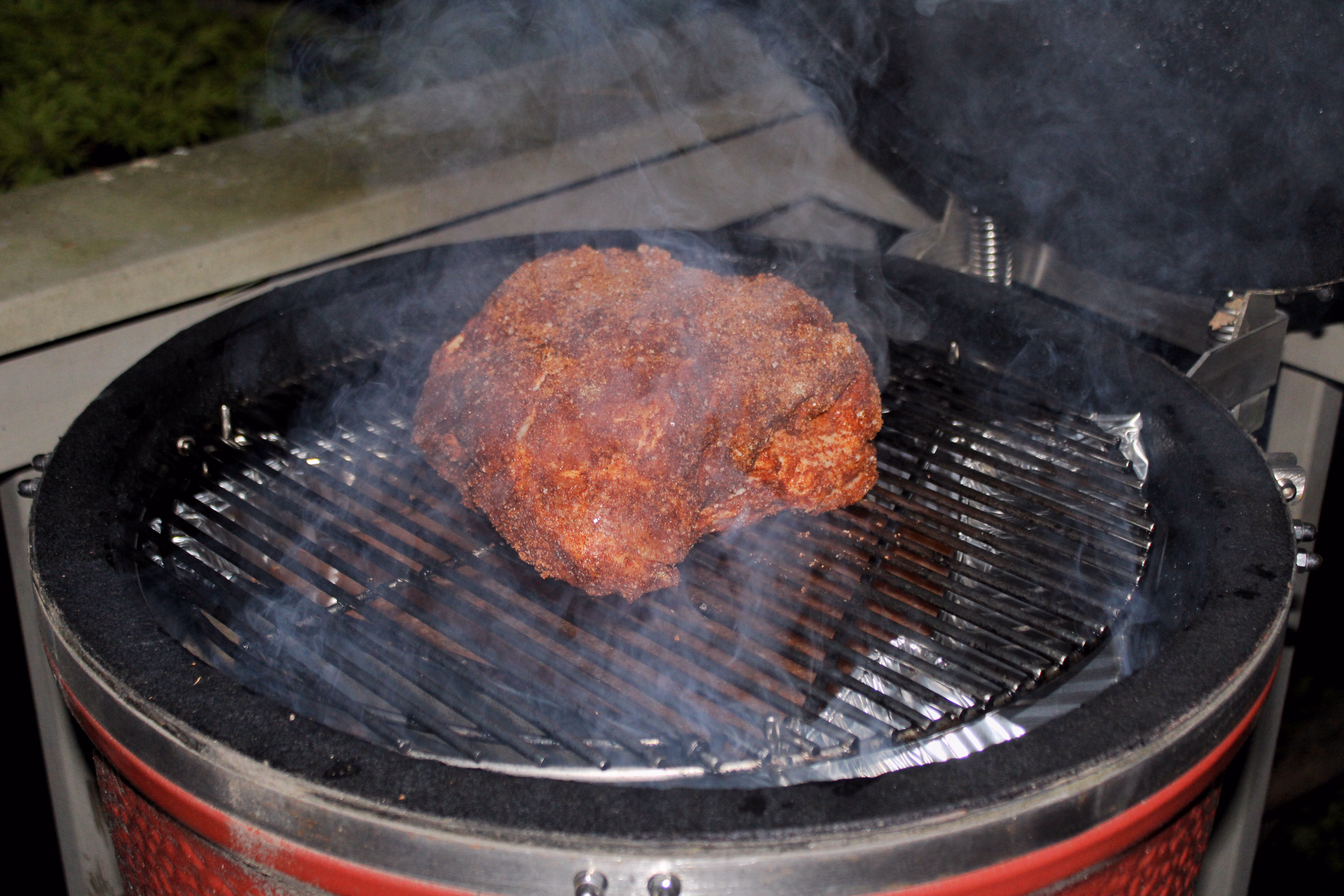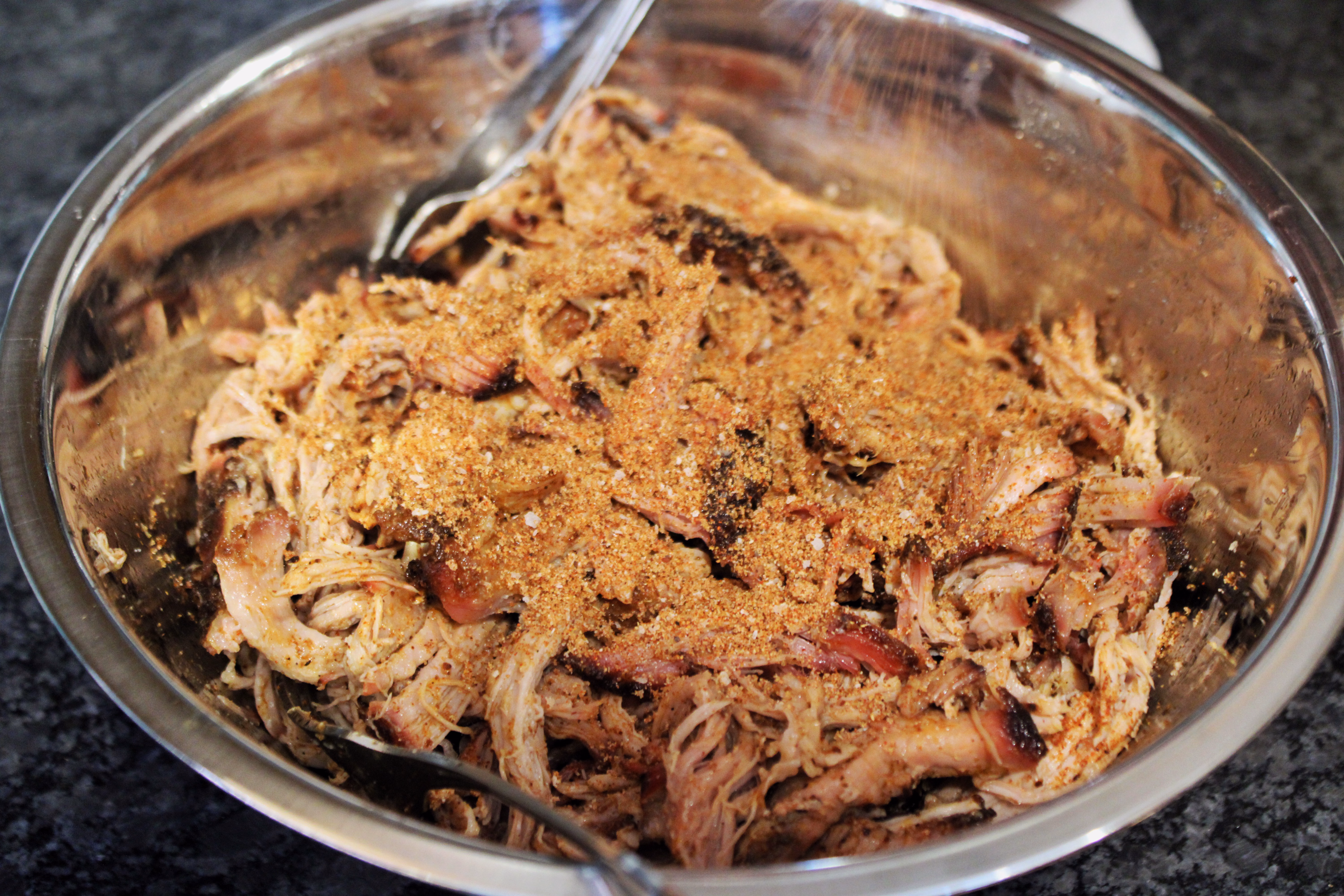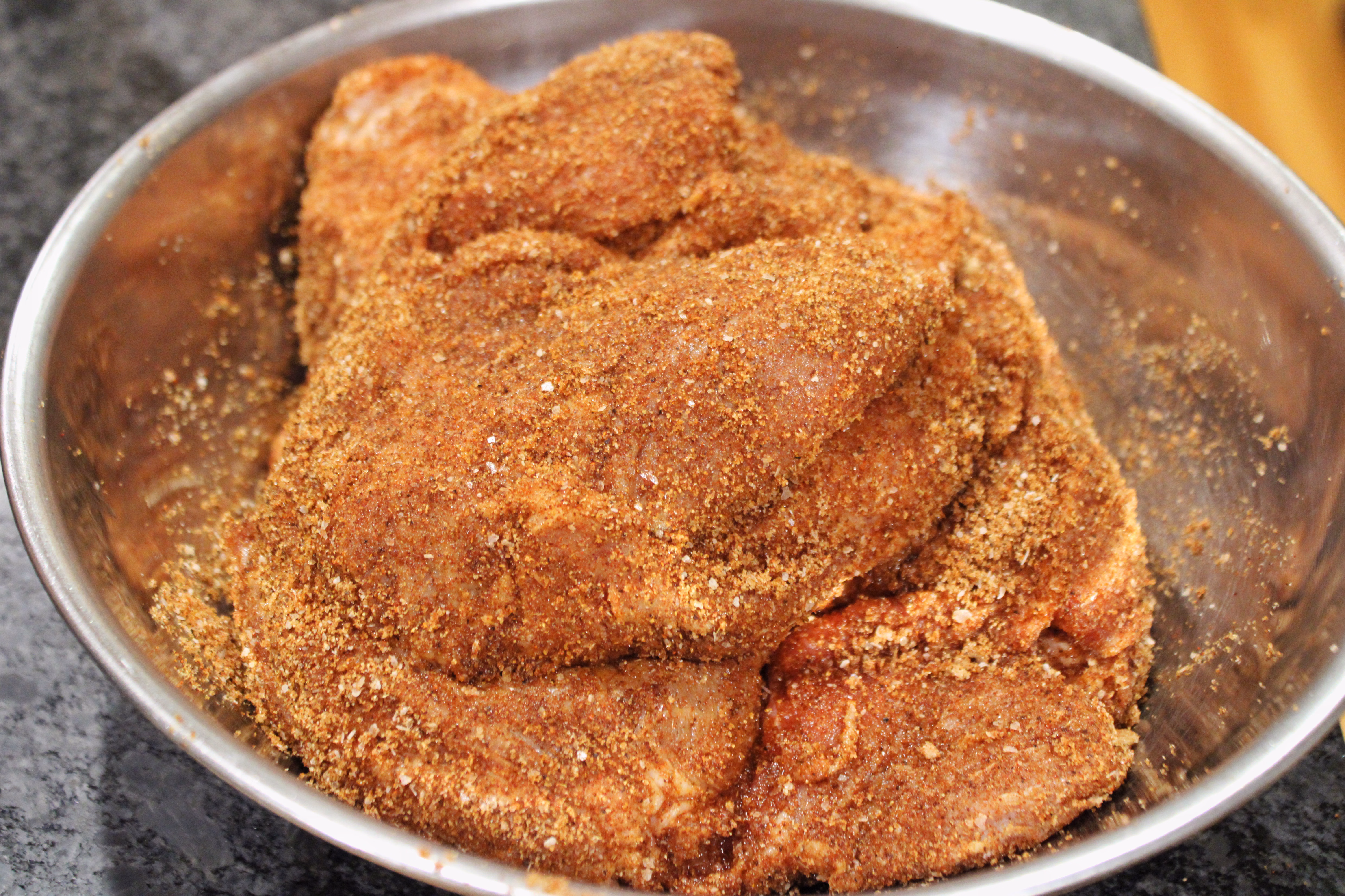 After brining, remove from the liquid (keep it if doing your pork in a smoker), pat dry with paper towels, and rub it with all of the dry rub except 2 tablespoons you need to save for later. Be sure to get it in all the cracks and folds.