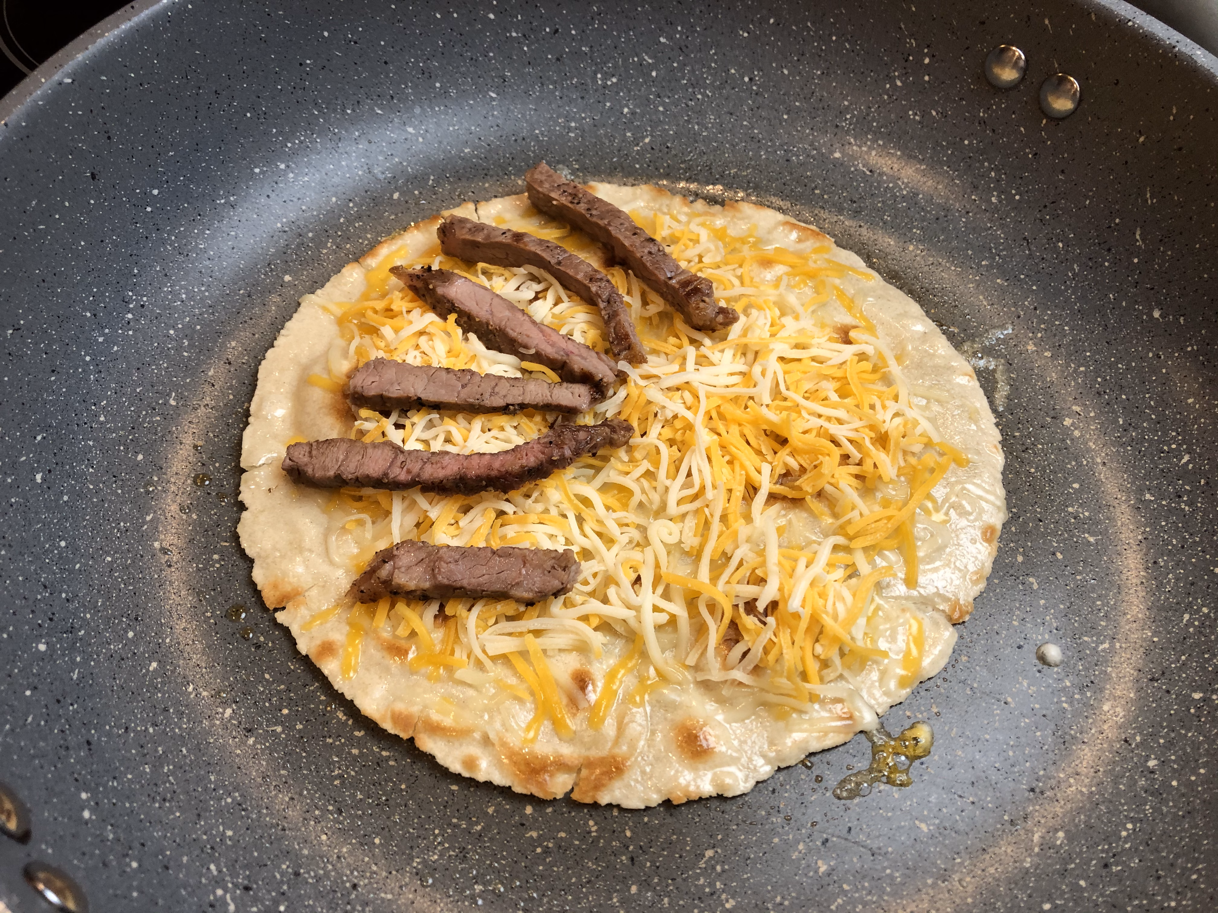 Now, cook your quesadillas. I let the tortilla warm in the pan a bit first, then sprinkle the whole thing with cheese, and cover half of it with the strips of steak.