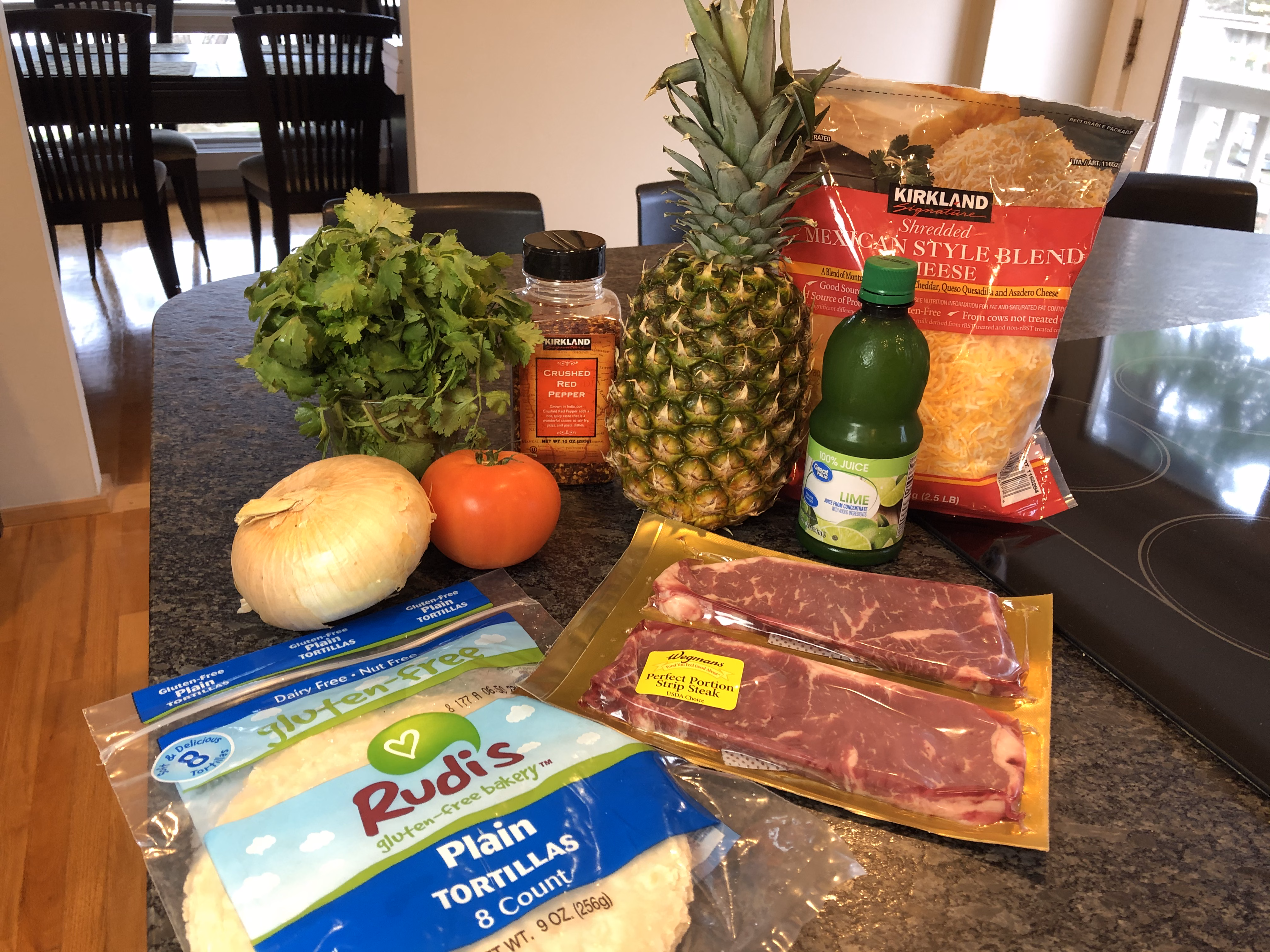 Gather your ingredients. You will need some sirloin steak (doesn't have to be anything to expensive or fancy..... I love the thin cut options), shredded Mexican cheese, gluten-free tortillas, a tomato, fresh pineapple, onion, cilantro, lime juice, olive oil, salt and pepper, and red pepper flakes.