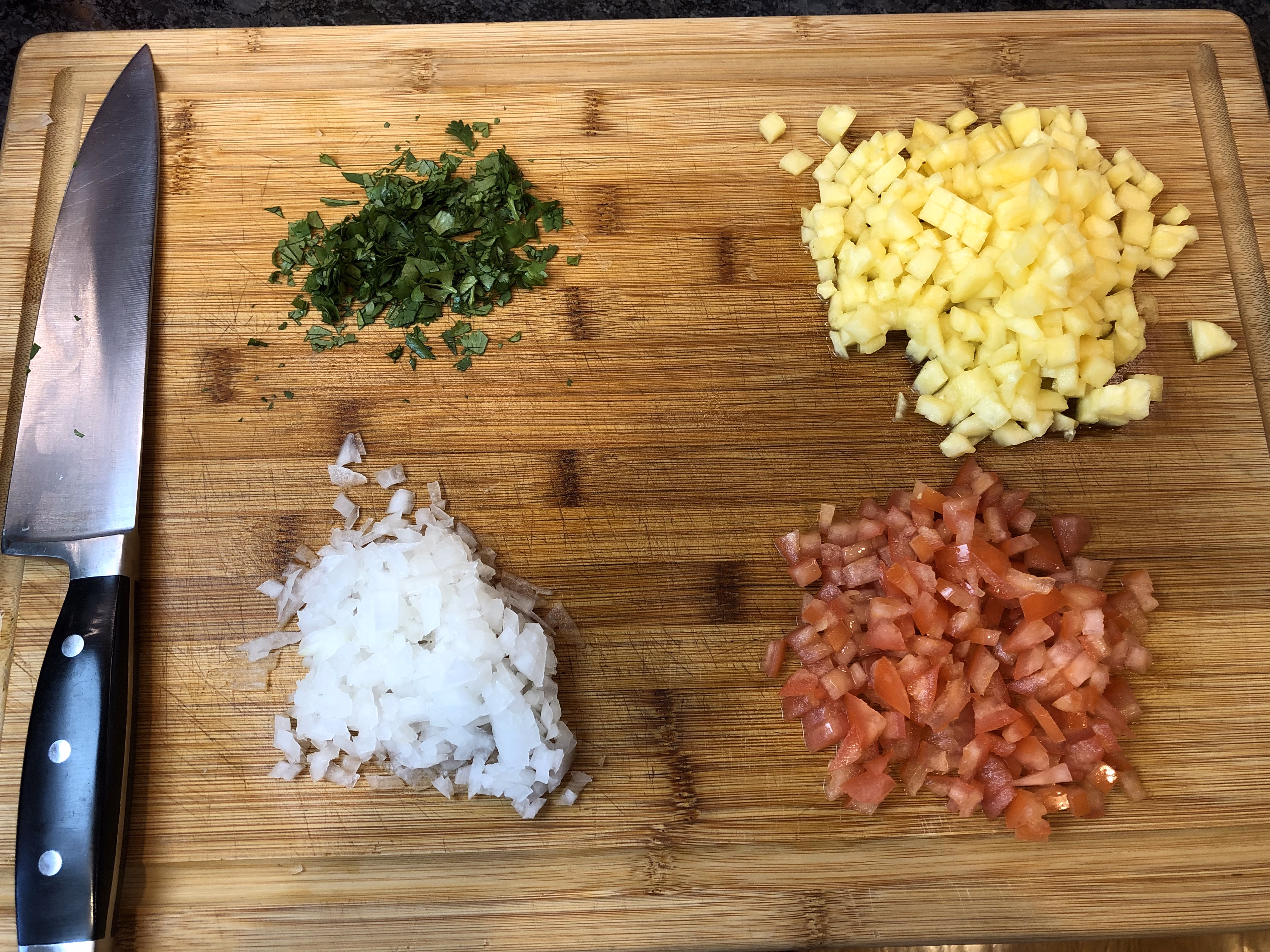 Chop the tomato, 1 1/2 cups fresh pineapple (you can save the remainder of the pineapple for something else), 1/2 cup onion, and 1/4 cup cilantro.