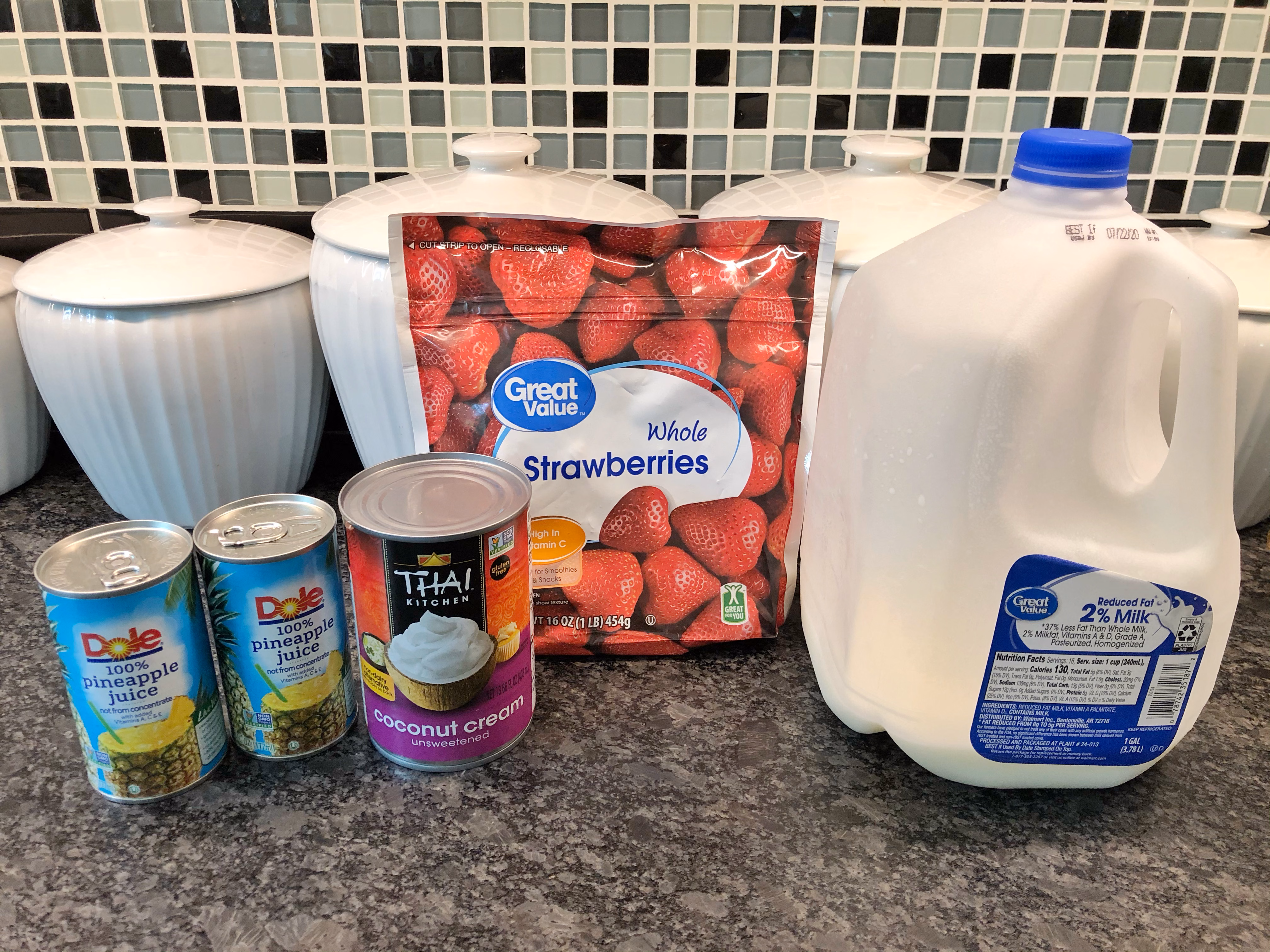 Gather your ingredients. You will need frozen strawberries, pineapple juice, coconut cream, milk, sugar, water, and ice.