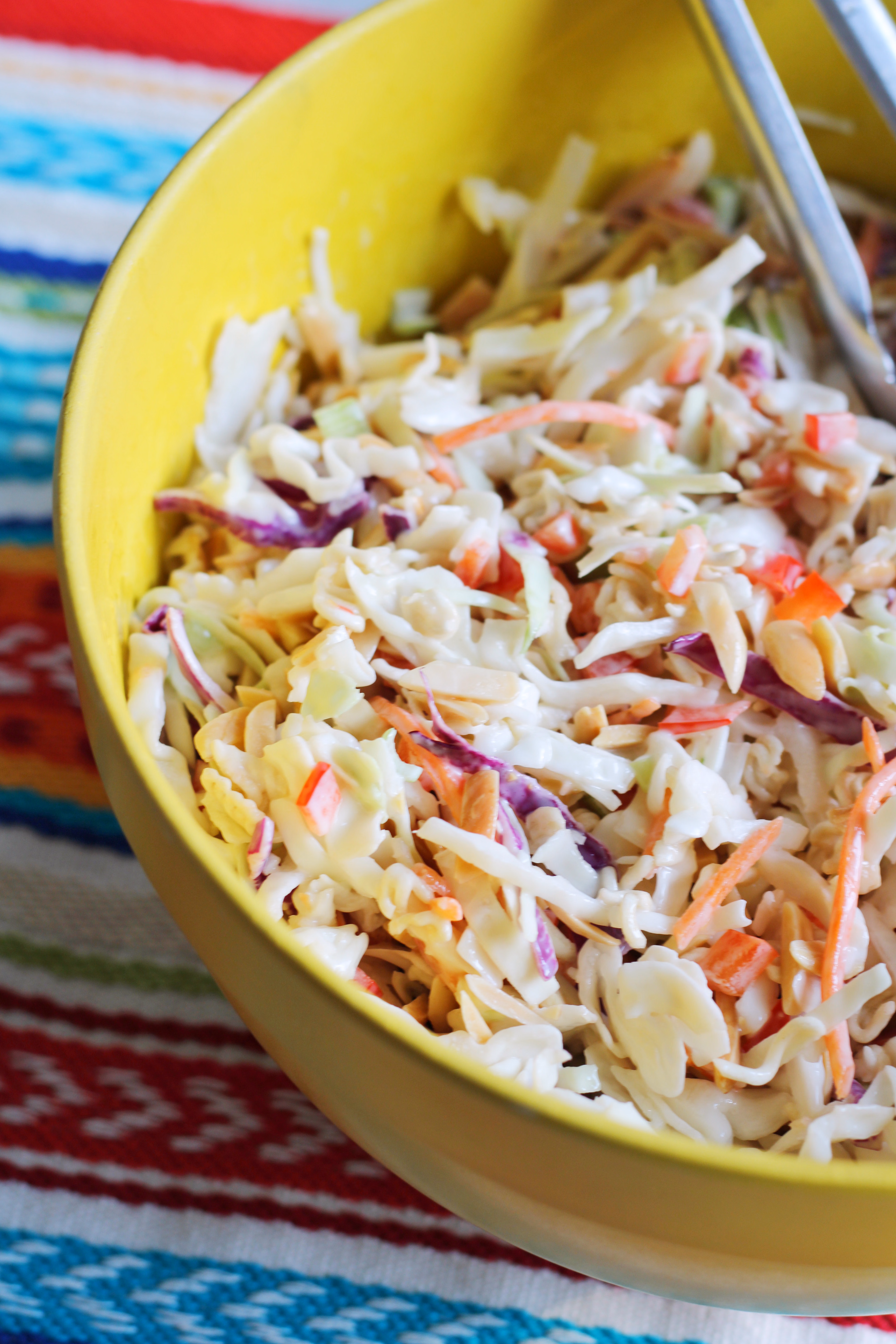 This salad recipe has been in our family for a few decades. It is my husbands very favorite salad, and luckily, is a cinch to put together! Most of the work is done for you with a good coleslaw mix. The crunch of toasted almonds and ramen noodles is what makes this special. Serve it at your next BBQ and you will be asked for the recipe!