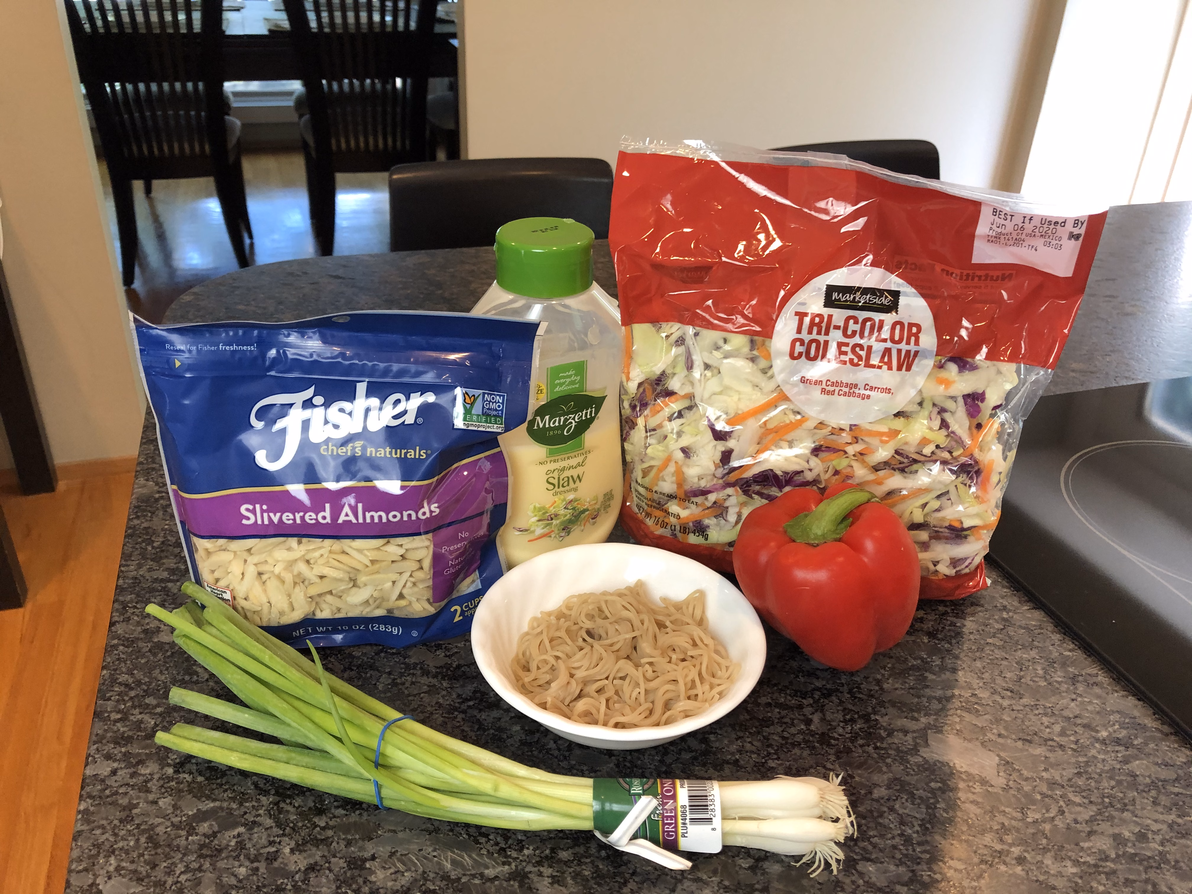 Gather your ingredients. You will need a bag of good quality coleslaw (we love the tri-color because it's so pretty, but you can choose any variety), a red pepper, slivered almonds, gluten free ramen noodles, and coleslaw dressing (Marzetti is our favorite! ).