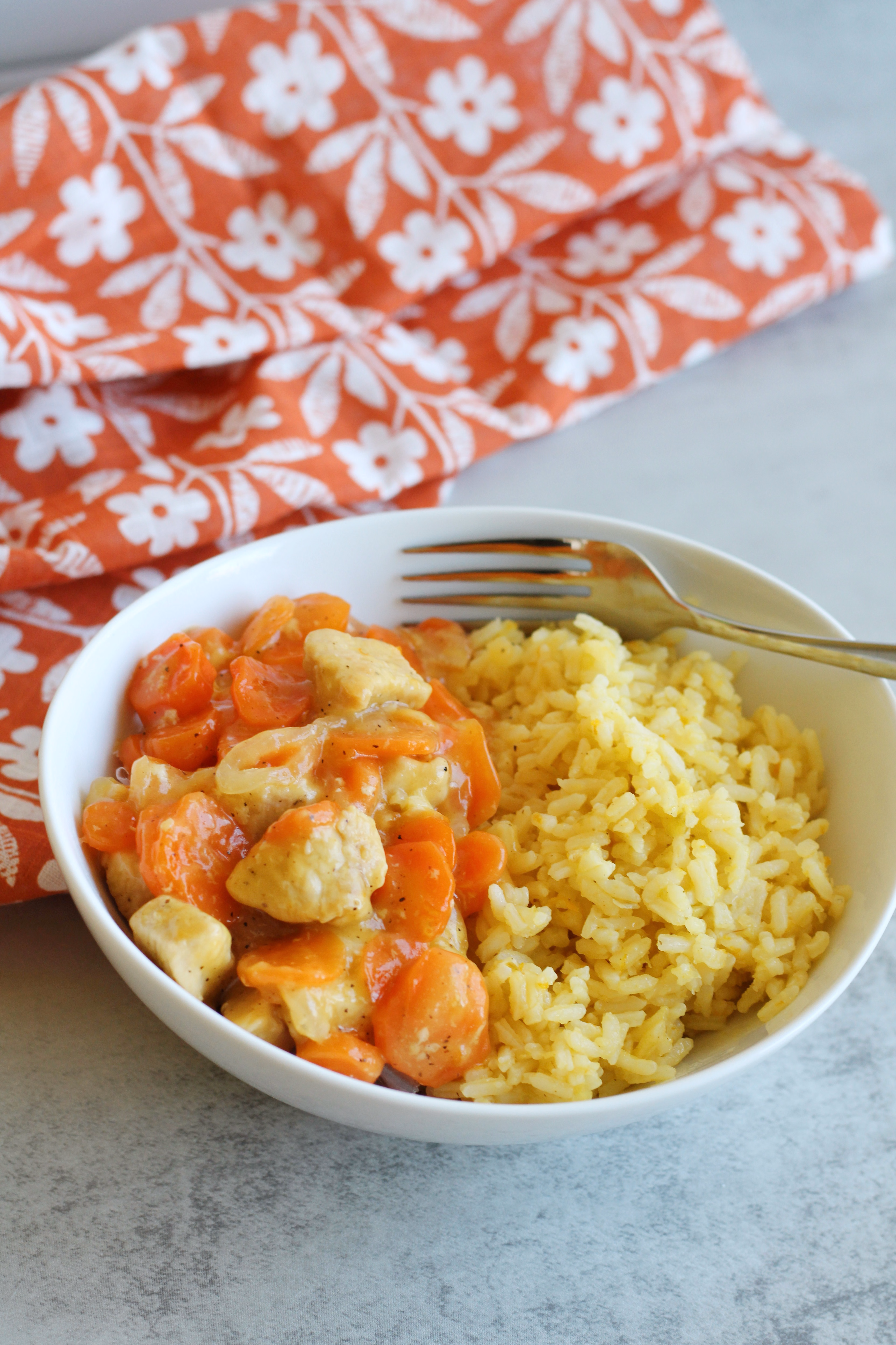 We've enjoyed this fast and easy meal for over a decade, and it always hits the spot. The chicken is combined with sweet carrots and onions in a delicious sauce. When you serve it alongside orange rice, the flavors are perfect with each other. It's a sunny and comforting meal that even the pickiest of eaters will enjoy. Yes, they may eat around the onions, but they will love them someday!