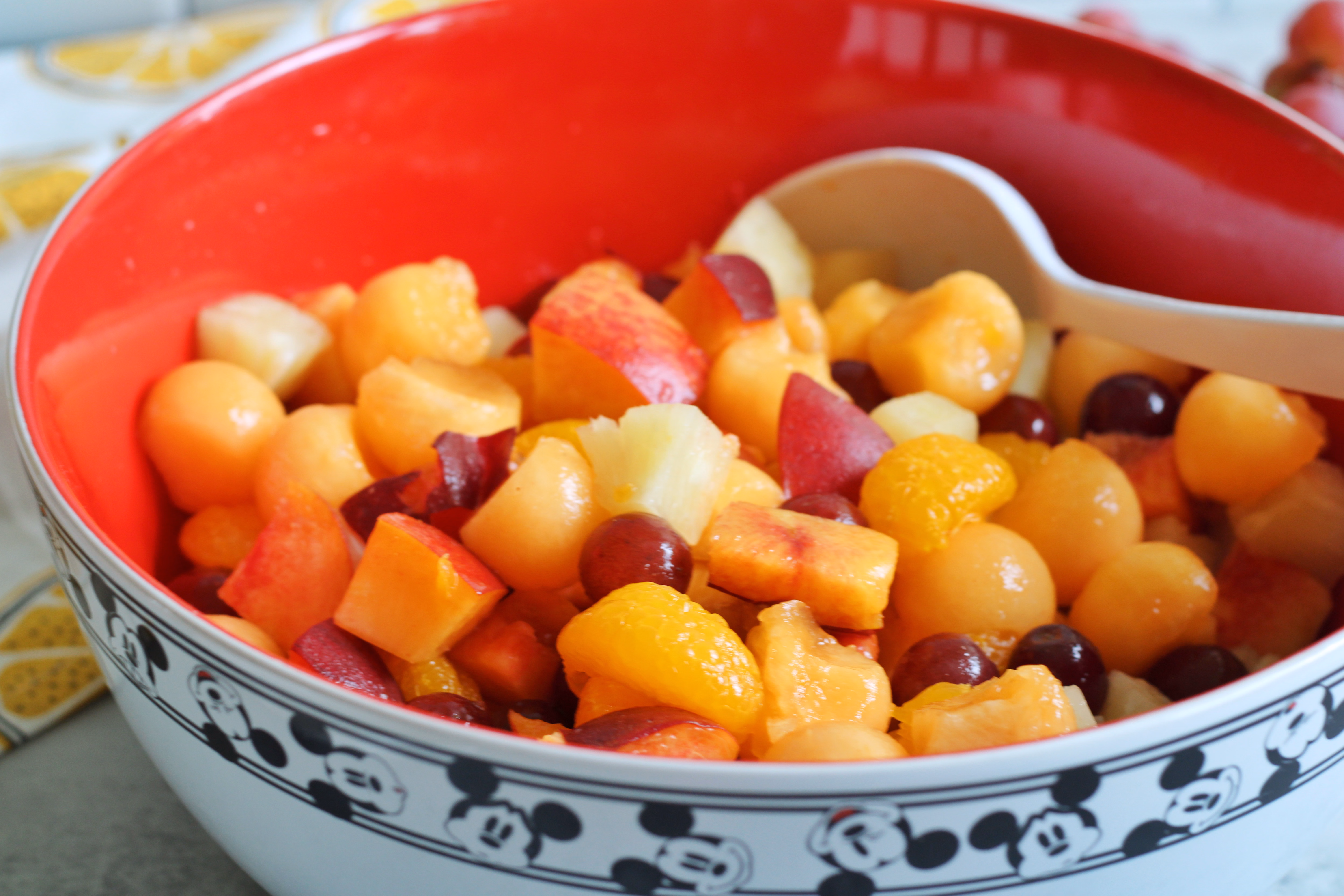 Summer and fruit salads go hand in hand, and this one is so bright and fresh! There is a simple syrup that adds just a hint of wonderful flavor, but of course, the fruit is the star! In particular, the cantaloupe! Isn't it about time cantaloupe had a chance to shine? Of course, you can mix and match your favorite fruits and come up with your own favorite combinations. Substituting canned fruit when fresh is not in season is also great. Need a new side dish for your next BBQ? Give this a try!