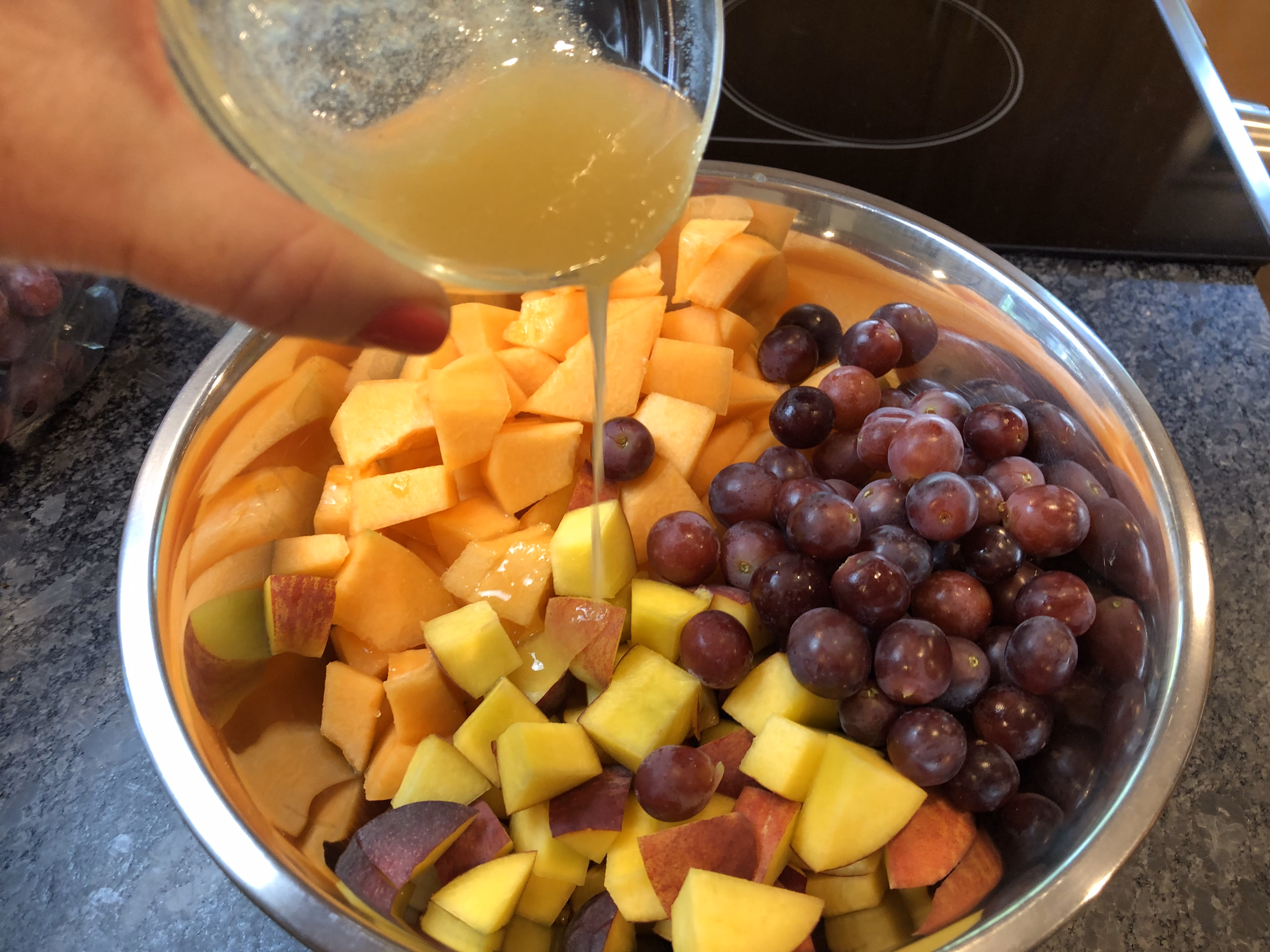 Remove seeds and peel from cantaloupe and cut into chunks or scoop with a melon baller. Cut peaches (with or without the skin.... your preference) and add all the fruit to a large mixing bowl. For the syrup, combine 2 tablespoons lime juice and 1/2 teaspoon ground ginger. Whisk in 1/4 cup honey. Pour the glaze over the fruit and toss to coat.