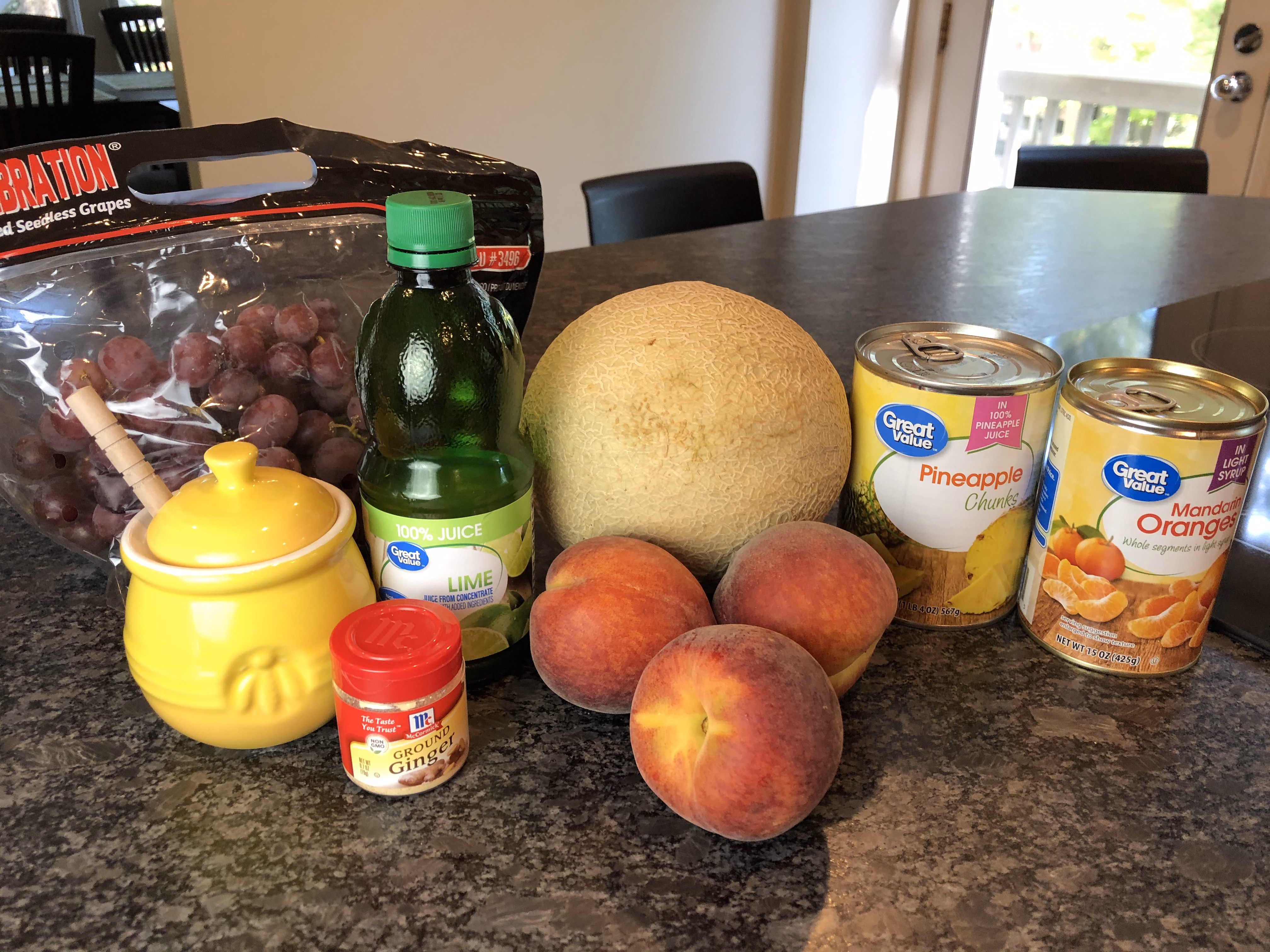 Gather your ingredients. You will need a cantaloupe, 3 peaches, grapes, canned pineapple chunks and mandarin oranges, honey, lime juice, and ground ginger.